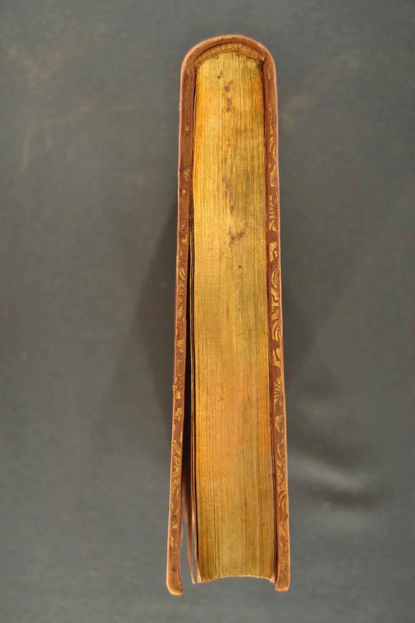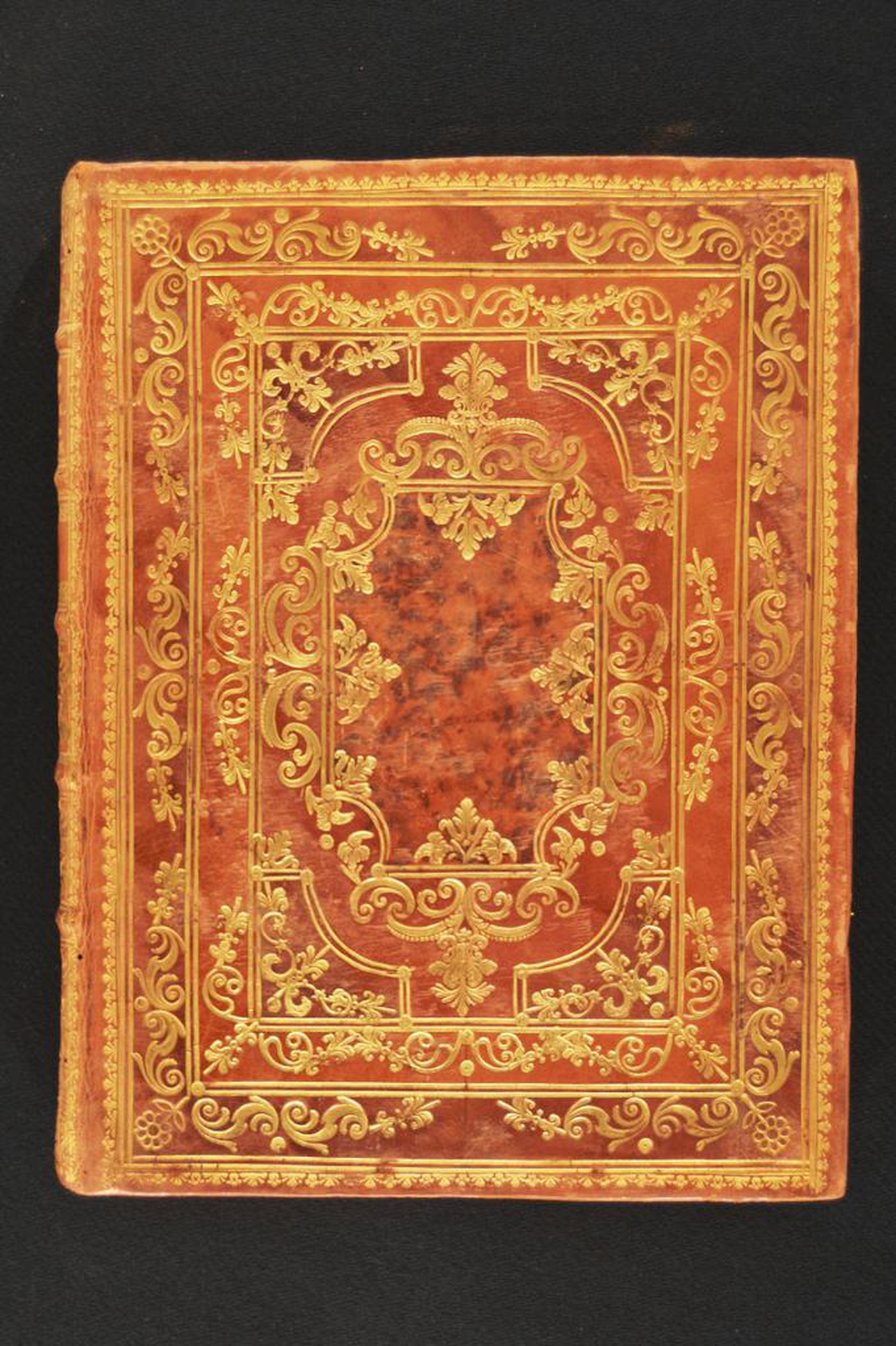 Cuoio di vitello marmorizzato marrone su quadranti in cartone decorato in oro. Cornici concentriche delimitate da due coppie di filetti concentrici caratterizzate da fiorami, corolle stilizzate, motivi in foggia di falce, fogliami caudati muti. Specchio provvisto di scompartimenti ornati con cerchielli forati, fregi sotto forma di falce, fogliami svasati, fregi cuoriformi. Scompartimenti del dorso riquadrati. Nel secondo e terzo, il titolo dell’opera, il nome dell’autore e la partizione del volume; fogliame in forma di voluta negli angoli interni e motivo cuoriforme centrale in quelli residui. Capitelli muniti di anima circolare avvolta da fili in canapa e in lino rosso. Cucitura su cinque nervi rilevati. Indorsatura non osservabile. Labbri ornati con fogliami. Rimbocchi discretamente rifilati. Carte di guardia marmorizzate policrome pettinate e bianche. Tagli dorati brillanti. Stato di conservazione: discreto - buono. Marginali spellature al materiale di copertura.