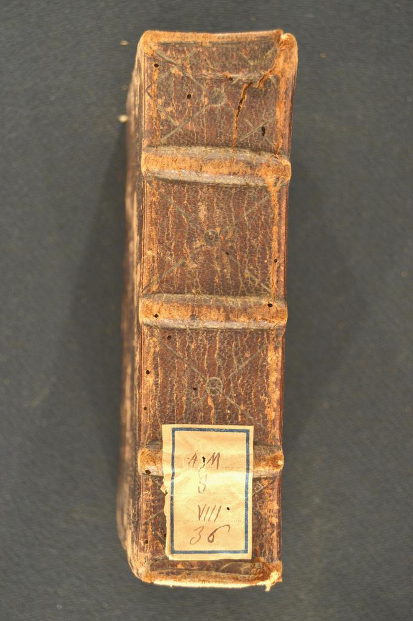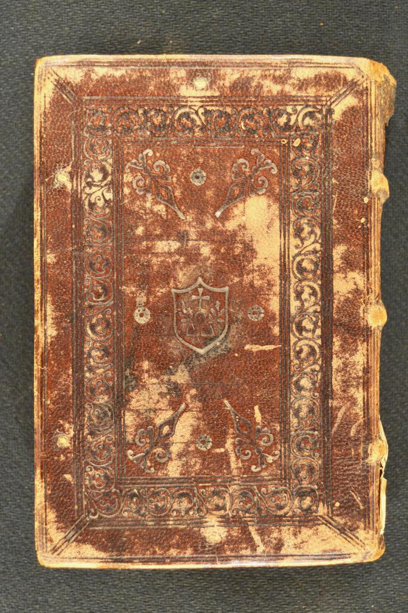 Cuoio di capra bruno su quadranti in cartone decorato a secco. Tre fasci di filetti concentrici collegati negli angoli. Cornice caratterizzata da volute fogliate. Ampio giglio negli angoli interni e cartella ornata con trimonzio e due rami fronzuti entro quattro rosette su sfondo circolare. Capitelli muniti di anima circolare avvolta da fili in canapa. Scompartimenti del dorso provvisti di coppia di filetti incrociati centrati da cerchiello. Cucitura su tre nervi rilevati. Indorsatura realizzata tramite alette orizzontali membranacee o cartacee. Rimbocchi rifilati senza particolare cura. Carta di guardia posteriore bianca. Tagli rustici; il nome dell’autore manoscritto al piede. Stato di conservazione: mediocre - discreto. Diffuse spellature al materiale di copertura. Supporto in vista al piatto anteriore. Angoli ricurvi.