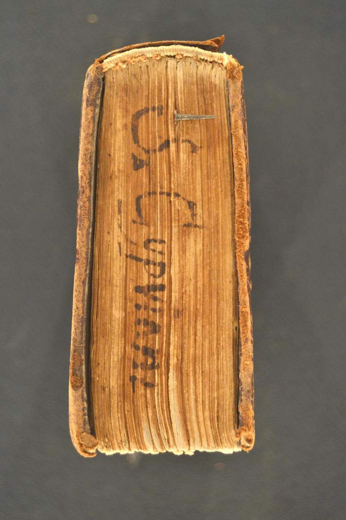 I fregi e le note tipografiche propongono di assegnare la legatura al secondo quarto del XVI secolo, eseguita a Bologna dal legatore di S. Petronio attivo tra il 1522 circa e il 1551 del quale questa Istituzione custodisce alcuni esemplari. Molti dei suoi lavori riguardano registri d’archivio e anche a libri a stampa; si tratta verosimilmente di un cartolaio. Utilizza i viticci frondosi per disegnare cornici a forma di losanga che tavolta includono il titolo, più frequentemente Cupido oppure un braciere munite di lingue di fuoco, il busto di un poeta e di un imperatore coronato d’alloro, più infrequentemente raffigurante il martire. In evidenza il taglio manoscritto al piede, ad evidenziare la collocazione a piatto del volume nella teca.