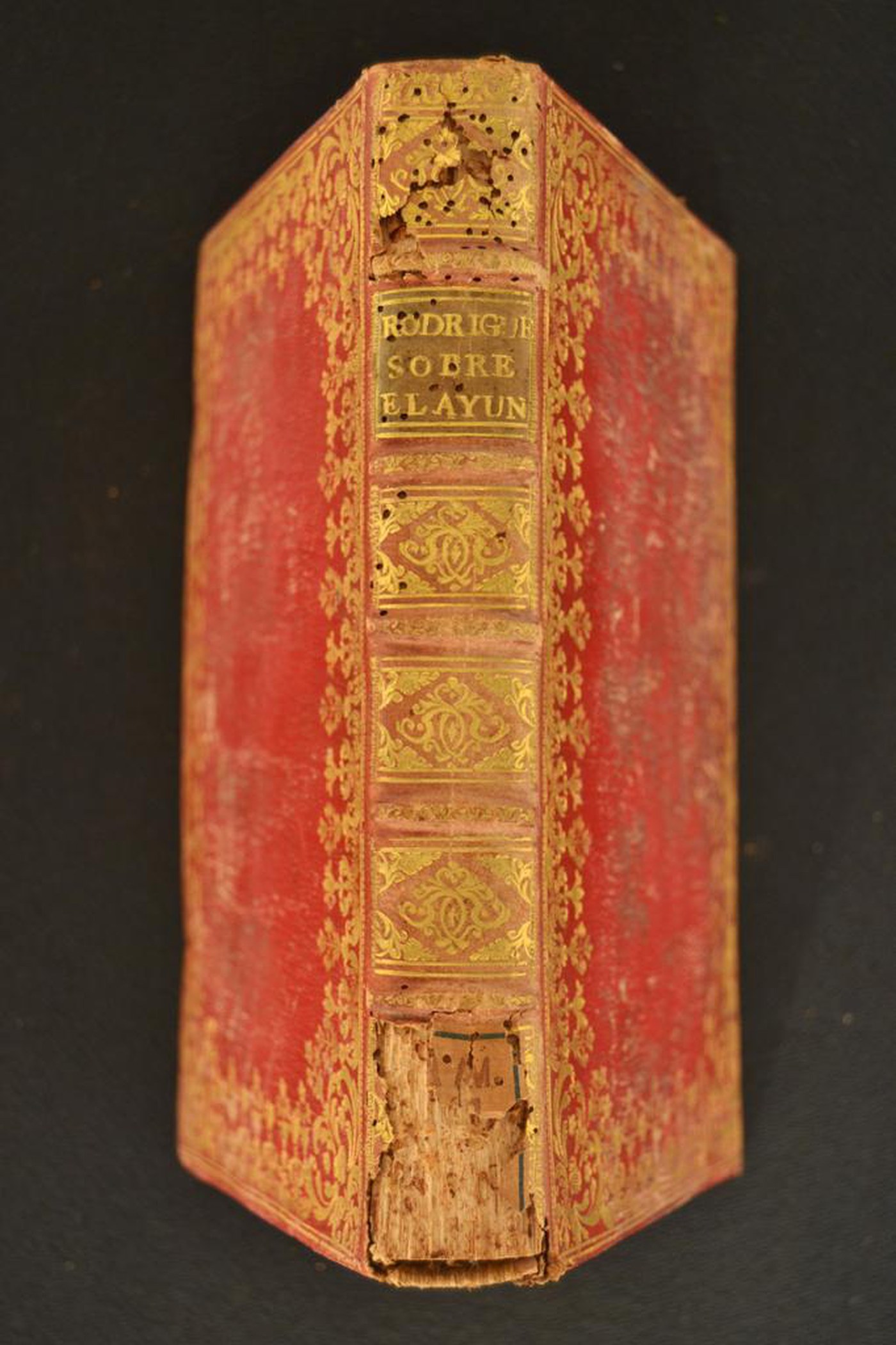 L’impianto ornamentale, i fregi e le note tipografiche consentono di assegnare la legatura alla metà del XVIII secolo, eseguita a Madrid da Antonio de Sancha vissuto tra il 1720 e il 1790 del quale questa Istituzione custodisce alcuni esemplari. In evidenza le carte di guardia marmorizzate policrome pettinate e i tagli dorati brillanti incisi.