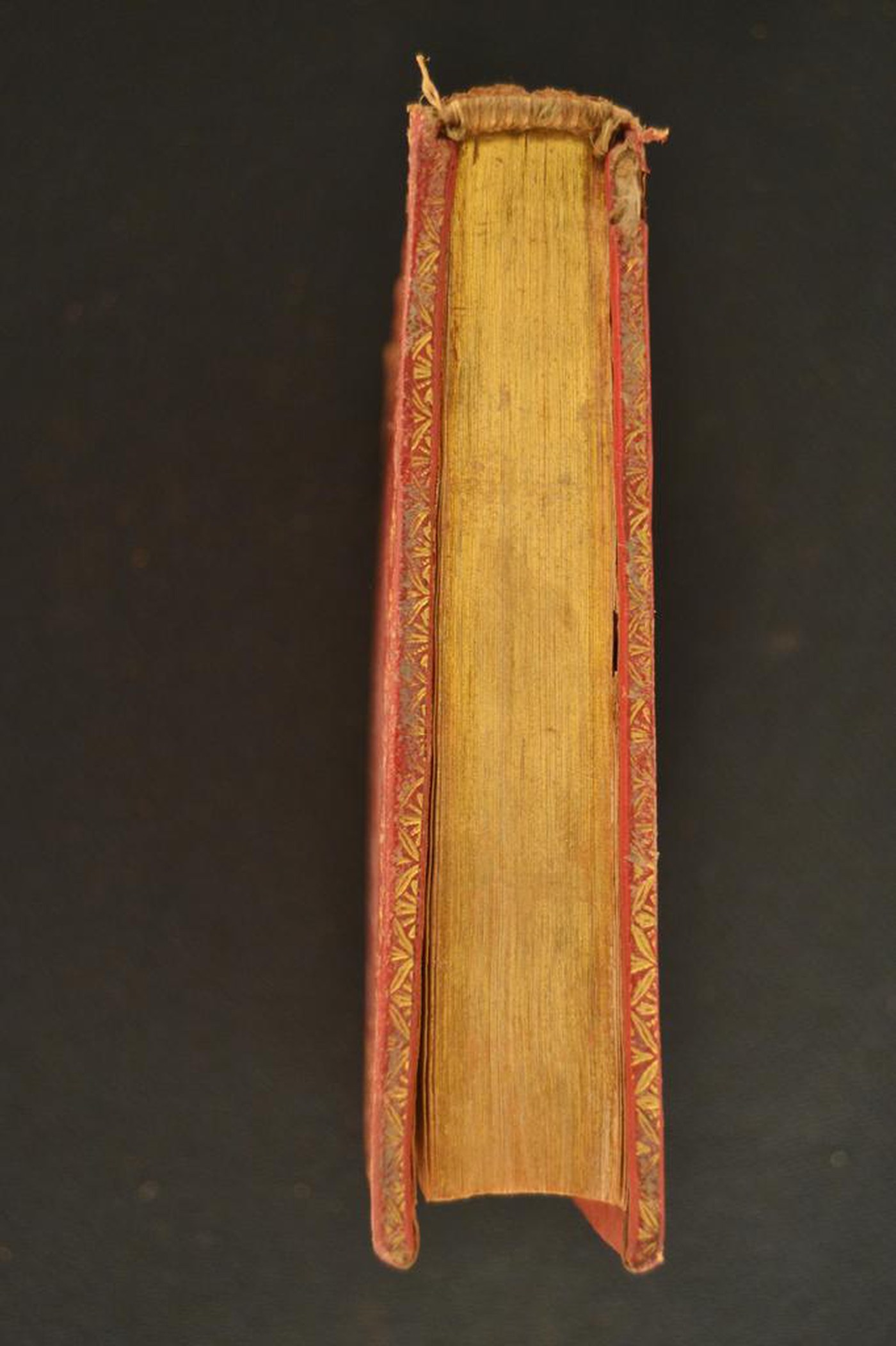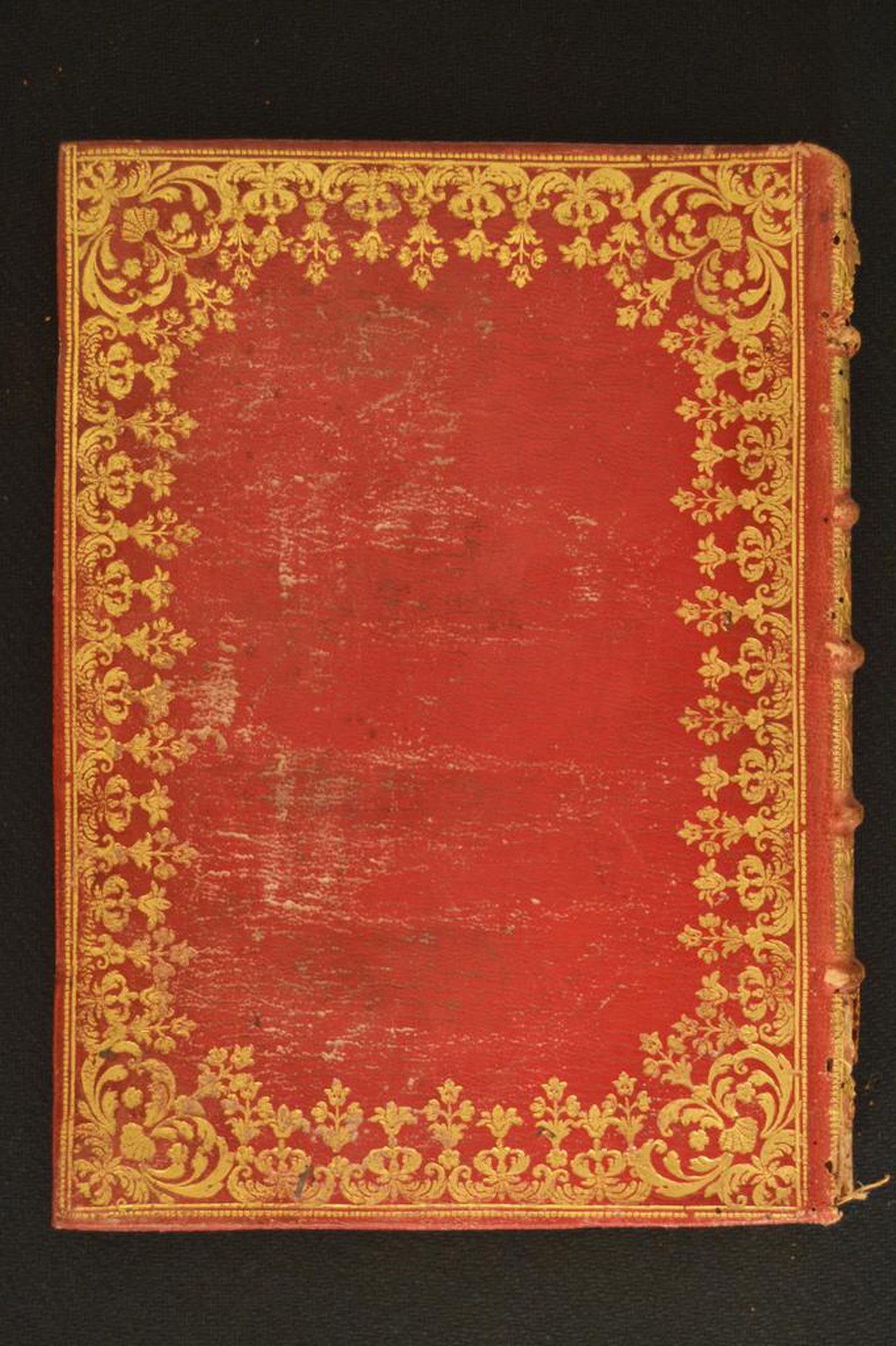 Cuoio di capra rosso su quadranti in cartone rosso decorato in oro. Cornice a filetto filigranato e continuo. Margini interni dello specchio provvisti di coppie di fogliami arcuati sormontati da corolle stilizzate e fiorami. Scompartimenti del dorso riquadrati. Nel secondo, il cognome dell’autore e il titolo dell’opera entro il tassello in corame verde oliva; fogliami negli angoli interni e fregio fitomorfo centrale su sfondo quadrangolare in quelli residui. Capitelli muniti di anima circolare avvolta da fili in canapa e in seta rosa (tracce). Cucitura su cinque nervi rilevati. Indorsatura realizzata tramite alette orizzontali cartacee. Labbri ornati a pizzo. Rimbocchi discretamente rifilati. Carte di guardia marmorizzate policrome pettinate e bianche. Tagli dorati brillanti incisi. Stato di conservazione: mediocre. Spellature e bruniture al materiale di copertura parzialmente scomparso in testa e al piede del dorso dalla tonalità scolorita.
