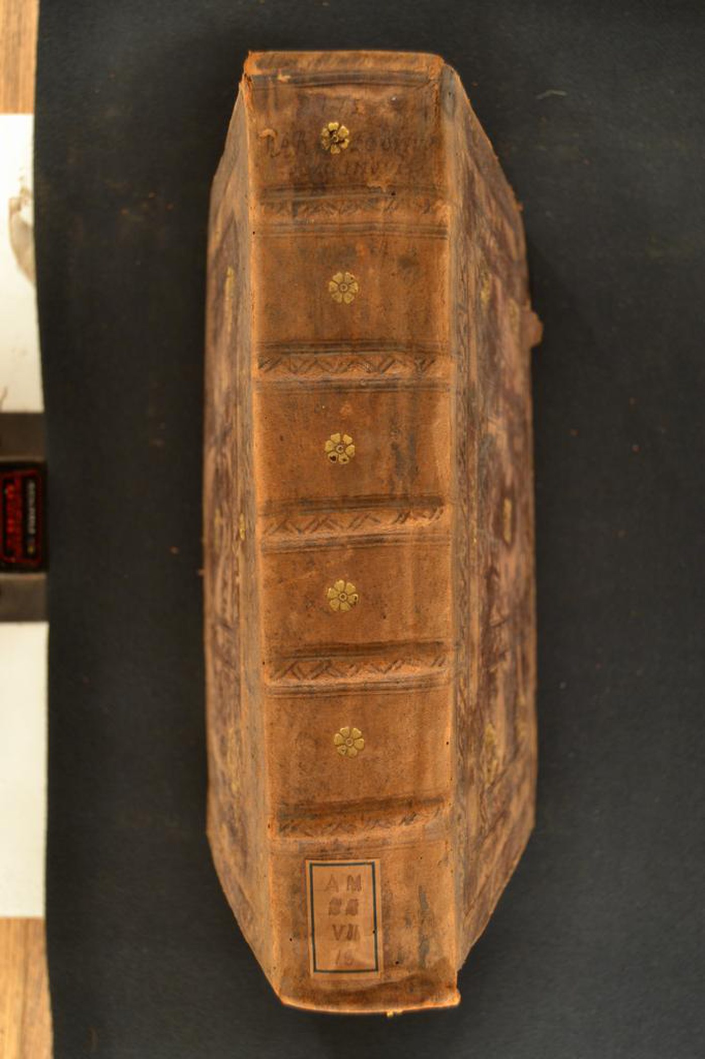 I fregi e le note tipografiche consentono di attribuire la legatura alla fine del XVI – inizio XVII secolo, eseguita in Spagna. In evidenza i tagli rossi.