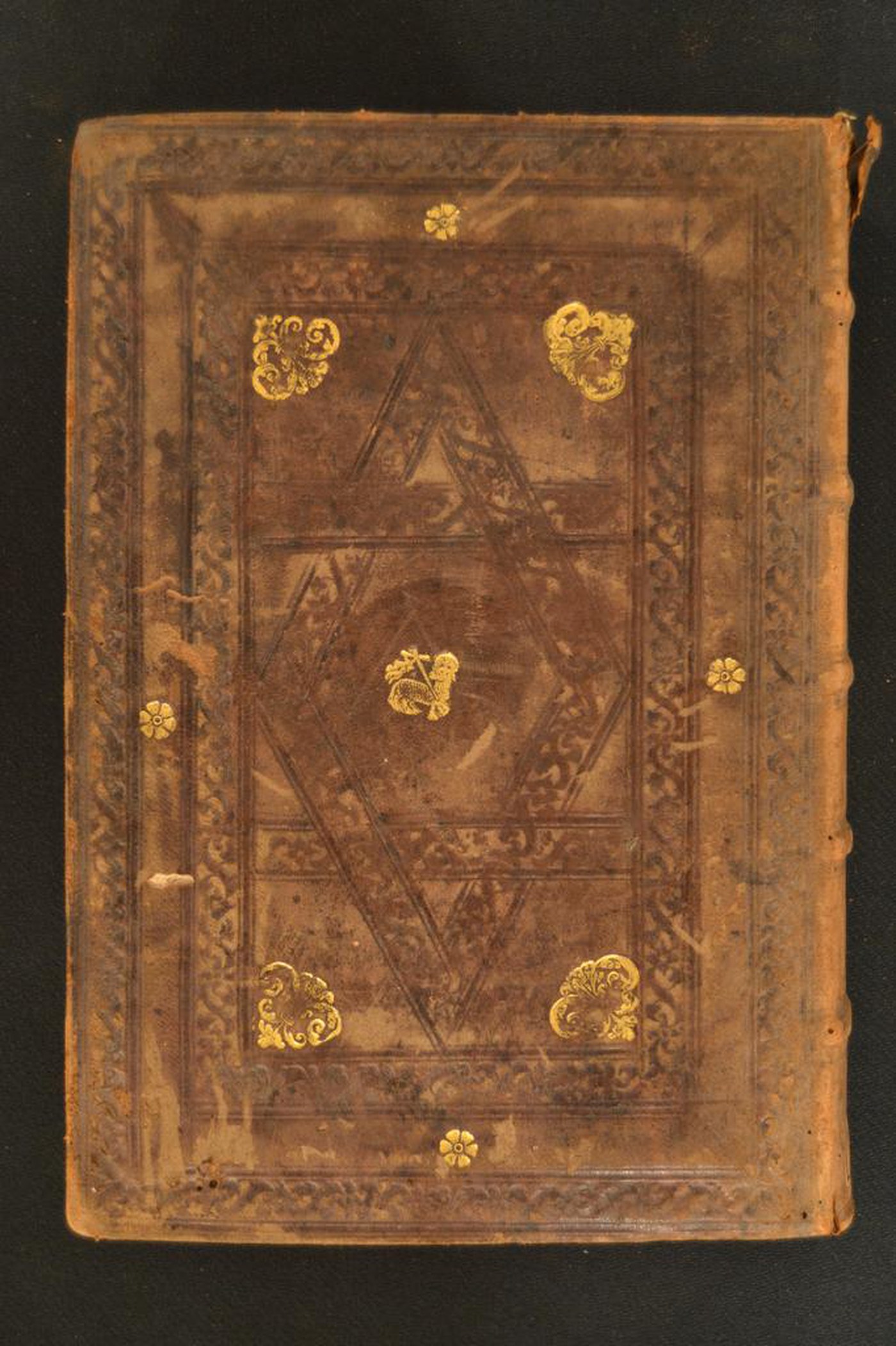 Cuoio di bazzana marrone su quadranti in cartone decorato a secco e in oro. Coppia di cornici concentriche e ampia losanga caratterizzate da fiorami entro nastri. Le rosette esalobate, pure presenti negli scompartimenti del dorso, e i fregi fitomorfi accantonati delimitano l’agnello crucifero centrale. Capitelli muniti di anima circolare avvolta da fili in seta bianca e rossa. Cucitura su cinque nervi rilevati. Rimbocchi rifilati senza particolare cura. Carte di guardia bianche. Tagli rustici. Stato di conservazione: mediocre - discreto. Angoli ricurvi. Fiore in parte assente; materiale di copertura spellato.