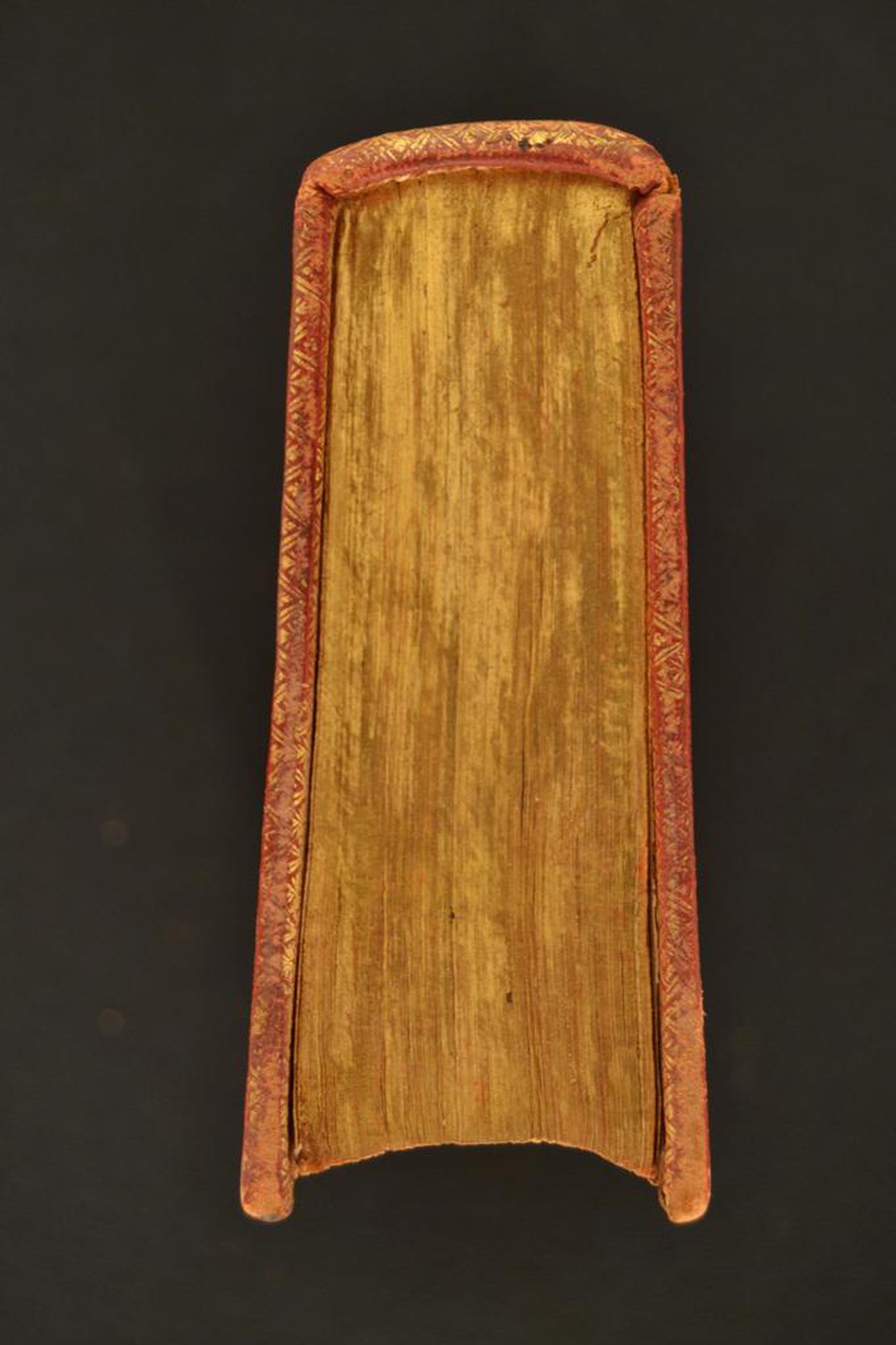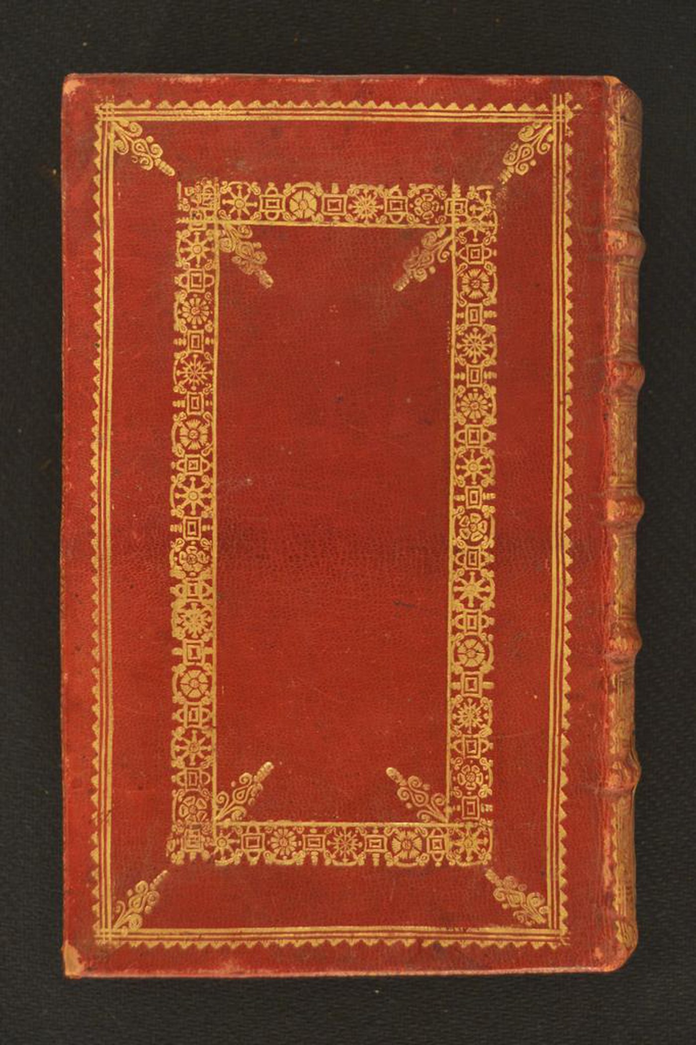 Cuoio di capra rosso su quadranti in cartone decorato in oro. Coppia di cornici concentriche caratterizzate da monticelli, tre filetti e motivi gemmati. Margini interni provvisti di corolle stilizzate. Scompartimenti del dorso riquadrati. Nel secondo e terzo, il titolo dell’opera, il cognome dell’autore e la partizione del volume; volute fogliate negli angoli interni e fregio fitomorfo centrale in quelli residui. Capitelli muniti di anima circolare avvolta da fili in seta rosa e bianca. Cucitura su cinque nervi rilevati. Indorsatura realizzata tramite alette orizzontali cartacee. Labbri ornati a pizzo. Rimbocchi discretamente rifilati. Carte di guardia marmorizzate policrome pettinate bianche. Tagli dorati brillanti. Stato di conservazione: discreto - buono. Marginali gore brune e spellature al materiale di copertura dalla tonalità scolorita lungo il dorso.