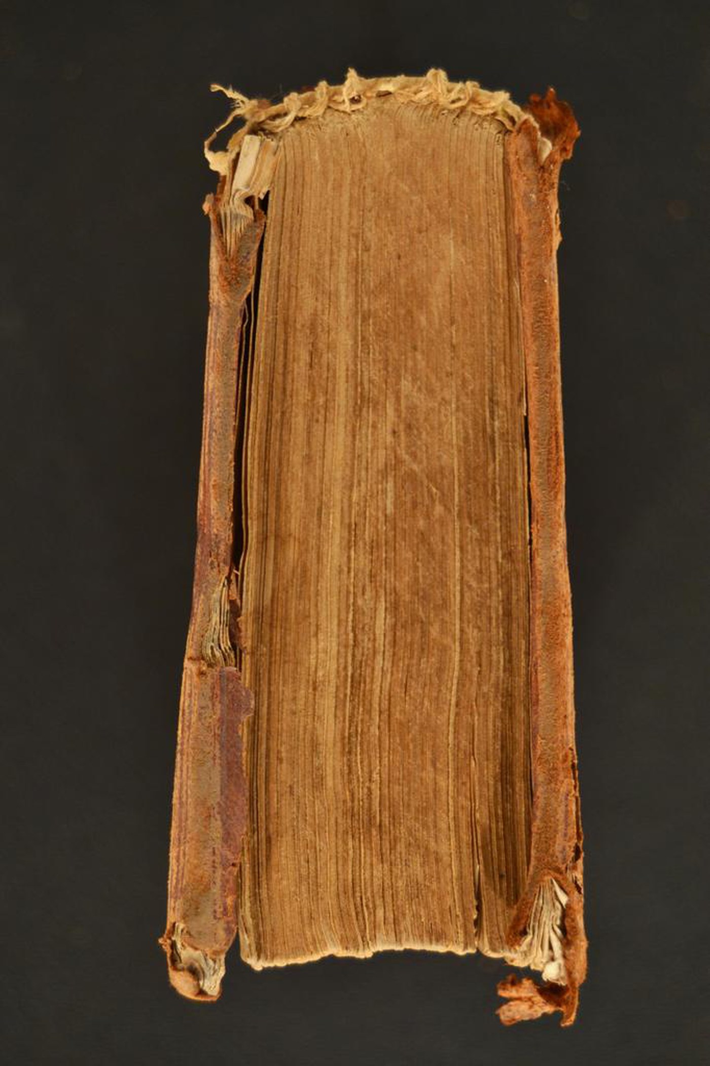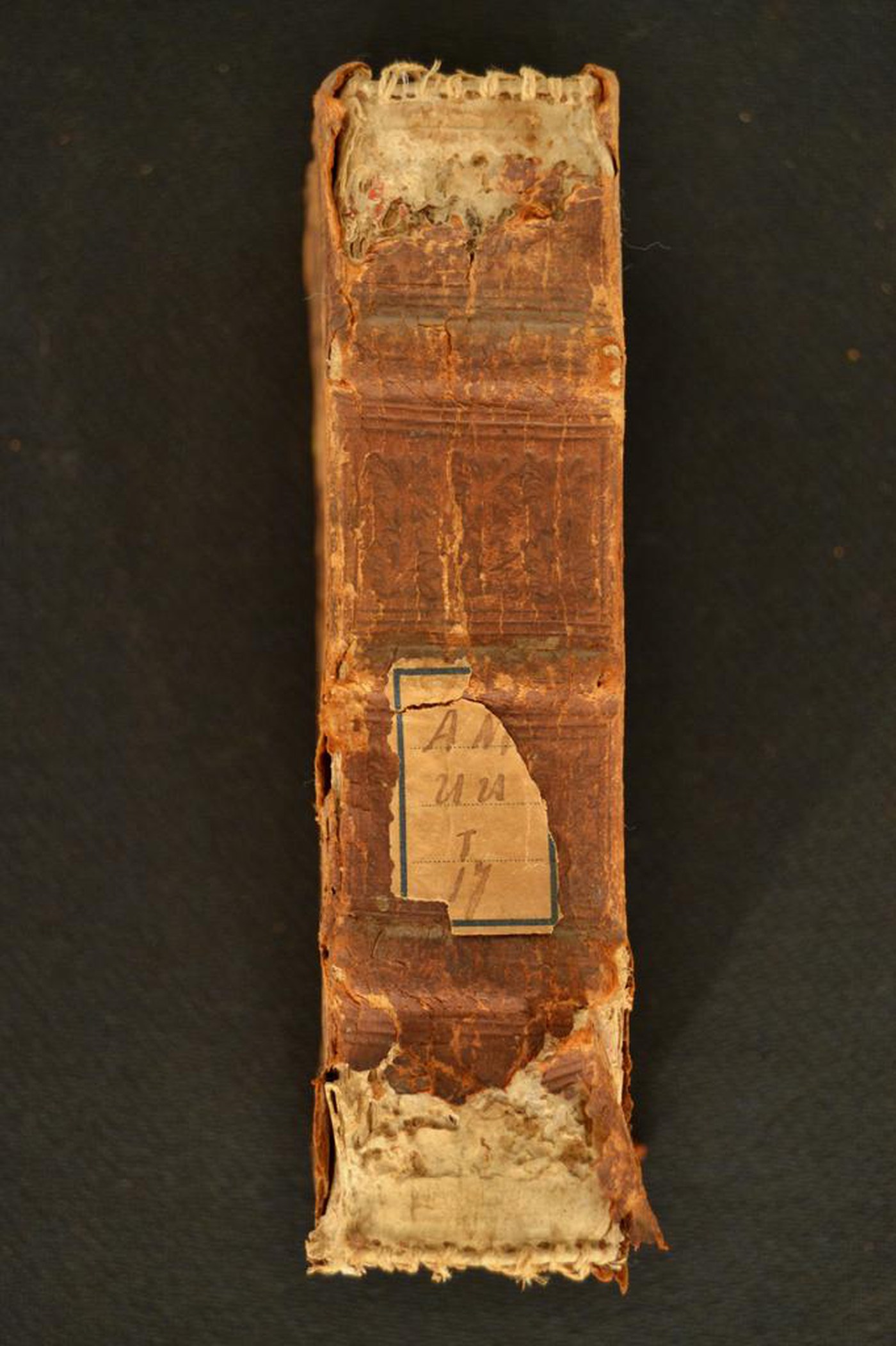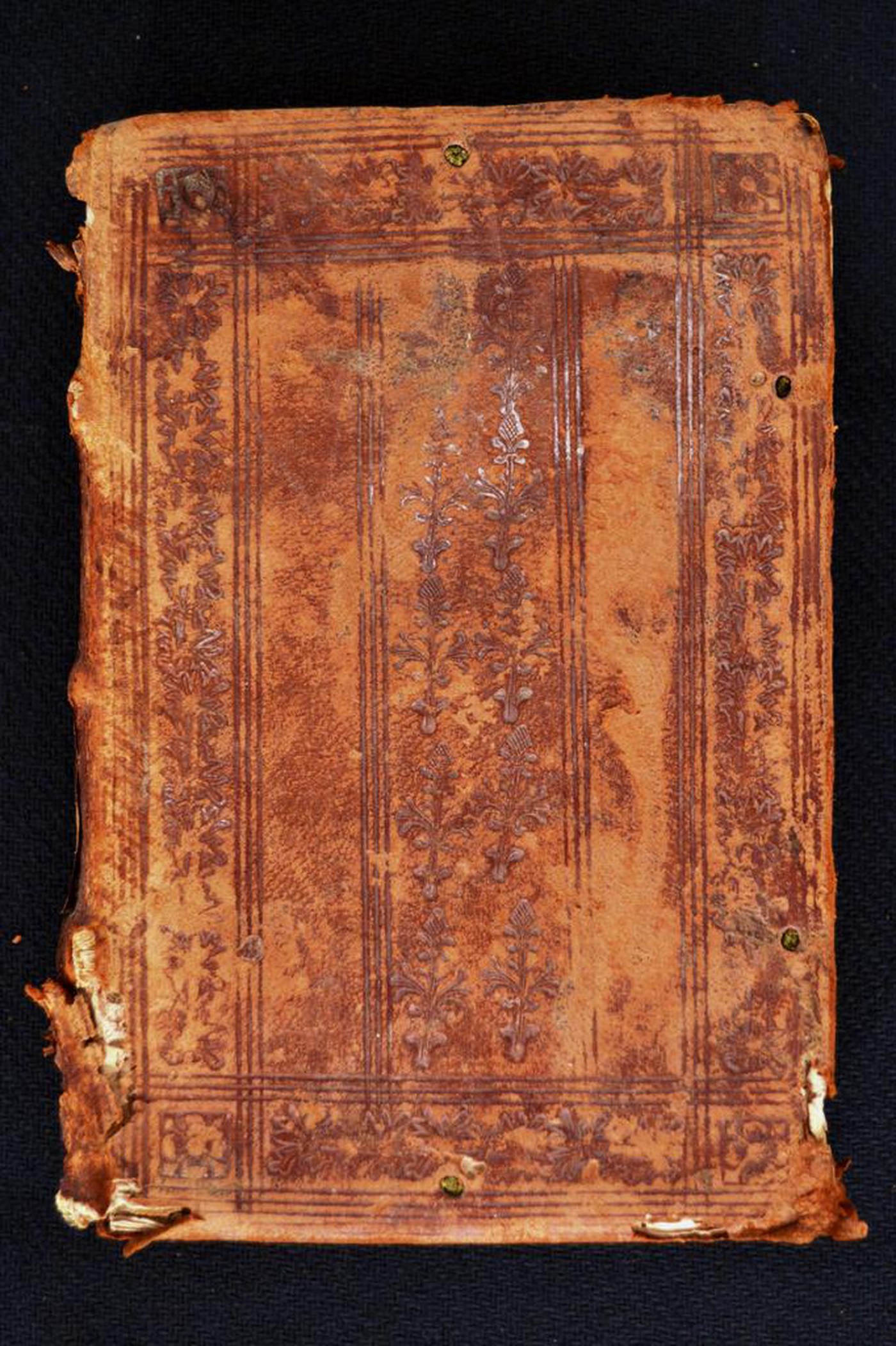 Cuoio di bazzana marrone su quadranti in cartone decorato a secco. Fasci di filetti. Cornice e specchio caratterizzati da motivi fitomorfi. Tracce di quattro coppie di lacci in tessuto verde. Capitelli muniti di anima circolare avvolti da fili in canapa e da residui in seta rosa. Cucitura su tre nervi in pelle allumata. Indorsatura realizzata tramite alette orizzontali membranacee o cartacee. Rimbocchi rifilai senza particolare cura. Carta di guardia posteriore bianca. Tagli rustici; il cognome dell’autore e il titolo dell’opera in testa a quello di resta di gola. Stato di conservazione: mediocre. Materiale in parte scomparso in testa e al piede del dorso. Fiore parzialmente scomparso. Supporti stanchi, parzialmente scomparsi in testa e al piede. Angoli ricurvi.