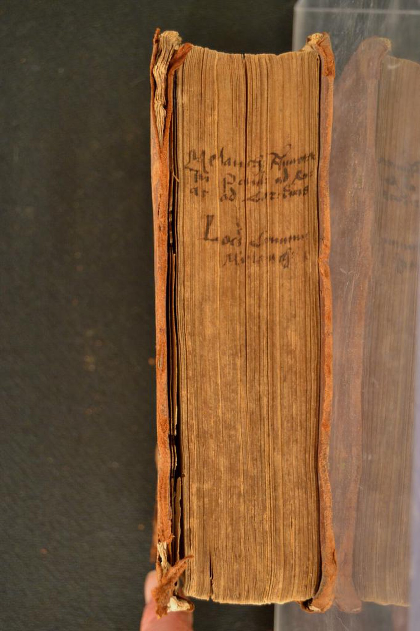 Il genere di manufatto, i fregi e le note tipografiche inducono ad assegnare la legatura alla prima metà del XVI secolo, eseguita in area tedesca. In evidenza gli estremi dell’opera in testa al taglio di gola conformemente alle usanze in area nordica, i tagli rustici e il frontespizio illustrato.