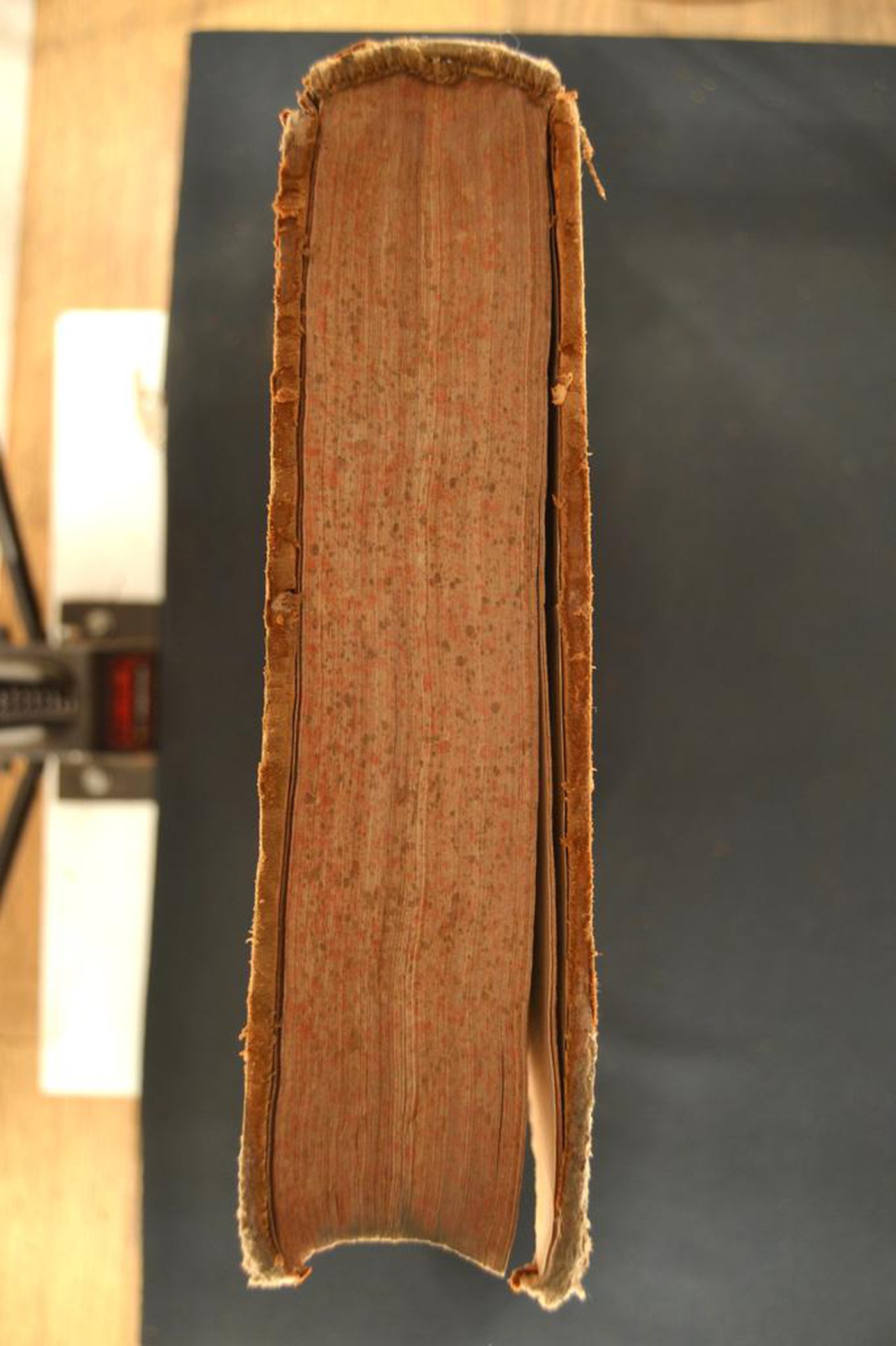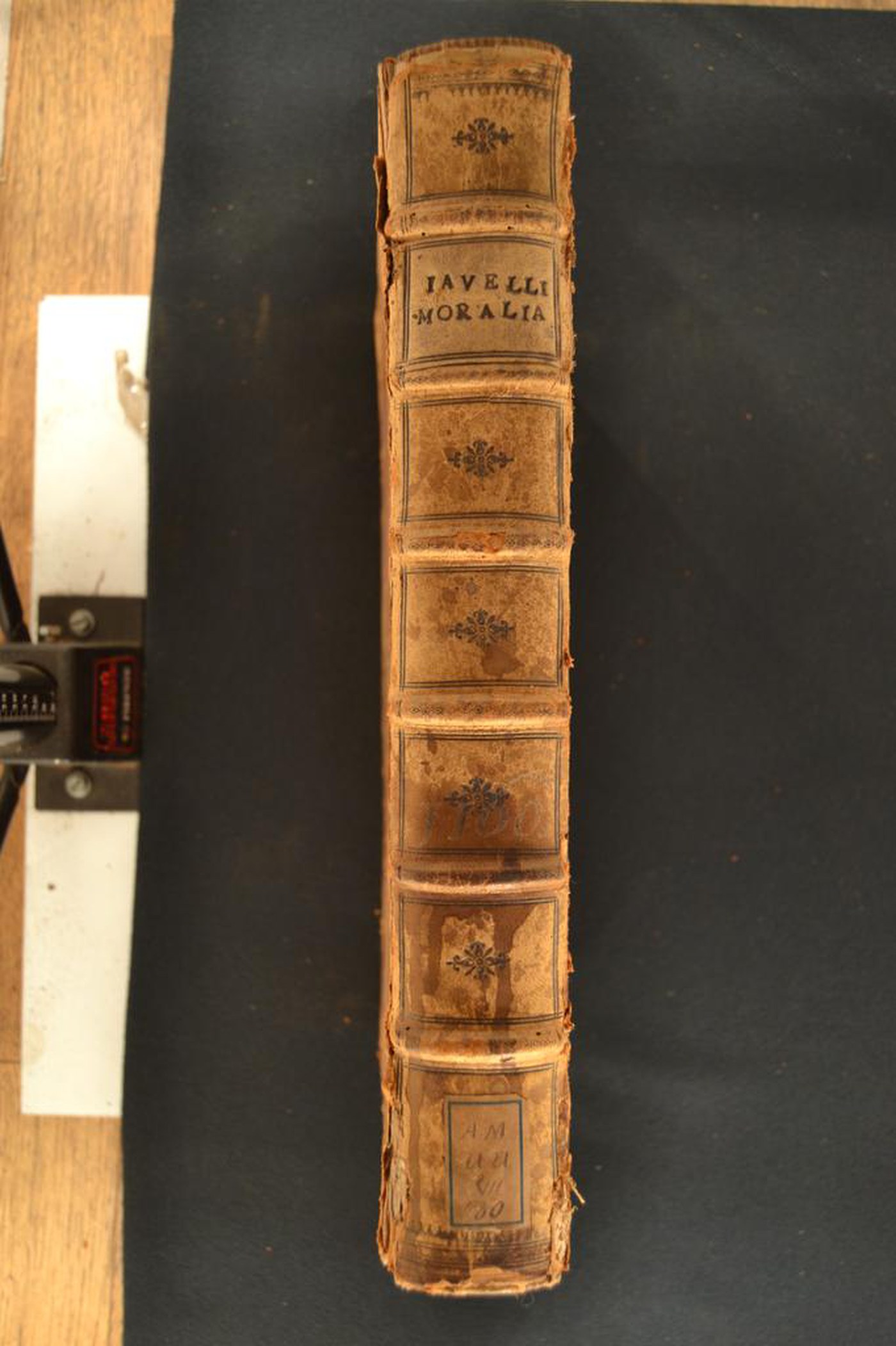 I fregi, l’indorsatura realizzata tramite aletta in foggia di trapezio e le note tipografiche consentono di assegnare la legatura al terzo quarto del XVII secolo, eseguita in Francia. In evidenza i tagli rustici e l’ex libris.