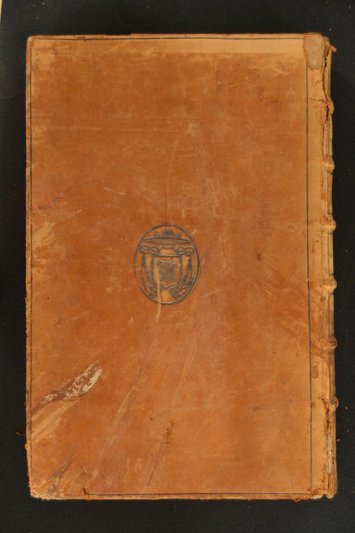 Cuoio di bazzana marrone su quadranti in cartone decorato in lega d’oro. Cornice a filetto. Armi (60x50 mm) prelatizie. Scompartimenti del dorso riquadrati. Nel secondo, il cognome dell’autore e il titolo dell’opera; quattro corolle stilizzate addossate alternate a punte in quelli residui. Capitelli muniti di anima circolare avvolta da fili in canapa. Cucitura su sei nervi rilevati. Indorsatura realizzata tramite aletta cartacea a trapezio. Labbri muti. Rimbocchi rifilati senza particolare cura. Carte di guardia bianche. Tagli rustici, spruzzati in rosso e in verde. Stato di conservazione: mediocre. Gore brune al materiale di copertura, parzialmente scomparso. Piatti in fase distacco.