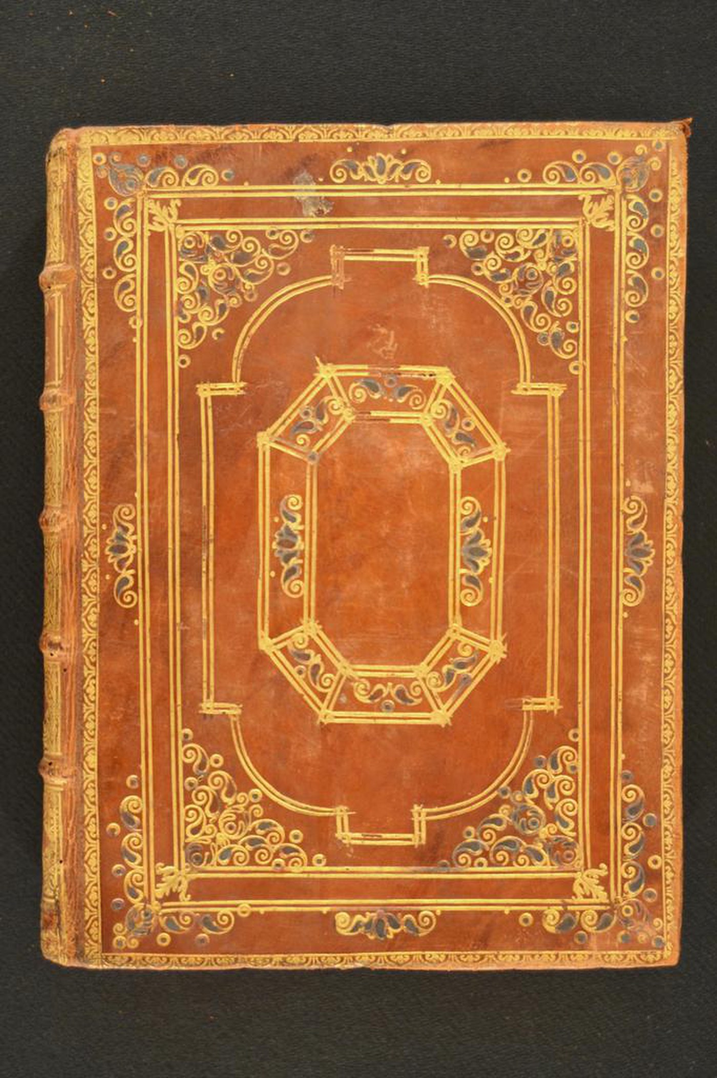 Cuoio di vitello marrone su quadranti decorato in oro e in pasta blu. Filetti concentrici. Cornici caratterizzate da fogliami trilobati alternati a corolle stilizzate, volute caudate riprese nella carrella centrale muta, anfore panciute, cerchielli forati. Scompartimenti del dorso riquadrati. Nel secondo, il cognome dell’autore e il titolo dell’opera; volute caudate negli angoli interni e fregio fitomorfo centrale su sfondo losangato. Capitelli muniti di anima circolare avvolta da fili in canapa. Cucitura su cinque nervi rilevati. Indorsatura realizzata tramite alette orizzontali cartacee. Rimbocchi discretamente rifilati. Contropiatti rivestiti da foglio di carta marmorizzata policroma pettinata. Carte di guardia bianche. Tagli dorati brillanti incisi. Stato di conservazione: discreto. Marginali spellature al materiale di copertura.
