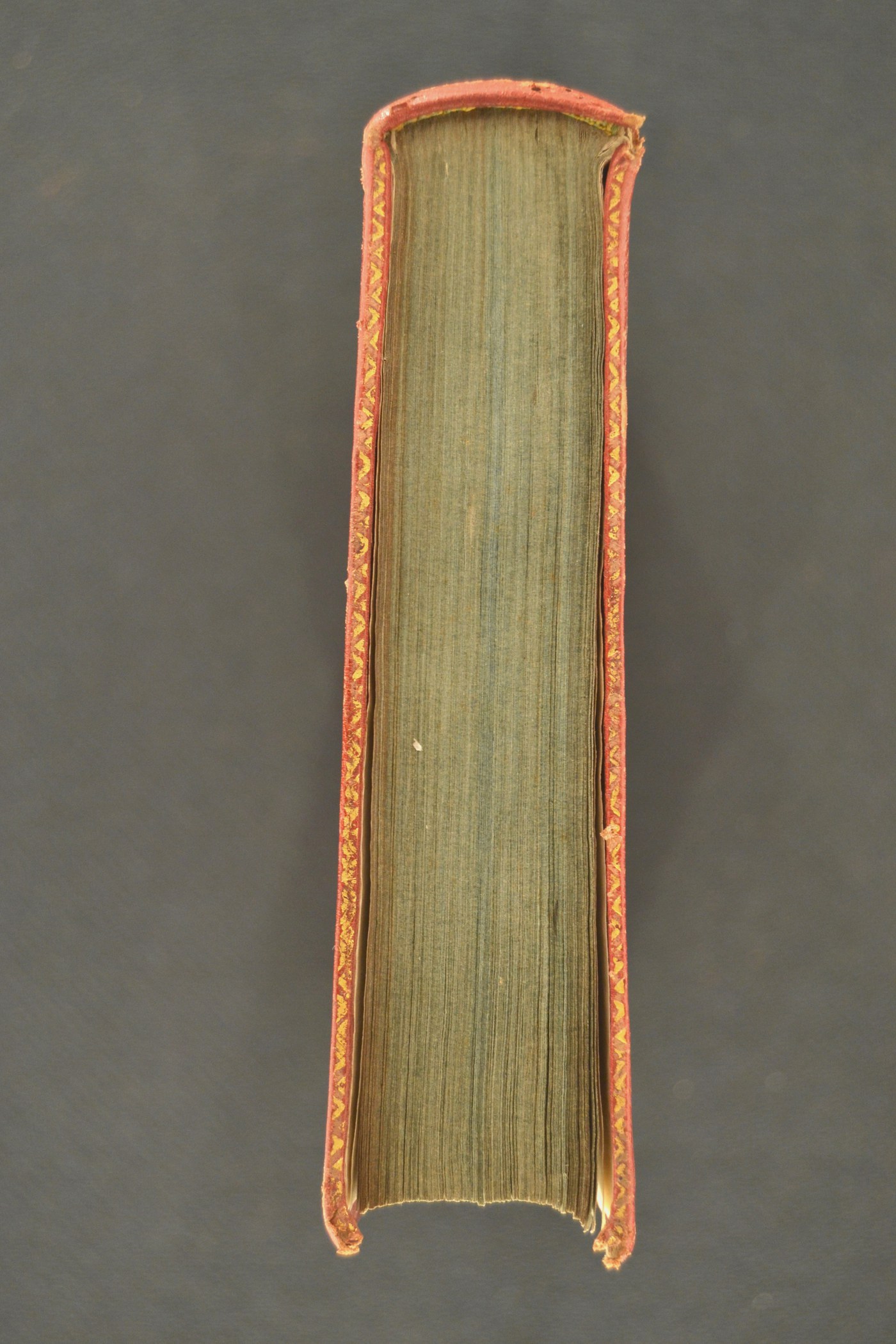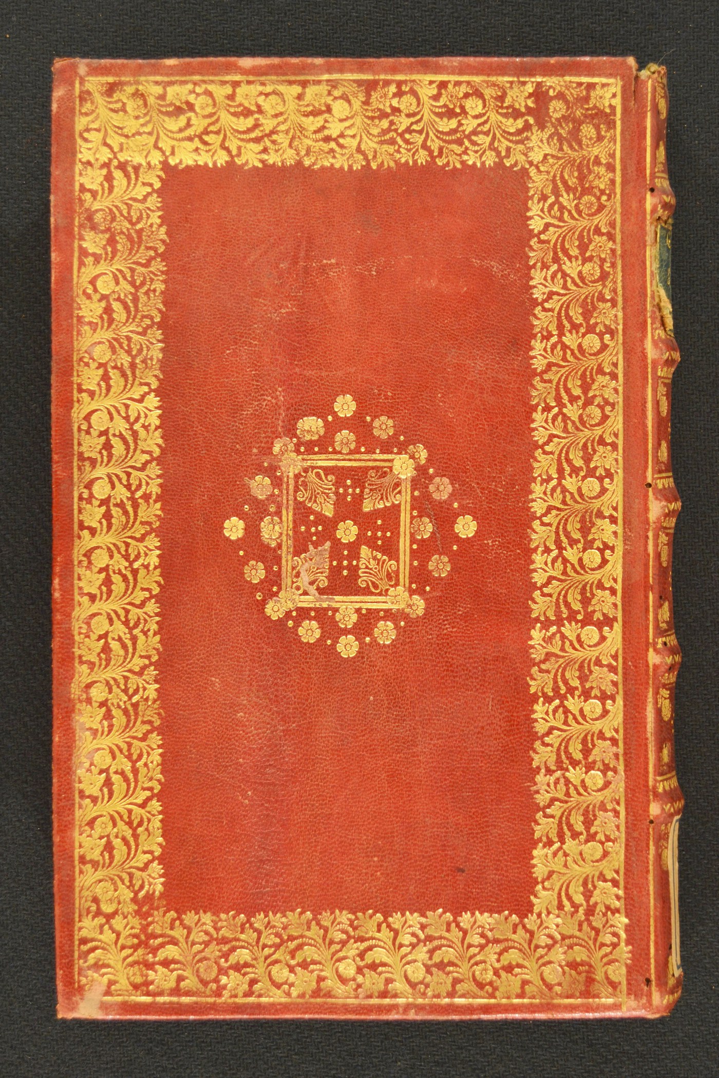 Cuoio di capra rosso su quadranti in cartone decorato in oro. Cornice realizzata tramite un filetto. Margine interno dello specchio caratterizzato da fogliami anche filigranati mossi; cartella centrale costituita da rosette, cerchielli pieni, quadrangoli e quattro fogliami muti affrontati. Capitelli costituiti da fili in seta verde e bianca intrecciati. Scompartimenti del dorso riquadrati. Nel secondo, il cognome dell’autore e il titolo dell’opera entro corame verde; testina fitomorfa negli angoli interni e fiorame centrale in quelli residui. Cucitura su cinque nervi rilevati. Indorsatura non osservabile. Labbri ornati con punte. Rimbocchi rifilati senza particolare cura. Carte di guardia silografate a raffigurare quadrangoli rossi e bianche. Tagli blu. Stato di conservazione: discreto. Spellature al materiale di copertura.