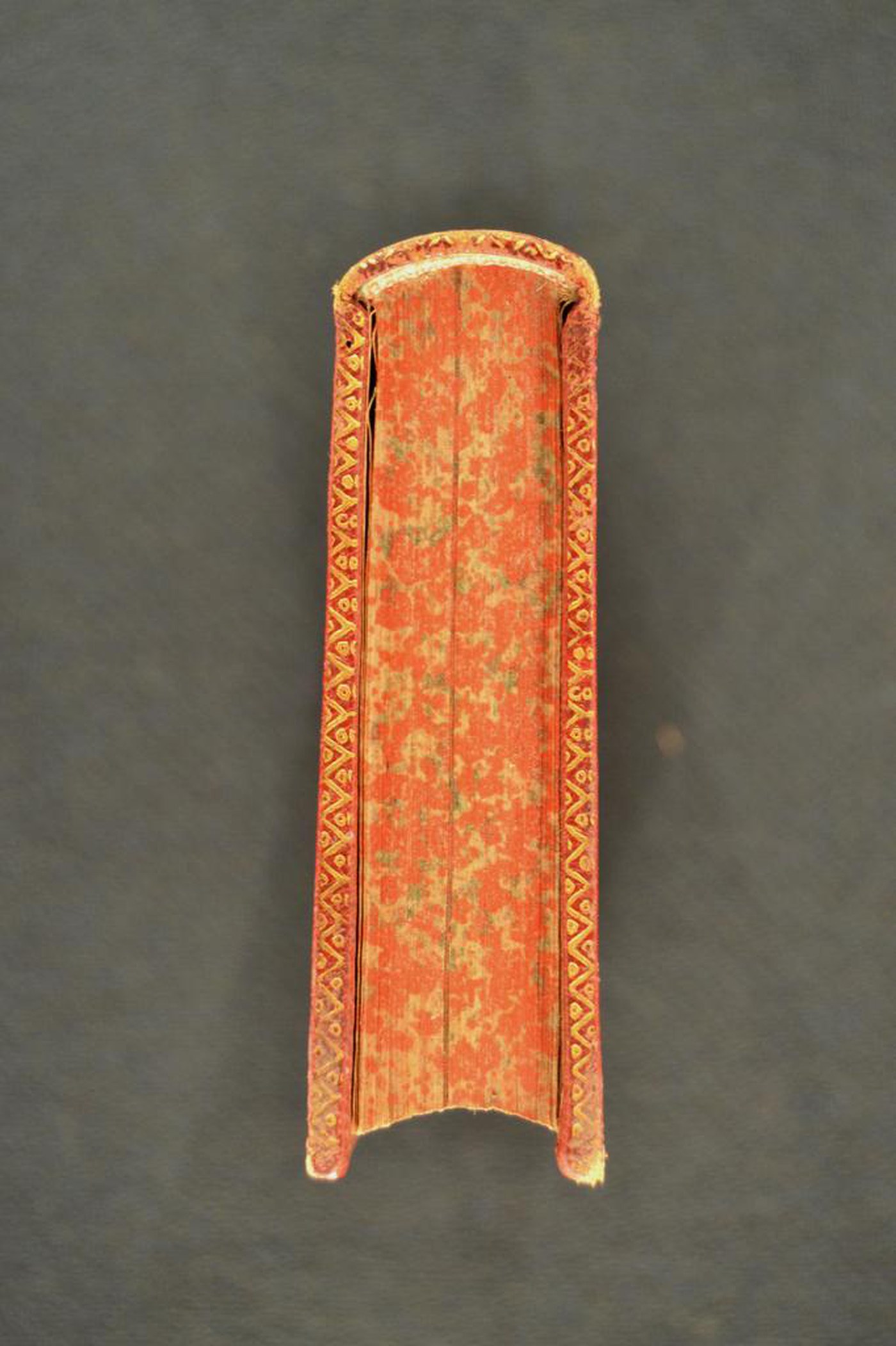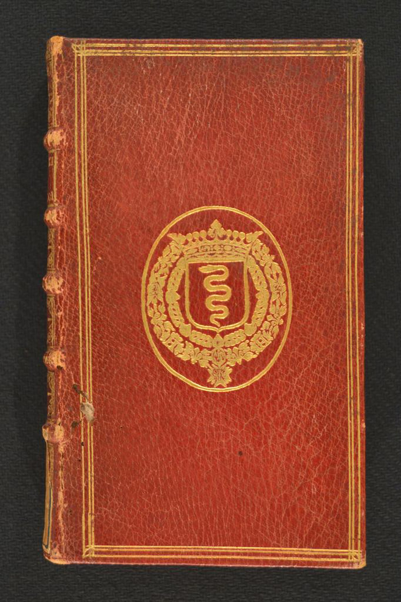 Cuoio di capra rosso su quadranti in cartone decorato in oro. Cornice all’antica. Armi (50x40 mm) riferibili a Jean-Baptiste Colbert Scompartimenti del dorso arrotondato riquadrati. Nel secondo, il cognome dell’autore e il titolo dell’opera; grottesca, aste filigranate e monogramma coronato in quelli residui. Capitelli muniti di due anime circolari avvolte da fili in seta rossa e azzurra. Cucitura su sei nervi rilevati. Indorsatura realizzata tramite aletta cartacea sotto forma di trapezio. Labbri ornati a pizzo. Rimbocchi discretamente rifilati. Carte di guardia bianche. Tagli dorati spugnati di rosso. Stato di conservazione: discreto - buono. Spellature al materiale di copertura in corrispondenza delle estremità dei nervi. Minime bruniture.