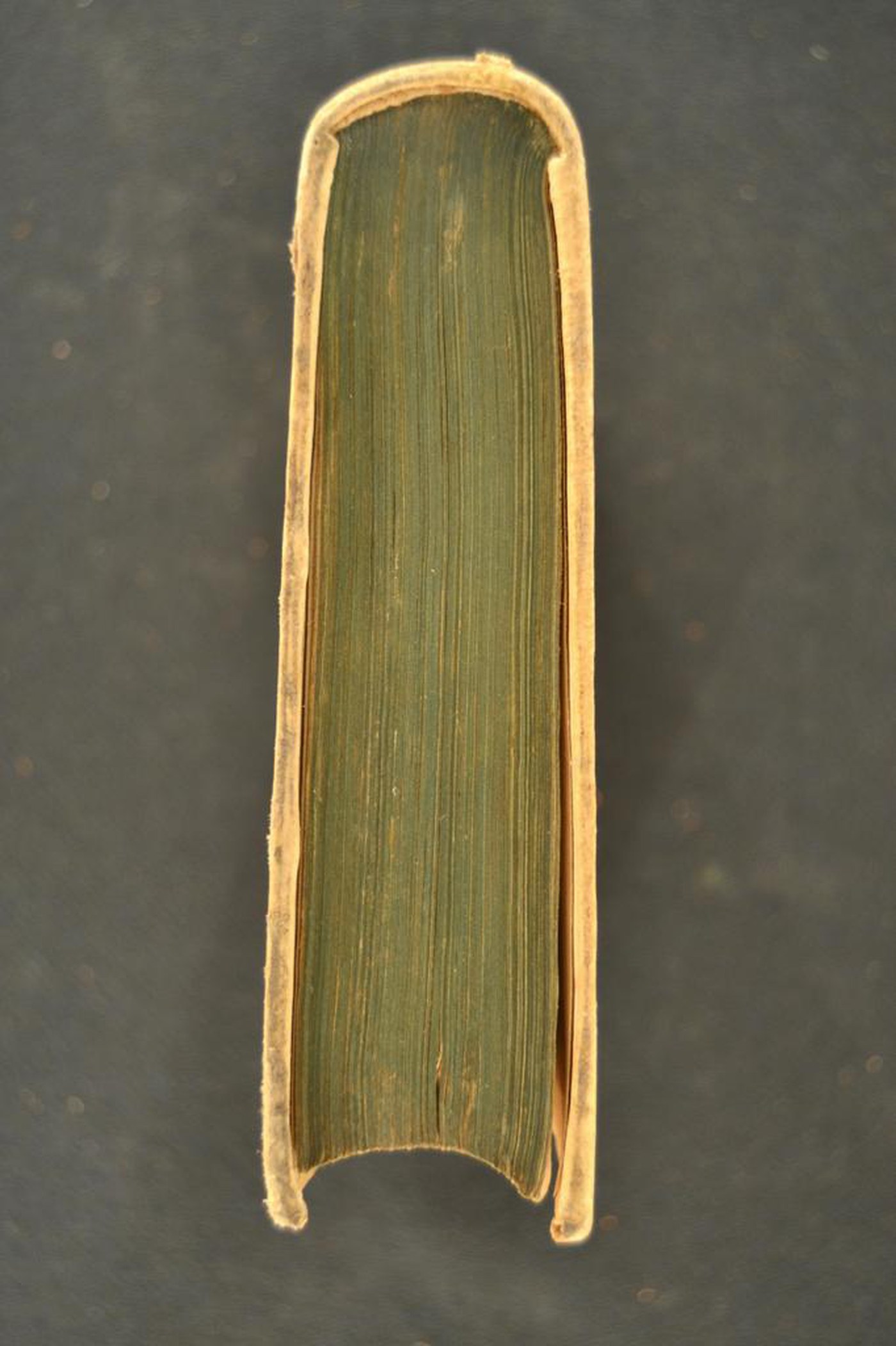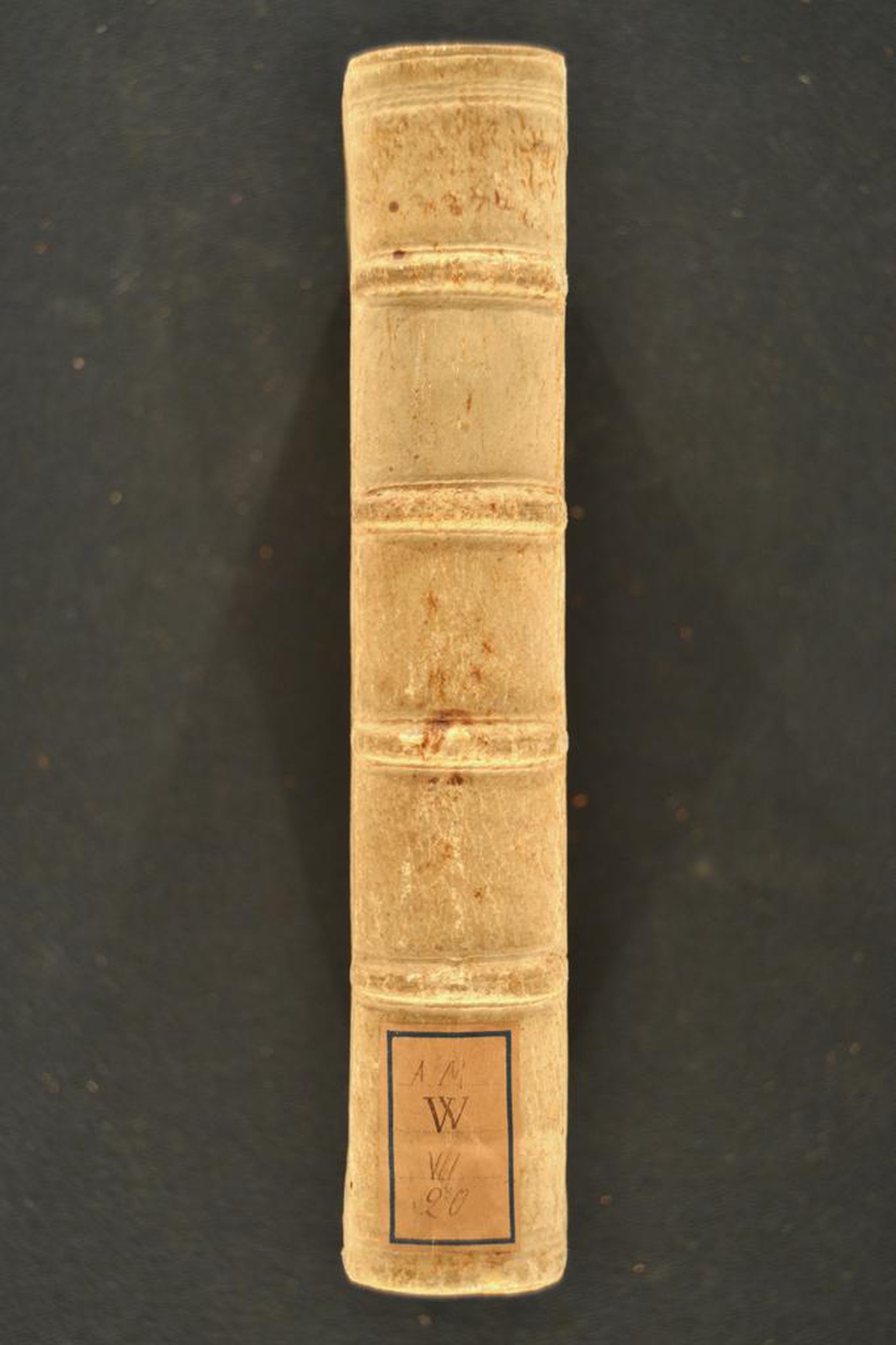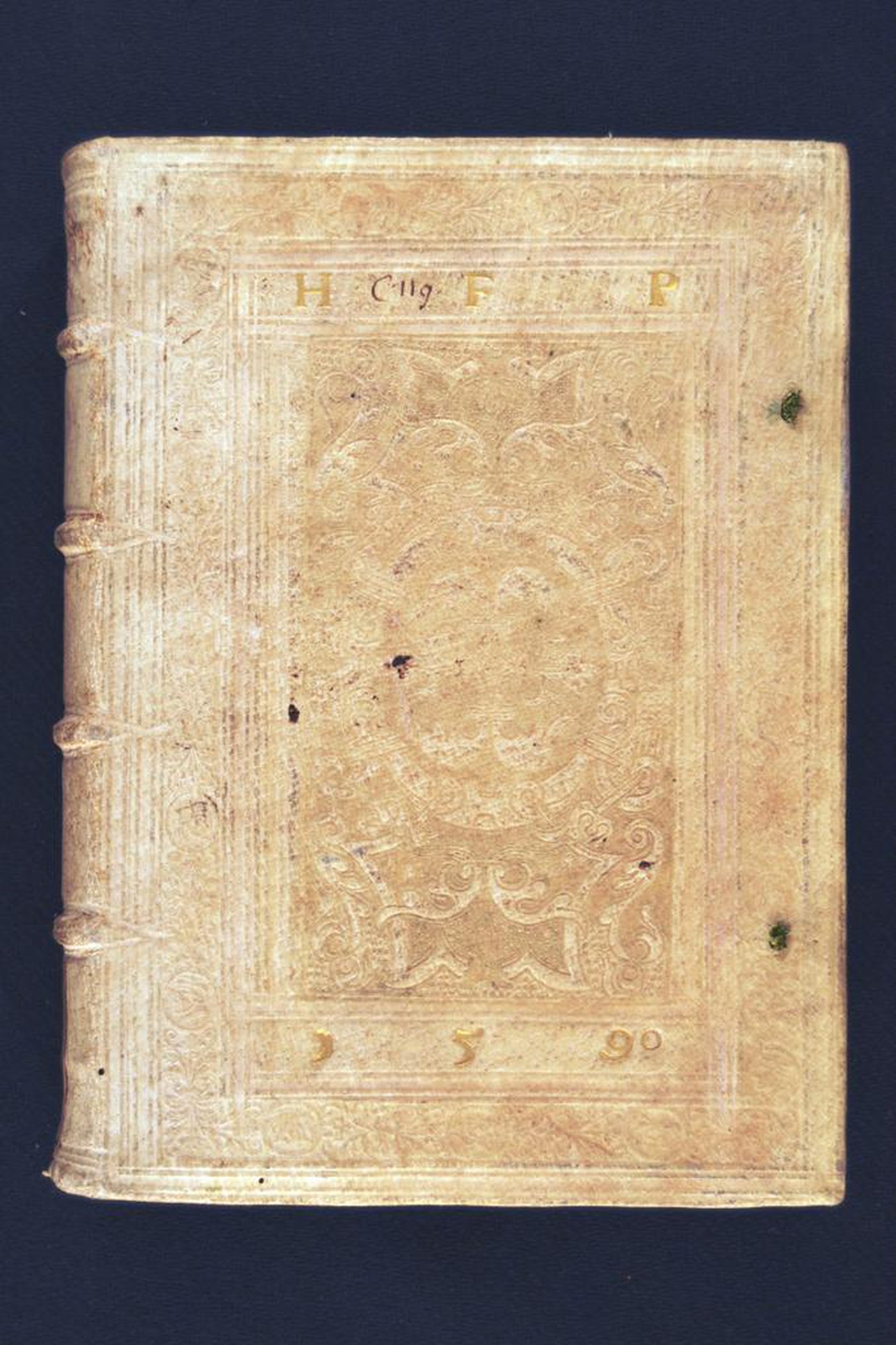 Il supra libros e i fregi inducono ad assegnare la legatura al 1590, eseguita a Heidelberg (Baden-Württemberg) dall’ignoto legatore «F D», ivi attivo nella seconda metà del XVI secolo per il destinatario «H F P» del quale questa Istituzione conserva alcuni esemplari. In evidenza i supporti confezionati con carta stampata di riutilizzo e i tagli blu a rilevare la tonalità monocroma avoriata del materiale di copertura.