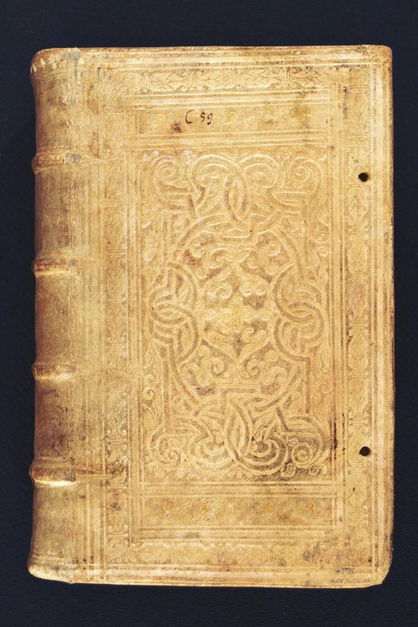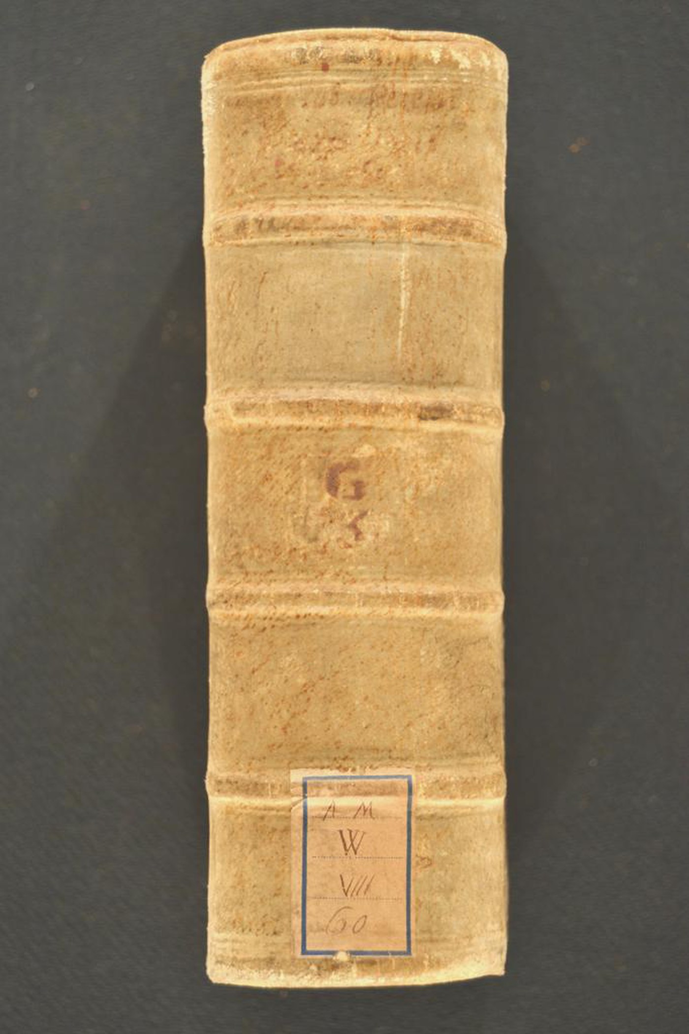 Pelle di scrofa allumata su quadranti in cartone decorata a secco e in oro. Filetti concentrici. Cornice caratterizzata da candelabre. Placca (120x70 mm) provvista di nastri intrecciati; in testa l’acronimo «H F P,», al piede l’anno di produzione, il 1588. Tracce di quattro lacci. Capitelli muniti di anima circolare avvolta da fili in canapa. Cucitura su quattro nervi rilevati. Indorsatura realizzata tramite aletta verticale cartacea. Rimbocchi rifilati senza particolare cura al piatto anteriore, con attenzione a quello posteriore. Carte di guardia bianche. Tagli blu. Stato di conservazione: discreto - buono. Fiore parzialmente scomparso. Angoli ricurvi.