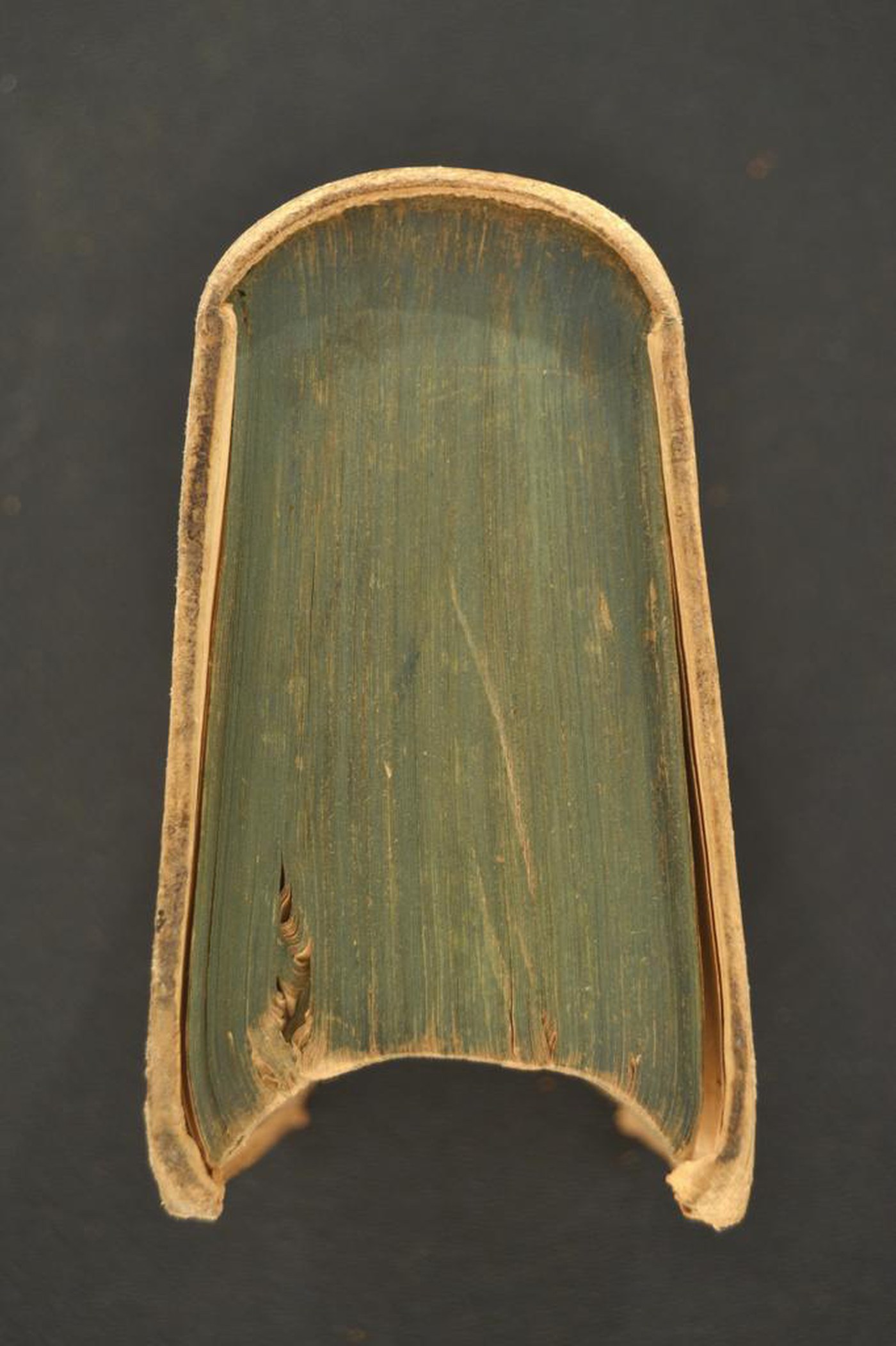 Il supra libros al piatto anteriore, le candelabre e le placche inducono ad attribuire la legatura al 1586, eseguita a Heidelberg dall’ignoto legatore «F D» attivo nella seconda metà del XVI secolo per «H F P». In evidenza i rimbocchi approssimativamente rifilati e i tagli blu.