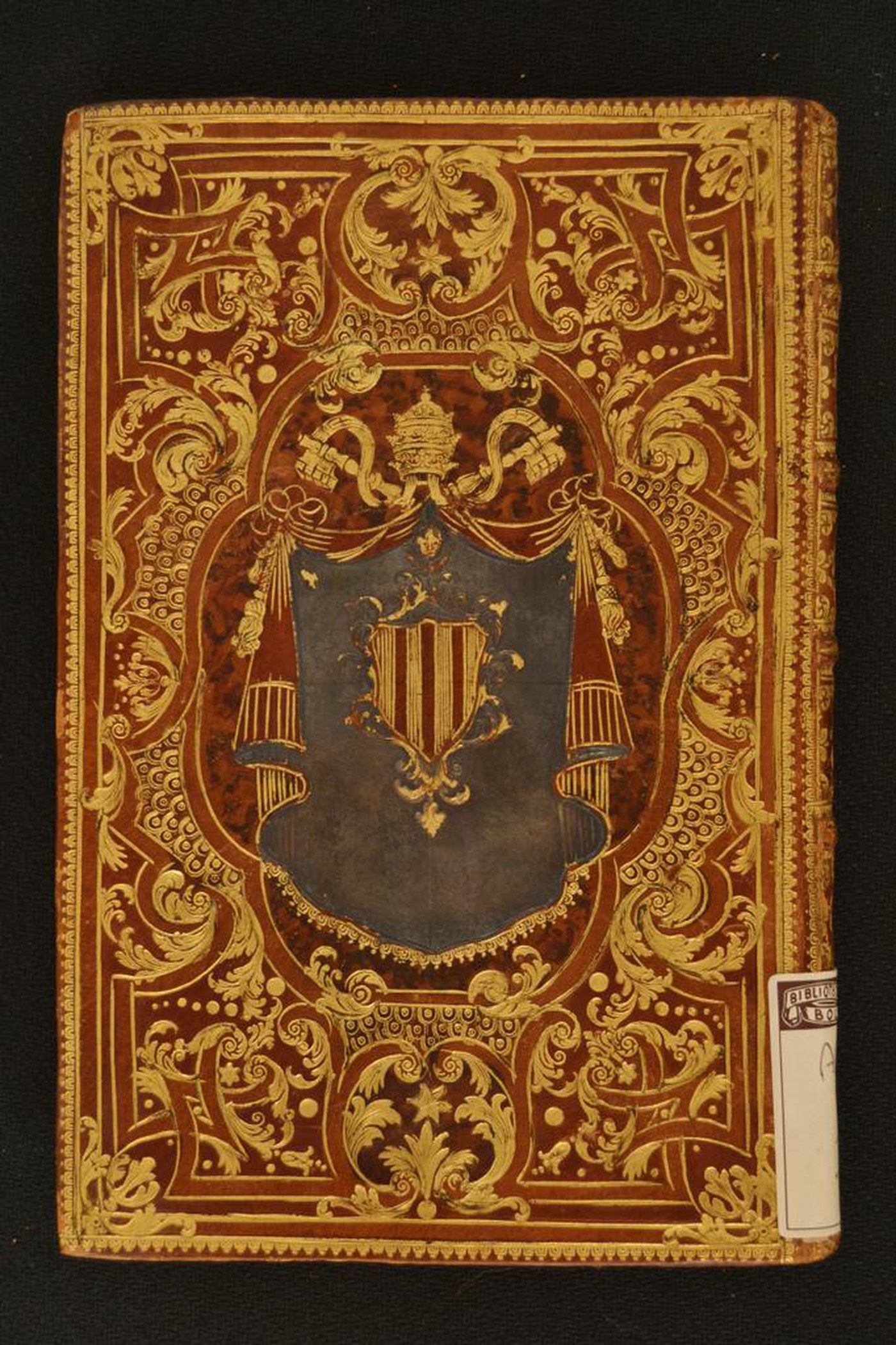 Cuoio di vitello marmorizzato marrone su quadranti in cartone decorato in oro e in pasta colorata. Impianto ornamentale caratterizzato da filetti concentrici, fogliami svasati, nastri incrociati, cerchielli pieni, corolle stilizzate dai pistilli filigranati, stelle a sei punte, squame di pesce. Cornice caratterizzata da monticelli e due filetti. Margini interni dello specchio provvisti di palmette alternate a fregi cuoriformi, fogliami svasati, fronde mosse, tralicci. Armi (105x70 mm) rilevate in pasta blu, riferibili al pontefice Benedetto XIV (1740-1758). Scompartimenti del dorso riquadrati; fogliame svasato negli angoli interni e corolla fogliata centrale in quelli residui. Capitelli muniti di anima circolare avvolta da fili seta rosa e canapa. Cucitura su cinque nervi rilevati. Indorsatura realizzata tramite alette orizzontali cartacee. Labbri ornati con fronde mosse. Rimbocchi non osservabili. Carte di guardia sbruffate policrome e bianche. Tagli dorati brillanti. Stato di conservazione: buono. Angoli ricurvi.