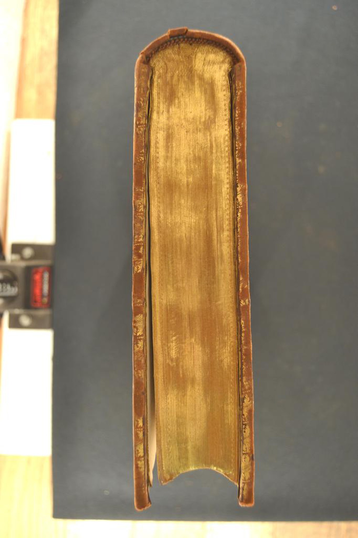 L’impianto ornamentale e i fregi e le note tipografiche propongono di assegnare la legatura alla metà (?) del XVIII secolo, eseguita a Roma. In evidenza le carte di guardia goffrate realizzate tramite impressione a caldo di matrice calcografica sulla carta turchese precedentemente applicata alla foglia dorata, i tagli dorati brillanti incisi e la tavola calcografica.
