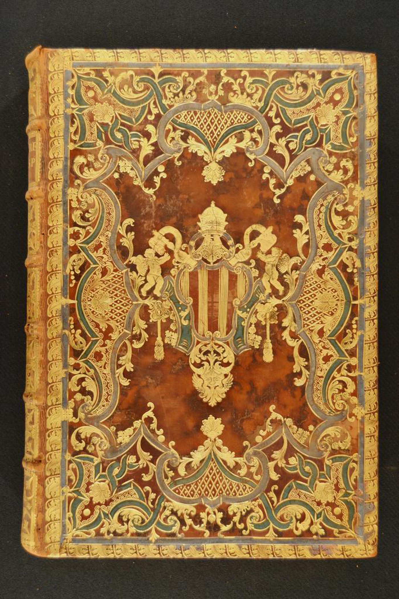 Cuoio di vitello marmorizzato marrone su quadranti in cartone decorato in oro e a colori. Cornice caratterizzata da fogliami mossi e serpentine filigranate, motivi ripresi lungo il margine dei contropiatti. Margine interno dello specchio provvisto di rami fronzuti mossi, tralicci, corolle stilizzate, cerchielli pieni, conchiglie, mascheroni, nastri intrecciati rilevati in pasta azzurra e turchese. Armi (95x100 mm) riferibili al pontefice Benedetto XIV (1740-1758). Scompartimenti del dorso riquadrati. Nel secondo, il cognome dell’autore, il titolo dell’opera e la partizione del volume; fogliami mossi negli angoli interni e due suonatore di tuba sormontati da ombrellino in quelli residui. Capitelli muniti di due anime circolari avvolte da fili in seta rosa, blu e fili dorati. Cucitura su sei nervi rilevati. Indorsatura realizzata tramite alette orizzontali cartacee. Labbri e margine dei contropiatti ornati con fogliami. Rimbocchi rifilati senza particolare cura. Carte di guardia goffrate turchesi entro sfondo dorato a raffigurare fiorami e fogliami mossi, e bianche. Tagli dorati brillanti incisi. Stato di conservazione: discreto – buono. Marginali spellature del materiale di copertura.