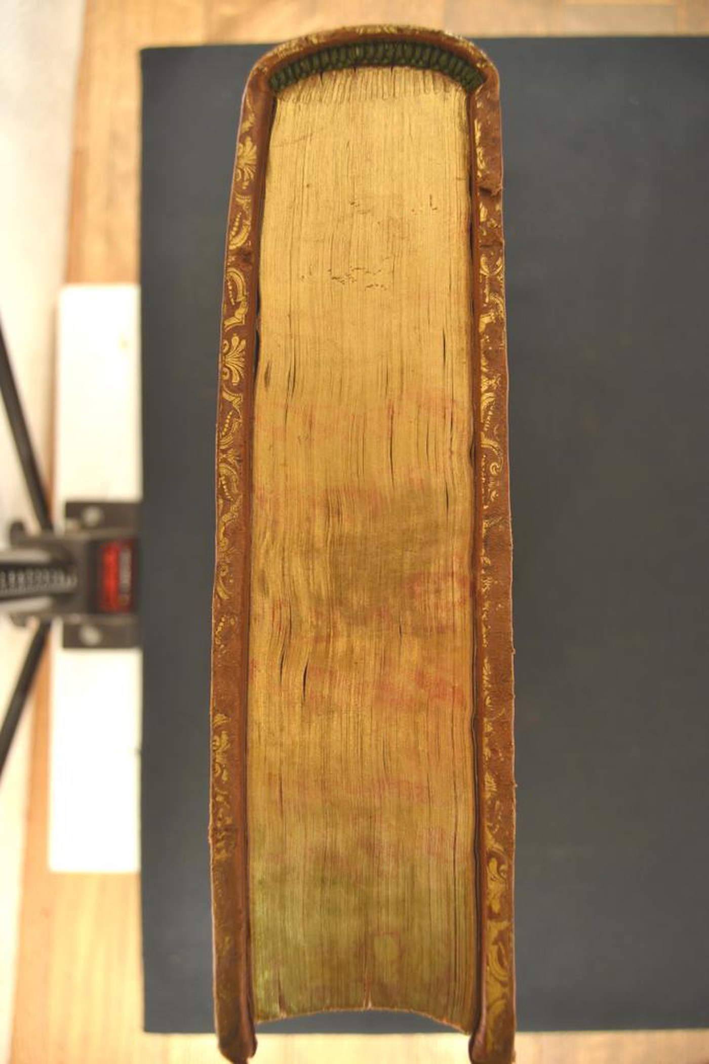 I fregi e le note tipografiche propongono di assegnare la legatura alla metà (?) del XVIII secolo, eseguita a Roma. In evidenza le carte di guardia marmorizzate policrome pettinate e i tagli dorati brillanti incisi.