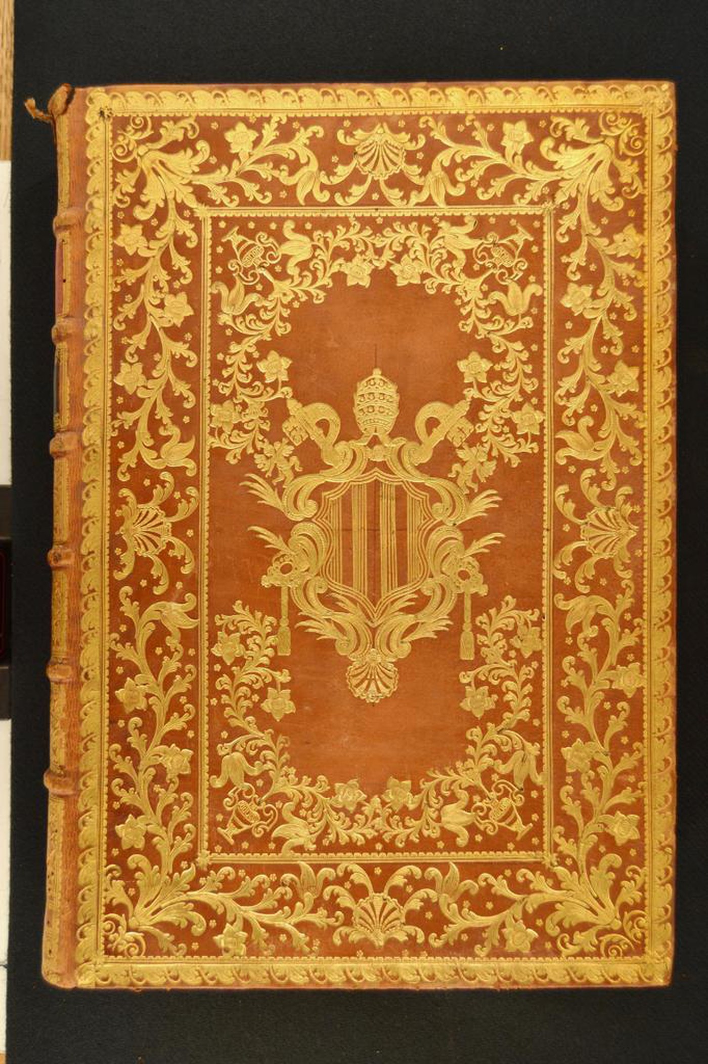 Cuoio di vitello biondo su quadranti in cartone decorato in oro. Coppia di cornici concentriche caratterizzate da fogliami mossi, filetti filigranati, rami fronzuti, cerchielli, conchiglie, corolle fogliate trilobate. Margine interno dello specchio provvisto di vasi a due anse, rami fronzuti mossi, fiorami pentalobati. Armi (100x90 mm) riferibili al pontefice Benedetto XIV (1740-1758). Scompartimenti del dorso riquadrati. Nel secondo e terzo, il titolo dell’opera e la partizione del volume entro i tasselli in cuoio rosso e nero; fiorami e fogliami negli angoli interni e fregio fitomorfo centrale entro sfondo losangato in quelli residui. Capitelli muniti di anima circolare avvolta da fili in seta turchese, blu e dorati. Cucitura su sei nervi rilevati. Indorsatura non osservabile. Labbri ornati con fregi fitomorfi. Carte di guardia marmorizzate policrome pettinate e bianche. Tagli dorati brillanti incisi. Stato di conservazione: discreto. Marginali spellature al materiale di copertura. Cuffia di testa in fase di distacco.