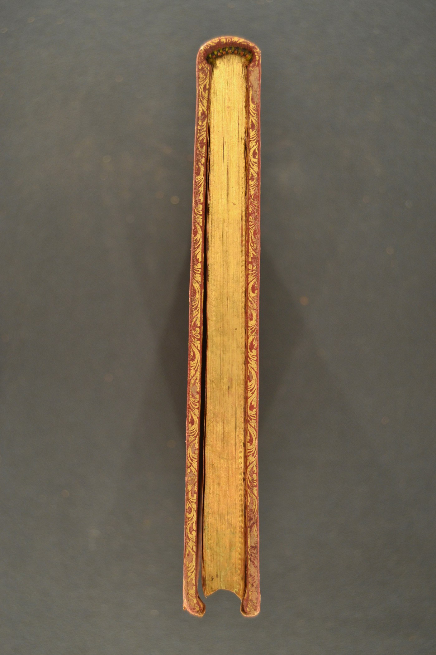 I fregi, le carte di guardia sbruffate rosa e le note tipografiche consentono di assegnare la legatura alla metà del XVIII secolo, eseguita a Roma. In evidenza i tagli dorati brillanti incisi.