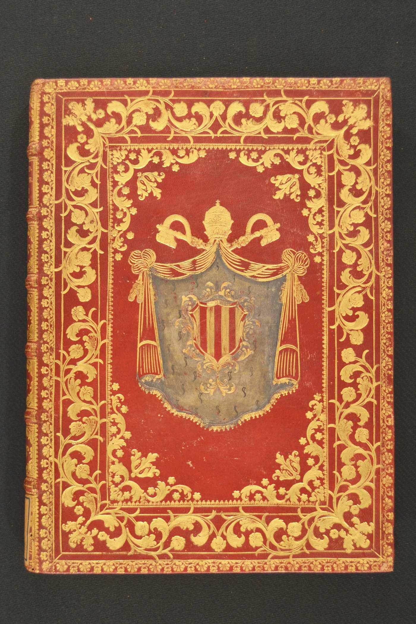 Cuoio di capra rosso su quadranti in cartone decorato in oro e a colore. Filetti concentrici collegati alle estremità. Coppia di cornici caratterizzate da palmette alternate a motivi cuoriformi, steli arcuati sormontati da fiorami. Margini interni dello specchio provvisti di monticelli, rami fronzuti, corolle trilobate, minute stelle. Armi (125x100 mm) rilevate in pasta blu, riferibili al pontefice Benedetto XIV (1740-1758). Scompartimenti del dorso riquadrati. Nel secondo, il titolo dell’opera; fogliami negli angoli interni e corolla trilobata fogliata centrale in quelli residui. Capitelli muniti di anima circolare avvolta da fili in seta rosa, verde e dorati. Cucitura su sei nervi rilevati. Indorsatura realizzata tramite alette orizzontali cartacee. Labbri ornati con rami fronzuti. Rimbocchi discretamente rifilati. Carte di guardia sbruffate rosa e bianche. Tagli dorati brillanti incisi. Stato di conservazione: buono. Minime spellature discreto al materiale di copertura.