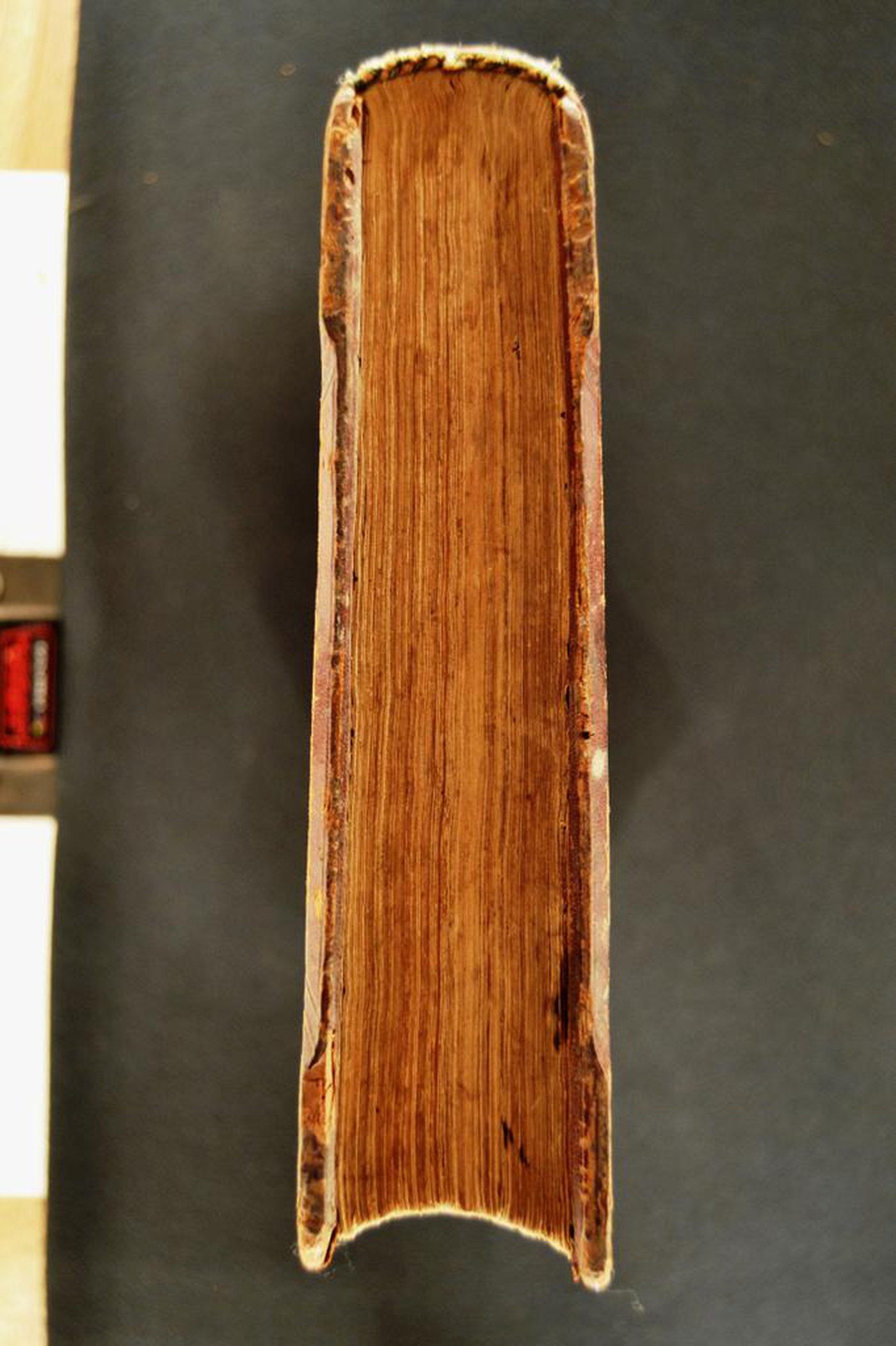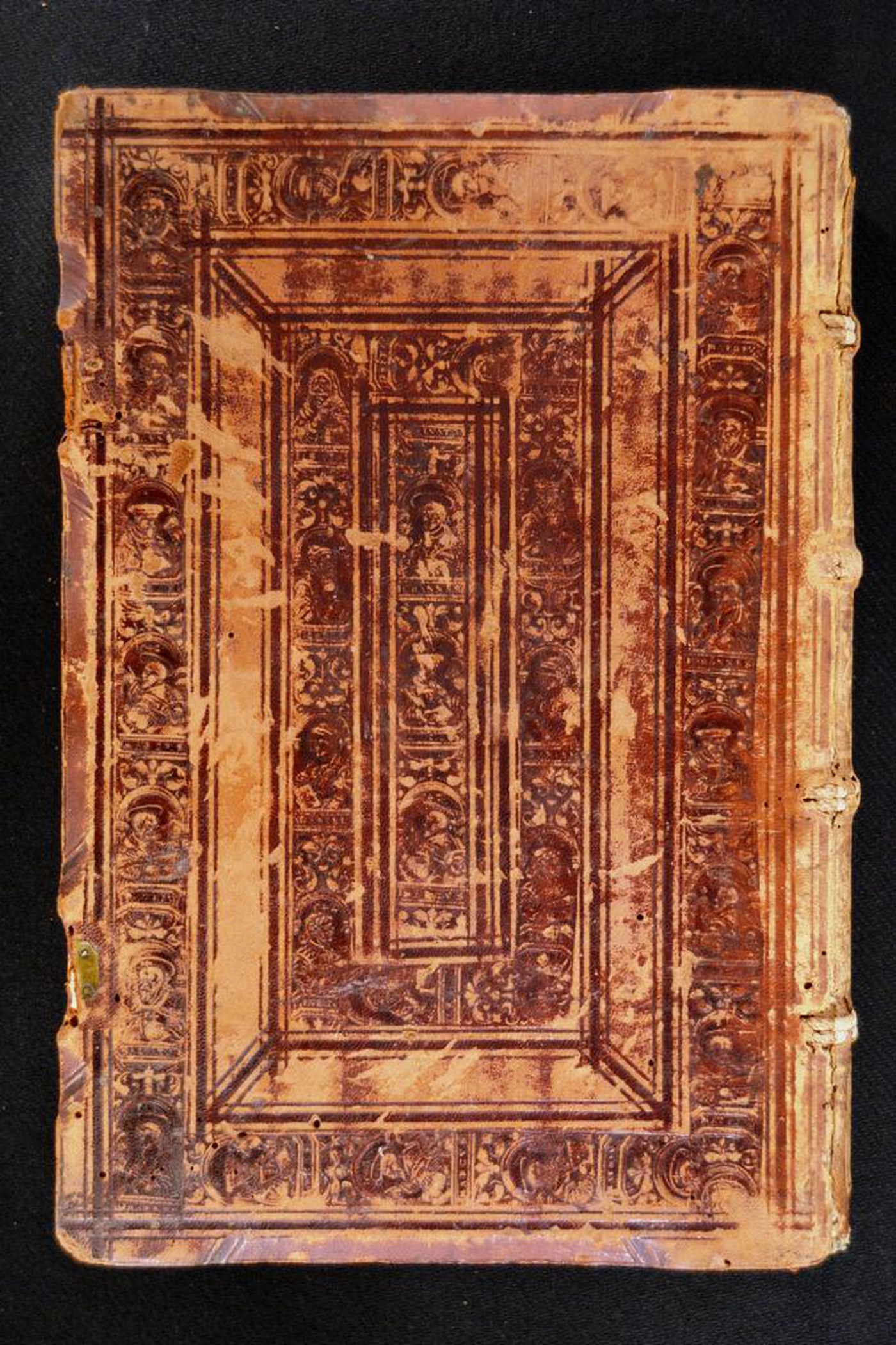 Cuoio di vitello su assi lignee smussate ai piatti in corrispondenza dei tagli, decorato a secco e in d’oro. Filetti concentrici bruniti. Coppia di cornici concentriche caratterizzate da personaggi biblici (Marcus 1542). Tracce di due fermagli costituite da altrettante impronte assicurate da due chiodi ancorati al piatto anteriore e da un paio di bindelle in cuoio ancorate a mezzo di piastra pure in ottone ancorata con due chiodi in metallo a quello posteriore. Capitelli muniti di anima circolare avvolta da fili in canapa e in seta azzurra. Cucitura su quattro doppi nervi in canapa. Indorsatura realizzata tramite aletta orizzontale cartacea. Rimbocchi accuratamente rifilati. Carte di guardia bianche. Tagli rustici. Stato di conservazione: discreto. Spellature al materiale di copertura, in parte assente lungo il dorso.