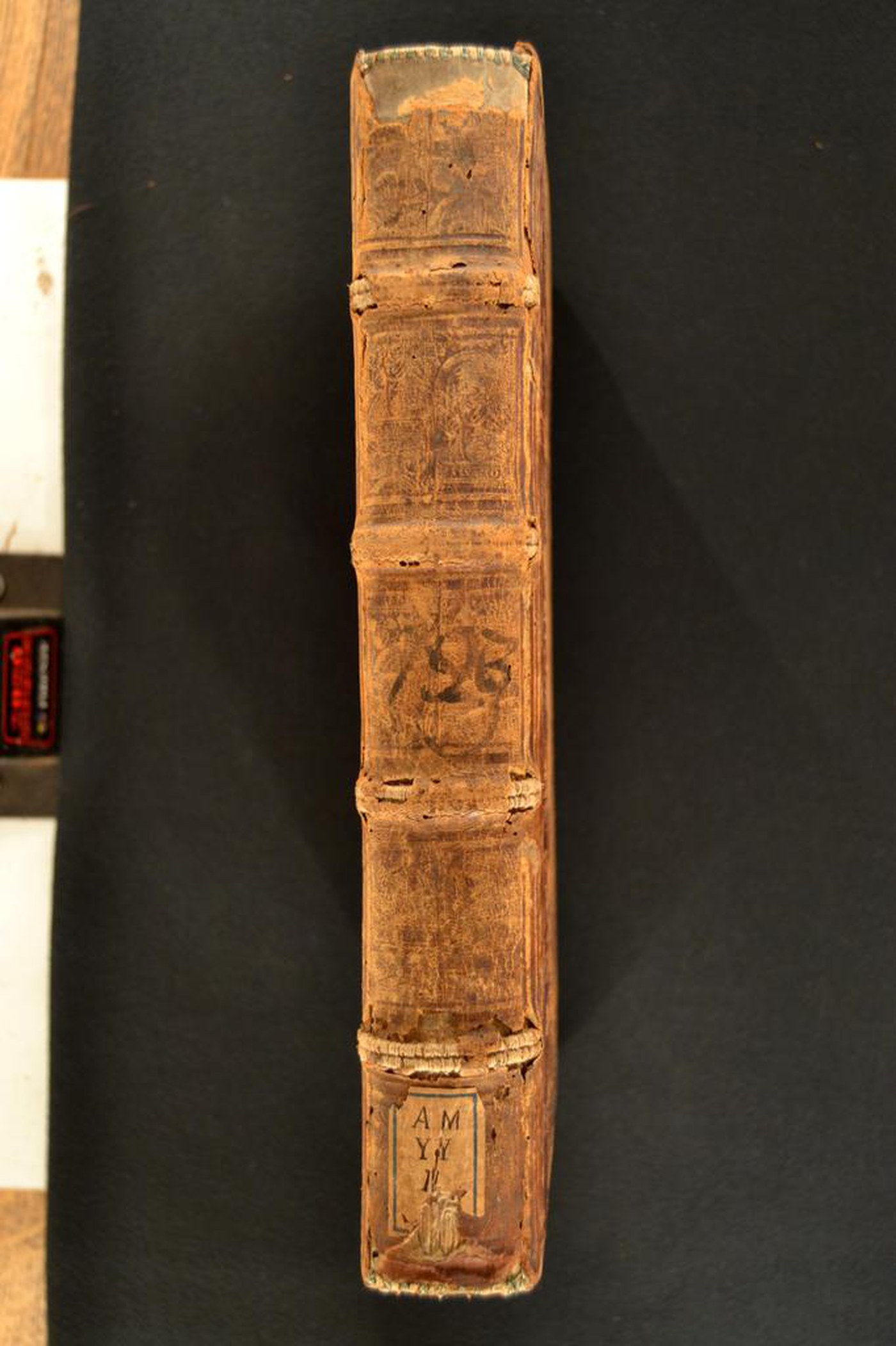 Il titolo dell’opera in testa al piatto anteriore, i fregi muniti di personaggi biblici sormontati dalla data di incisione della rotella, qui il 1542, e da arco, congiuntamente alle note tipografiche consentono di attribuire la legatura alla metà del XVI secolo, eseguita in Polonia. In evidenza i supporti lignei smussati ai piatti e le impronte delle contrograffe. Volume appartenuto a Giovanni Hillamaier3 (?) nel 1566.