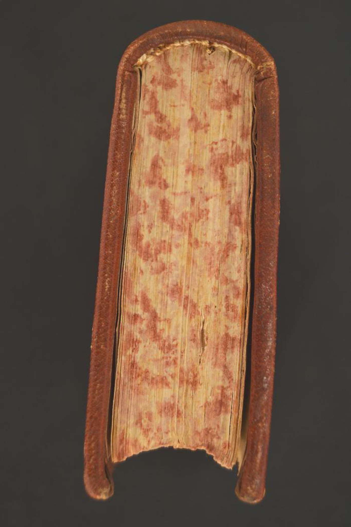 I fregi, l’argomento di probabile interesse locale e le note tipografiche propongono di attribuire la legatura alla metà del XVIII secolo, verosimilmente eseguita a Firenze. In evidenza i contropiatti rivestiti da foglio in carta marmorizzata pettinata e i tagli spugnati.