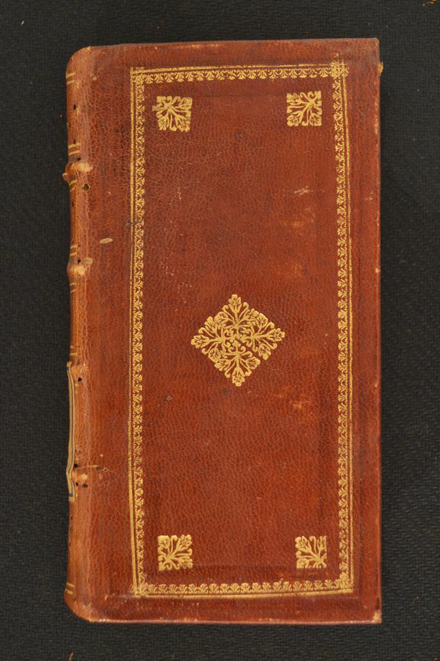 Cuoio di capra su quadranti in cartone decorato a secco e in oro. Margine interno dello specchio caratterizzato da fogliami. Fregio fitomorfo negli angoli interni, ripreso quattro volte nella cartella centrale e al centro degli scompartimenti del dorso. Capitelli muniti di anima circolare da fili seta bianca e rosa. Cucitura su quattro nervi rilevati. Indorsatura realizzata tramite alette orizzontali cartacee. Labbri muti. Rimbocchi discretamente rifilati. Contropiatti rivestiti da foglio in carta marmorizzata pettinata. Carte di guardia bianche. Tagli spugnati di viola. Stato di conservazione: buono.