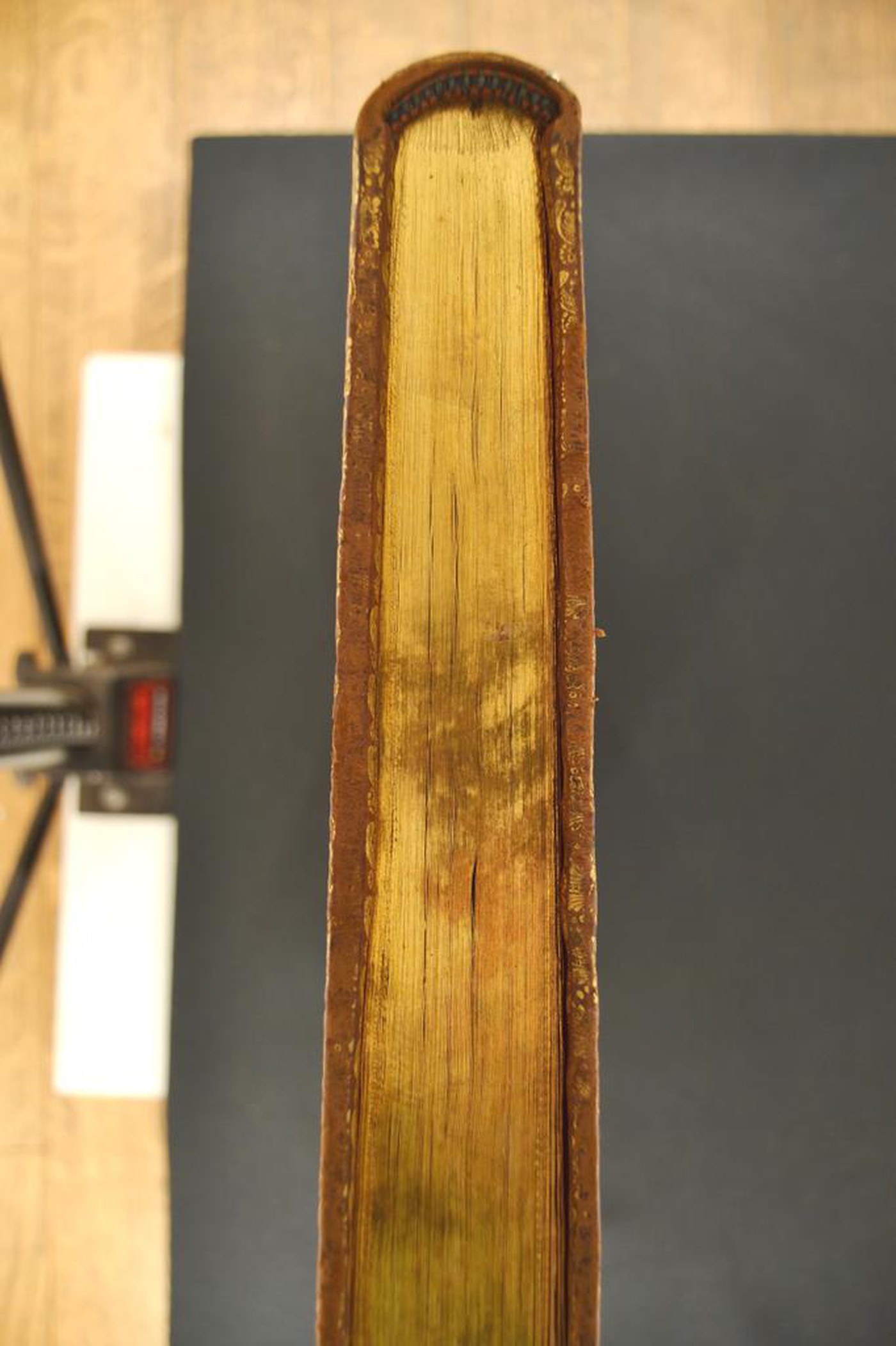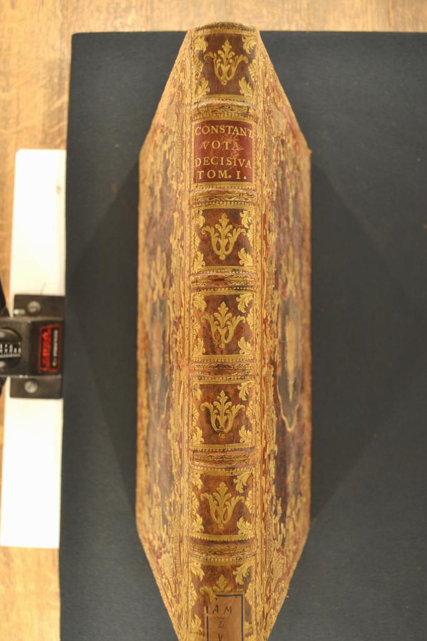 I fregi, le carte di guardia bruffate e le note tipografiche consentono di assegnare la legatura al secondo quarto del XVIII secolo, eseguita a Roma. In evidenza i capitelli lavorati e i tagli dorati brillanti incisi.