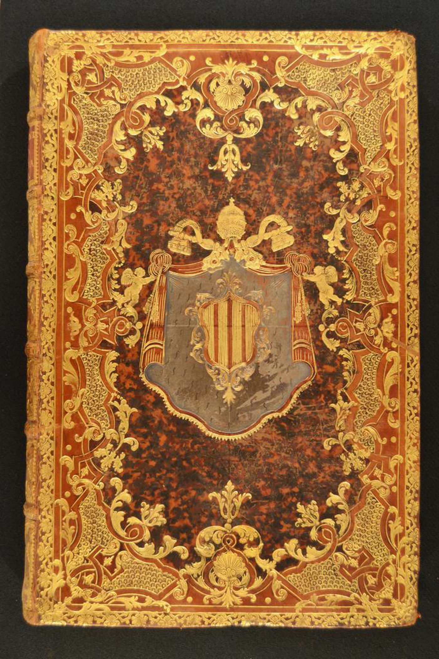 Cuoio di vitello marmorizzato marrone su quadranti in cartone decorato in oro e a colore. Coppia di cornici caratterizzate da fogliami entro nastri. Margini interni dello specchio provvisti di fronde, cerchielli pieni, nastri, riquadri con squame di pesce, corolle stilizzate trilobate. Armi (155x110 mm) rilevate in pasta azzurra, riferibili al pontefice Benedetto XIV (1740-1758). Scompartimenti del dorso riquadrati. Nel secondo, il titolo dell’opera e partizione del volume entro il tassello in corame rosso; fogliame negli angoli interni e ampia corolla stilizzata centrale in quelli residui. Capitelli muniti di tre anime circolare avvolte da fili in seta rossa, azzurra e blu. Cucitura su sei nervi rilevati. Indorsatura realizzata tramite alette orizzontali cartacee. Labbri ornati con fogliami mossi. Rimbocchi discretamente rifilati; risvolti laterali collocati sopra quelli di testa e di piede. Carte di guardia sbruffate rosa e bianche. Tagli dorati brillanti marmorizzati incisi. Stato di conservazione: discreto - buono. Angoli ricurvi.