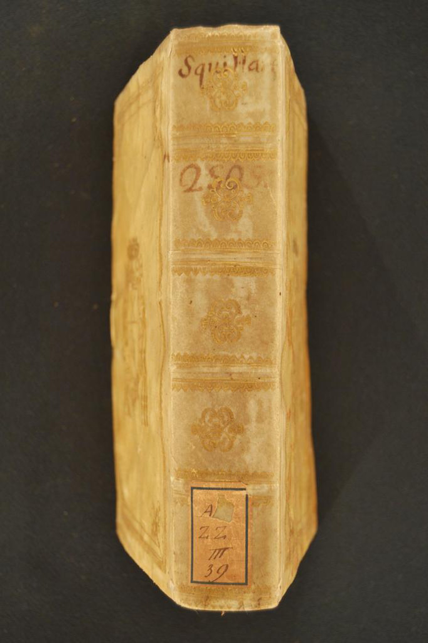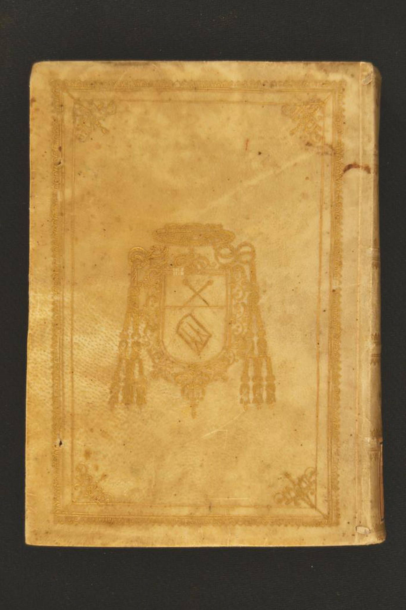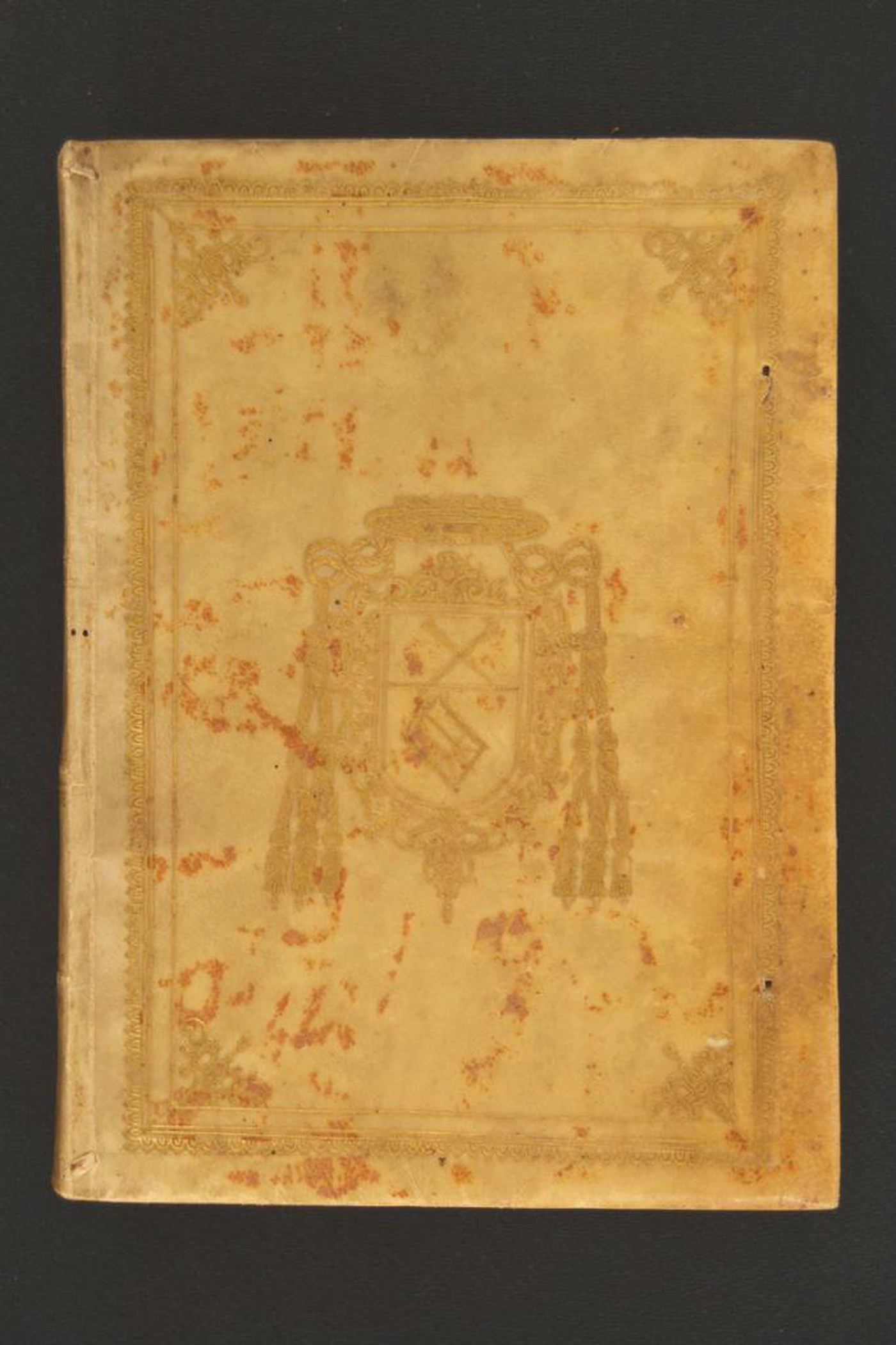 Pergamena semi floscia decorata in oro. Cornice provvista di monticelli. Testina classica negli angoli interni degli angoli. Armi prelatizie (83x70 mm). Scompartimenti del dorso provvisti di quattro volute addossate e di due corolle stilizzate centrali; nome e cognome dell’autore manoscritti in testa. Capitelli muniti da anima in pelle allumata passante avvolta da fili metallici e in seta rosa. Cucitura su quattro nervi. Indorsatura realizzata tramite alette orizzontali cartacee. Rimbocchi accuratamente rifilati. Carte di guardia bianche. Tagli dorati. Stato di conservazione: discreto. Diffuse gore aranciate al piatto anteriore. Angoli ricurvi.