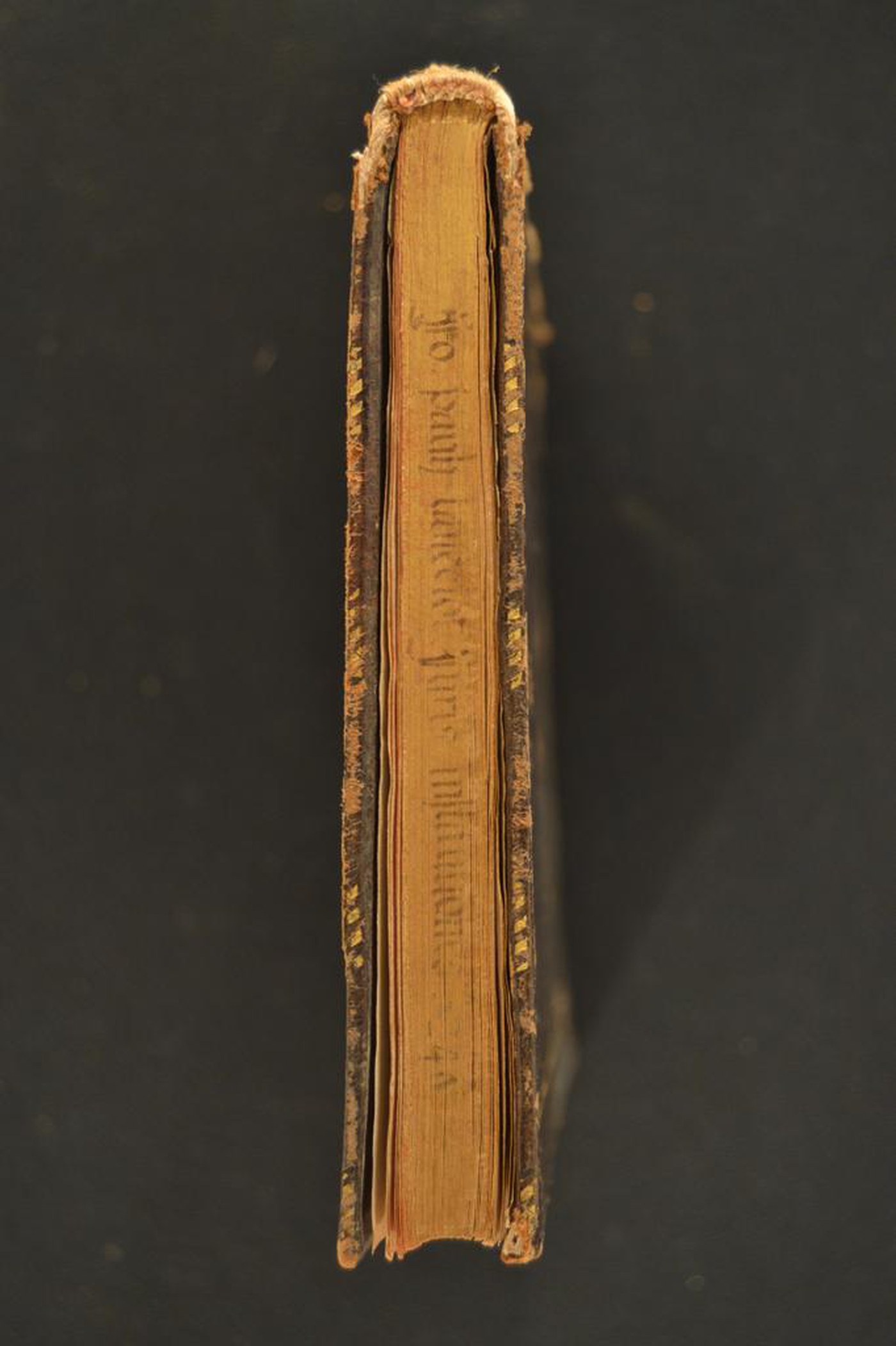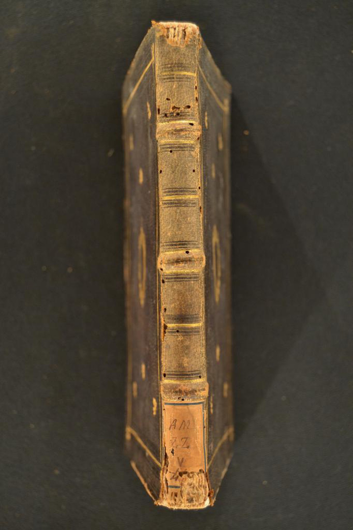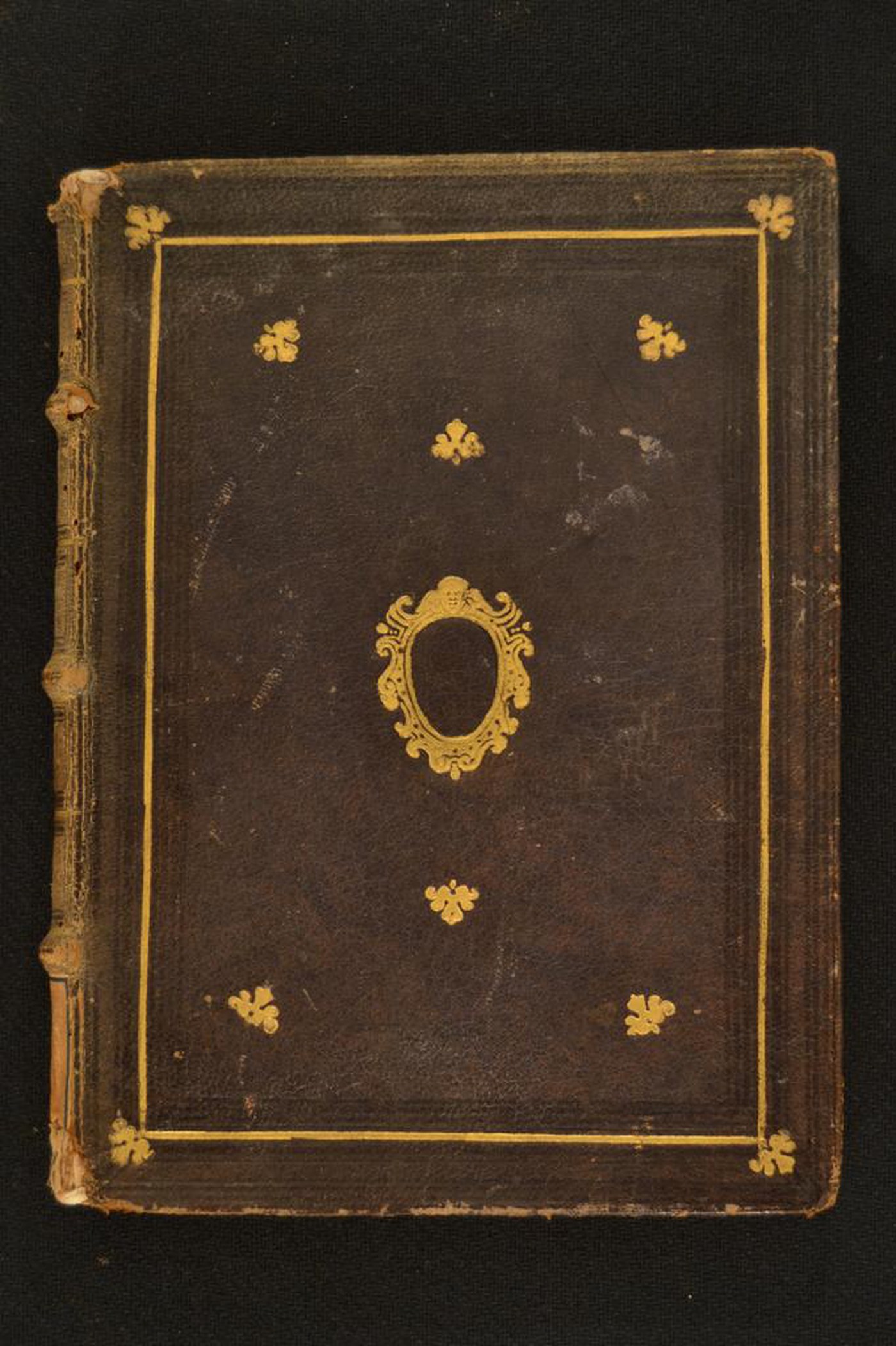 Cuoio di capra bruno su assi lignee smussate ai contropiatti in corrispondenza dei tagli, decorato a secco e in oro. Filetti concentrici. Cornice a filetto. Corolla stilizzata negli angoli esterni ripresa in foggia di serto ad affiancare la cartella centrale (40x30 mm) muta. Capitelli muniti di anima pelle allumata avvolta da fili in canapa e in seta rosa (tracce). Cucitura su tre nervi rilevati in pelle allumata. Indorsatura realizzata tramite alette membranacee orizzontali di recupero. Rimbocchi rifilati senza particolare cura. Carte di guardia bianche. Tagli dorati al piede; nome, cognome dell’autore e titolo dell’opera manoscritti al piede. Stato di conservazione: mediocre - discreto. Spellature al materiale di copertura dalla tonalità scolorita lungo il dorso, ivi parzialmente mancante nella porzione superiore e inferiore. Cerniere indebolite.