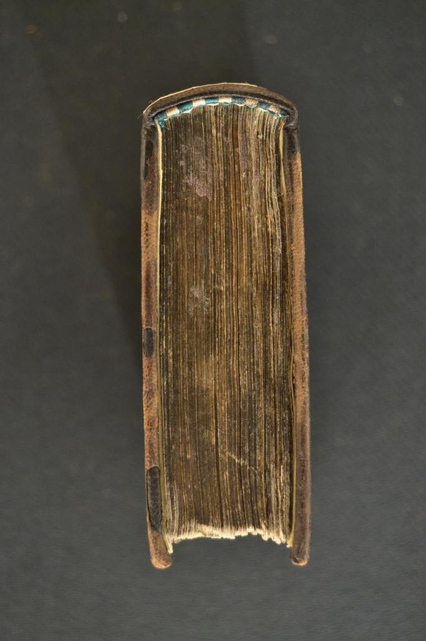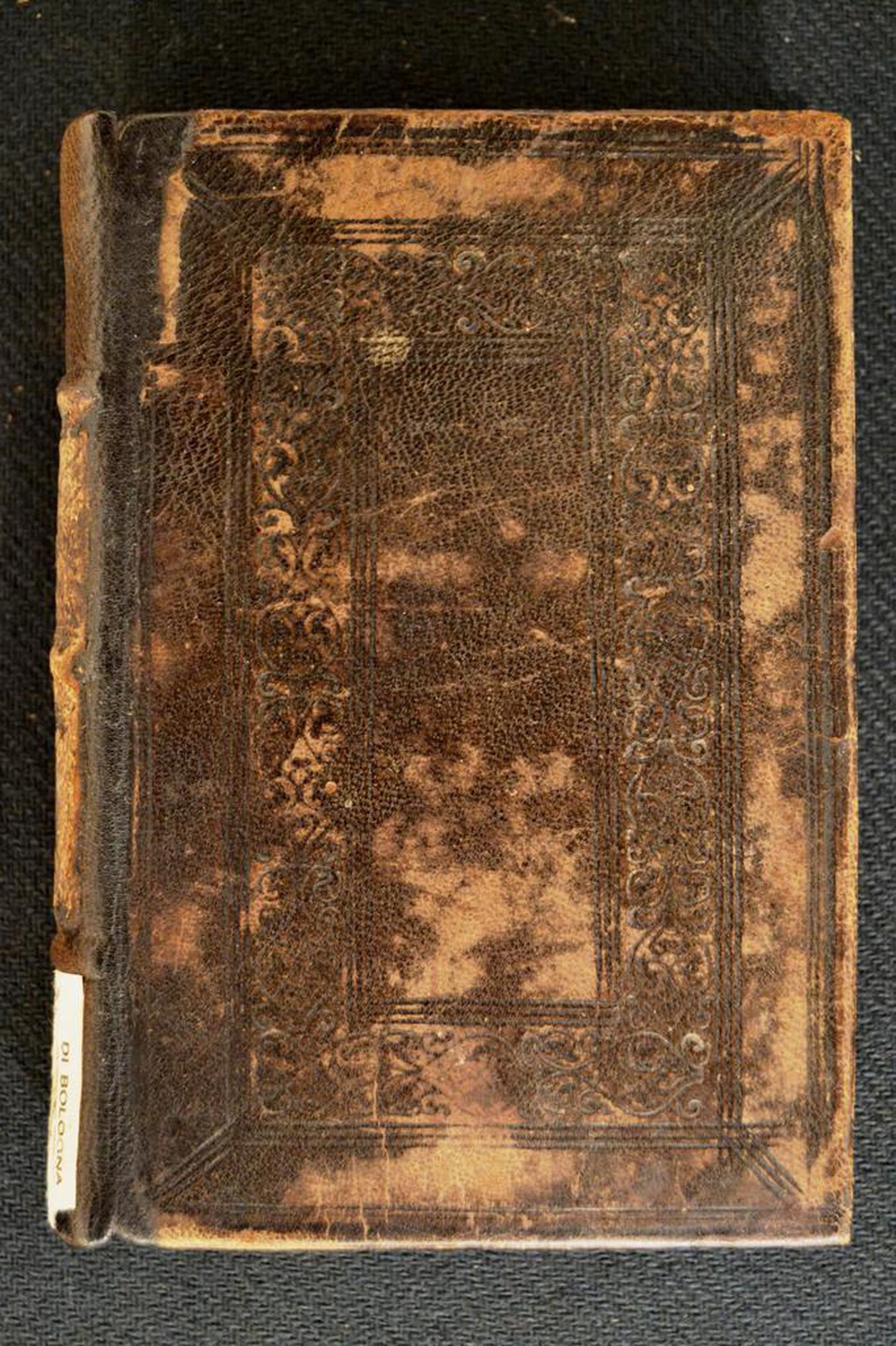 Materiale di copertura bruno su quadranti in cartone decorato a secco. Tre fasci di filetti concentrici parzialmente collegati negli angoli. Cornice caratterizzata da meandri. Specchio muto. Due fasci di tre filetti incrociati negli scompartimenti del dorso. Capitelli, indorsatura, rimbocchi e carte di guardia rinnovati. Cucitura su tre nervi. Tagli rustici neri. Stato di conservazione: mediocre Diffuse spellature. Materiale di copertura originale parzialmente scomparso.