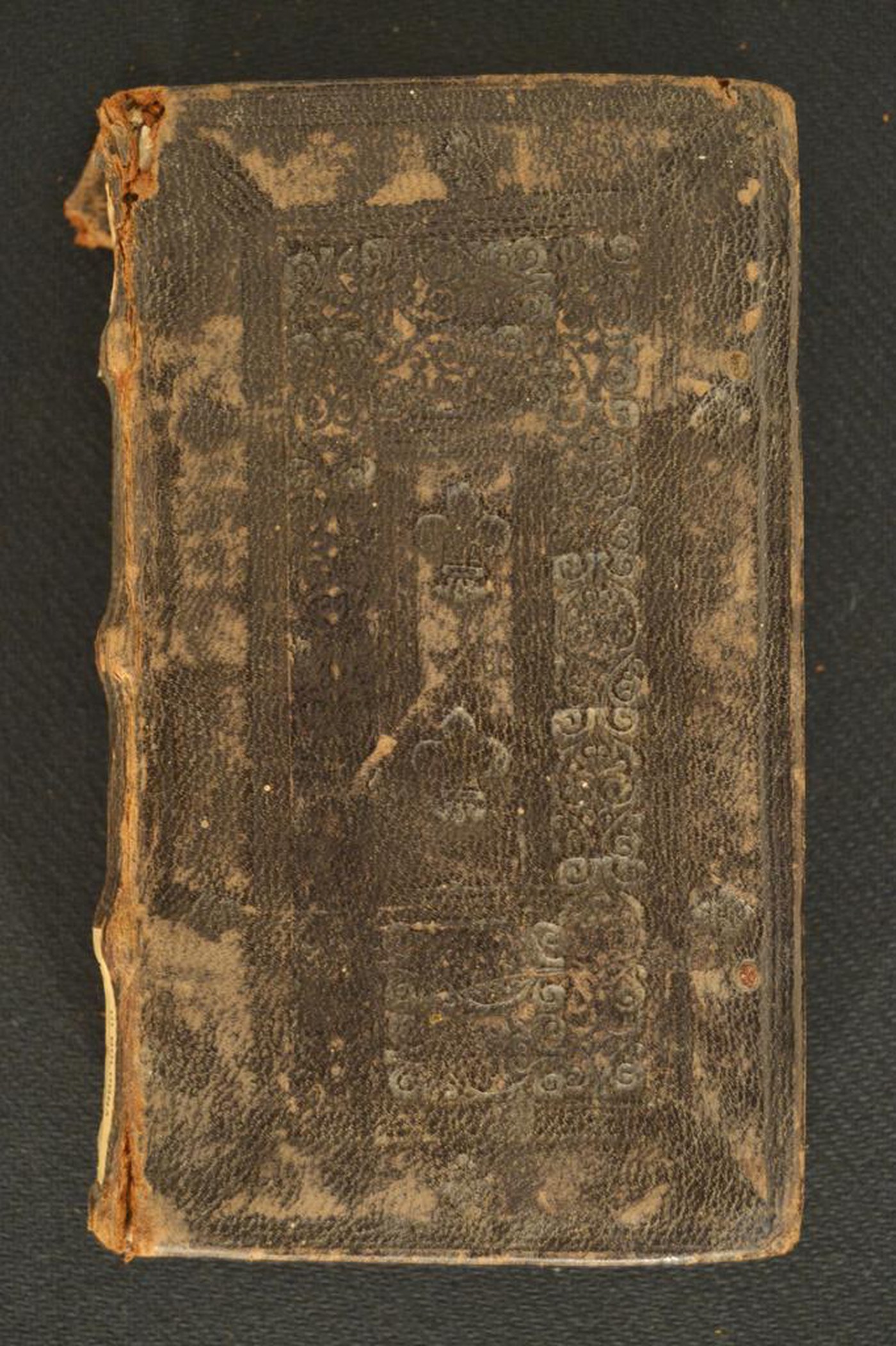 Cuoio di bazzana testa di moro su quadranti in cartone decorato a secco. Due fasci di filetti concentrici collegati al piede. Cornice interna caratterizzata da motivi a meandri; due gigli nello specchio. Scompartimenti provvisti di due fasci di filetti incrociati. Capitelli muniti di anima circolare avvolta da fili in canapa, rinnovati al piede. Cucitura su tre nervi rilevati in pelle allumata fendue. Indorsatura realizzata tramite alette orizzontali cartacee. Rimbocchi accuratamente rifilati. Carta di guardia bianca posteriore. Tagli blu. Stato di conservazione: mediocre - discreto. Materiale di copertura in parte assente in testa al dorso. Fiore parzialmente scomparso. Angoli ricurvi.