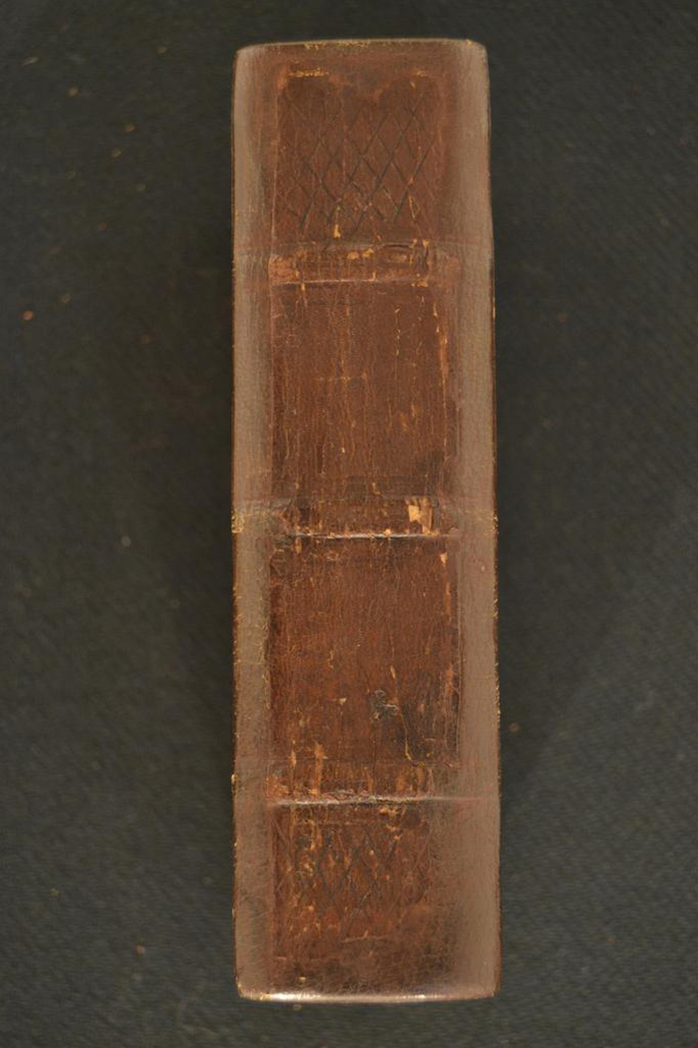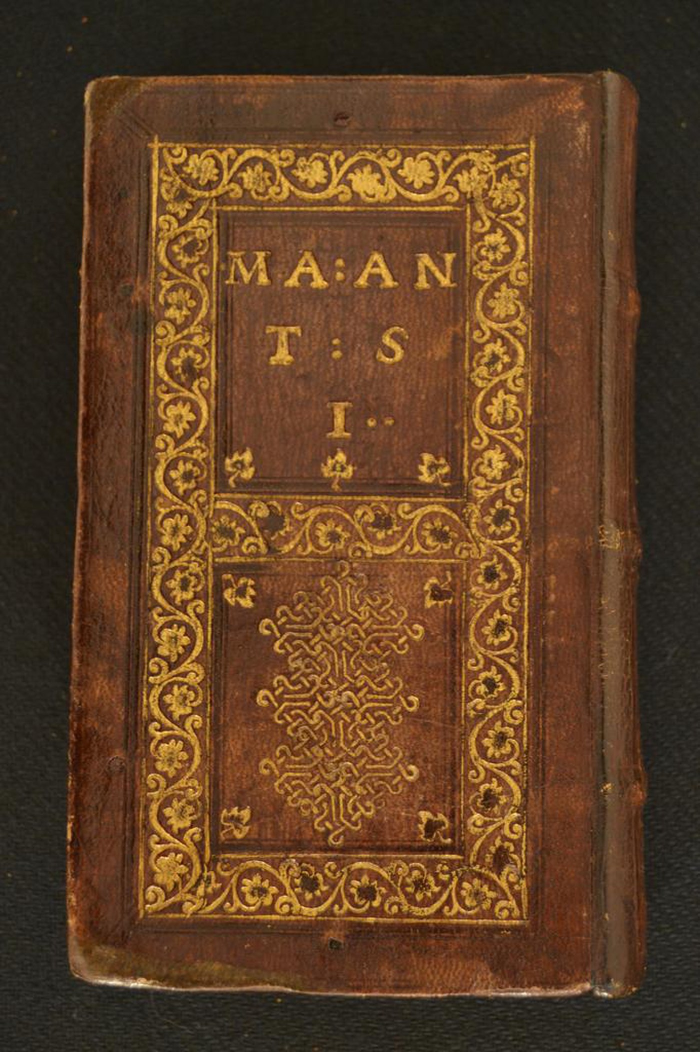 Cuoio di capra marrone su quadranti in cartone decorato in oro. Filetti concentrici. Cornice caratterizzata da viticci. Foglia d’edera negli angoli interni dello specchio a delimitare tre mazzi di nodi disposti verticalmente. Al piatto anteriore in testa, il nome dell’autore, a fronte delle iniziali di un nome (MA:AN/T:S/I) in caratteri capitali a quello posteriore. Tracce di quattro lacci. Scompartimenti provvisti di filetti incrociati. Capitelli, indorsatura, rimbocchi e carte di guardia rinnovati. Cucitura su tre nervi. Tagli dorati incisi. Stato di conservazione: discreto. Materiale di copertura originale in parte scomparso. Angoli ricurvi. Volume restaurato.