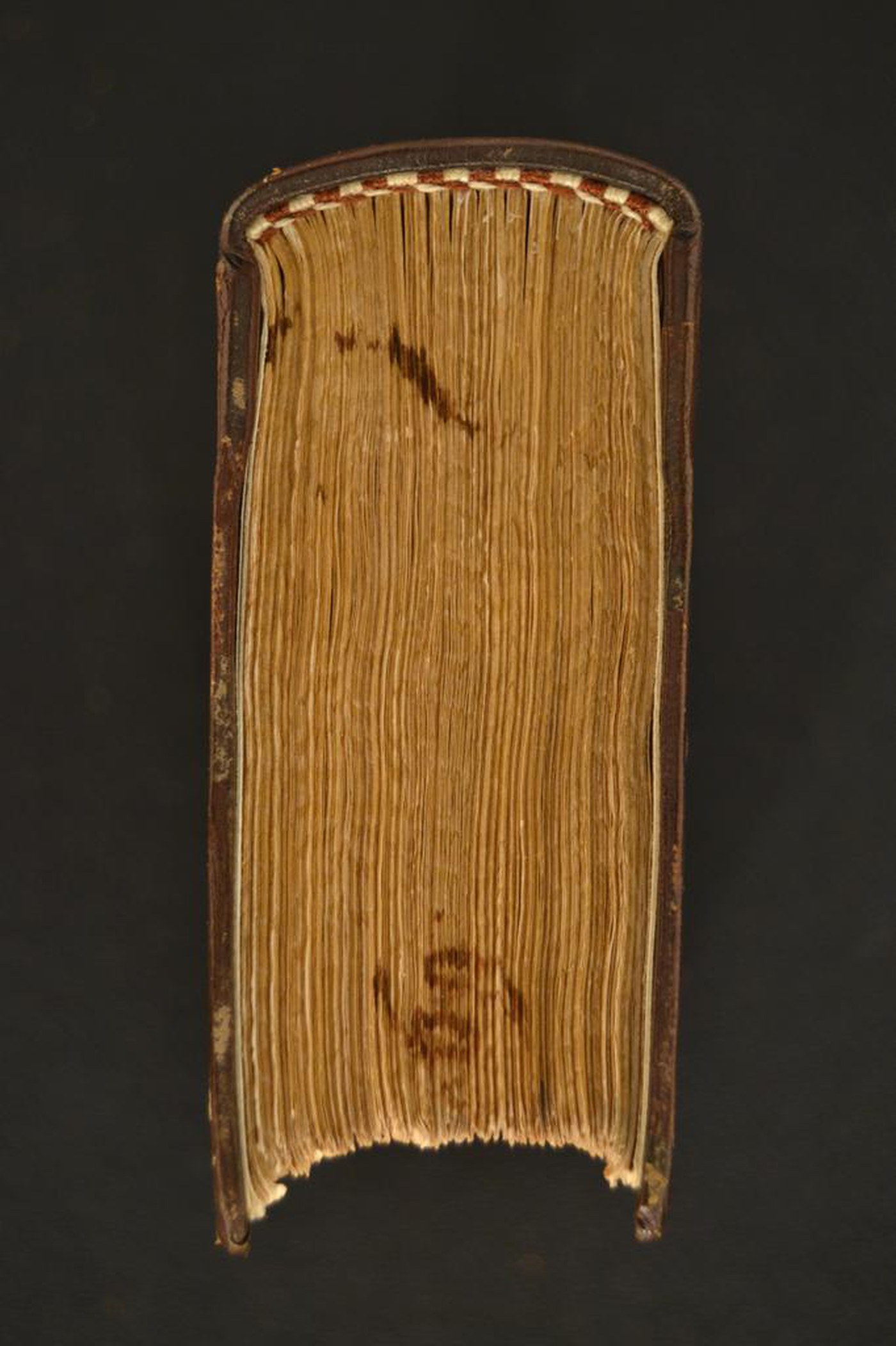 I viticci e le note tipografiche consentono di assegnare la legatura pubblicata, al secondo quarto del XVI secolo, eseguita a Bologna. In evidenza i tagli dorati incisi.
