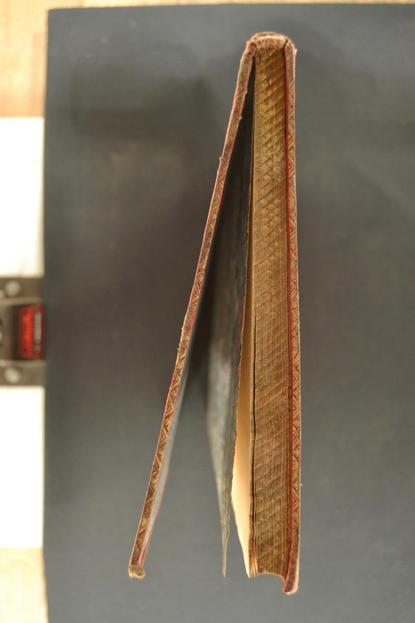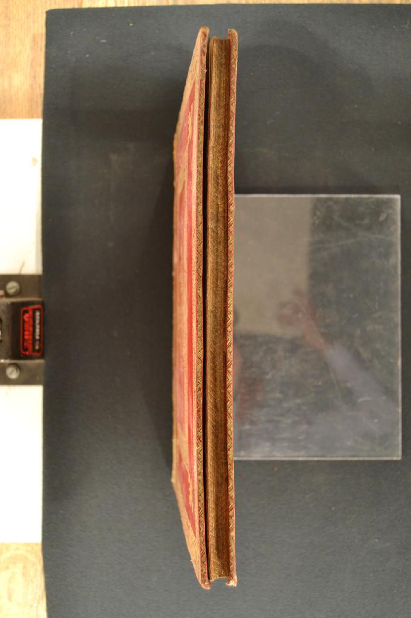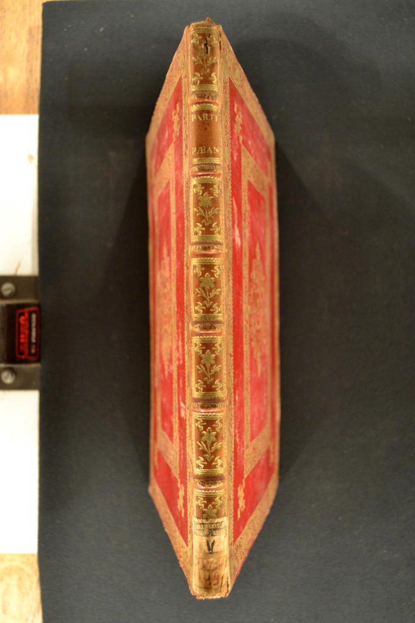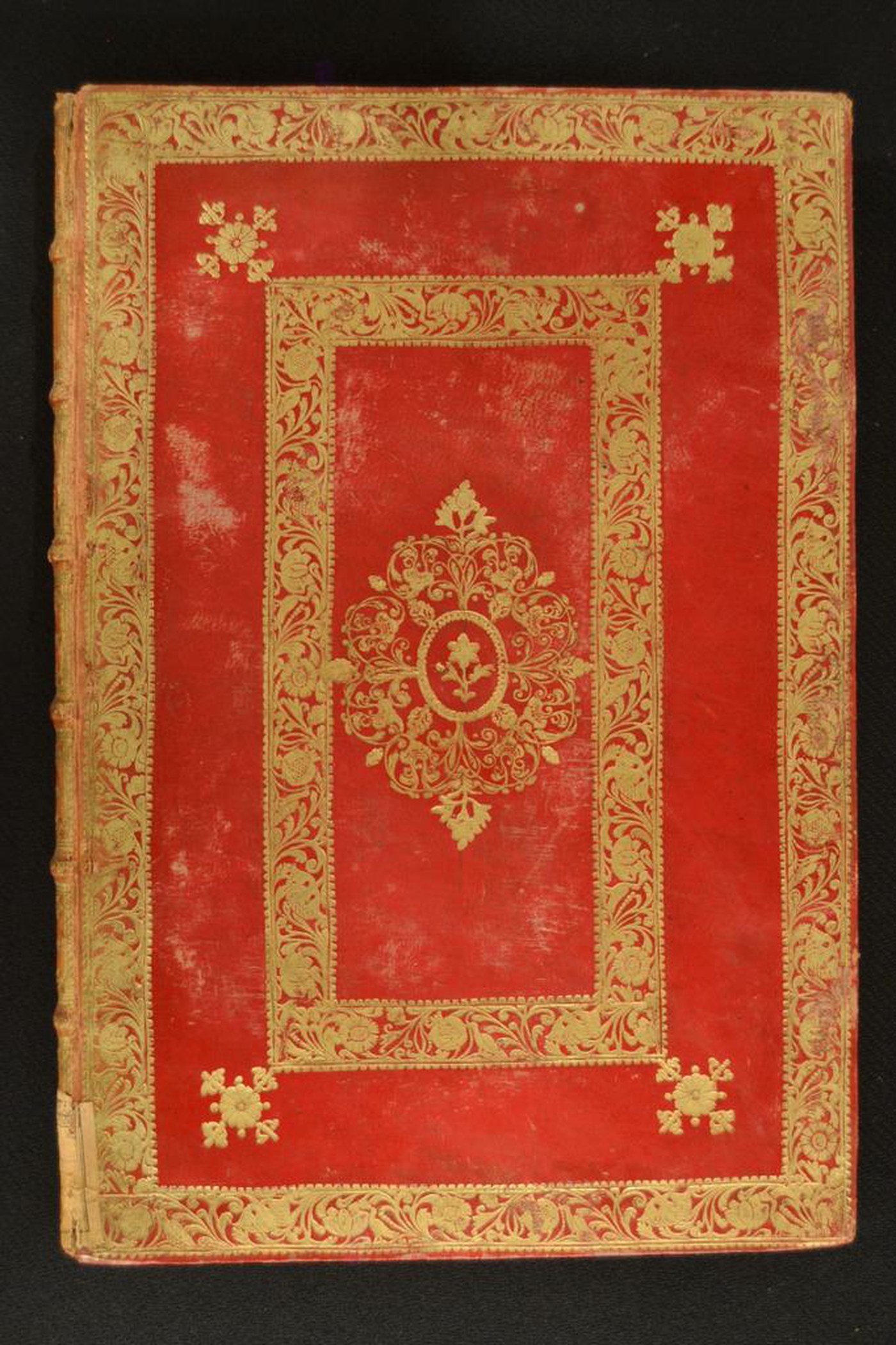 Cuoio di capra rosso su quadranti decorato in oro. Coppia di cornici concentriche caratterizzate da fogliami, fiorami, uccelli a piena figura di profilo destro e sinistro. Rosetta entro quattro fregi stilizzati negli angoli esterni del riquadro interno. Fiorame entro ovale nella cartella fitoromorfa centrale, motivo ripreso negli scompartimenti del dorso tranne nel secondo in cui campeggia il titolo dell’opera. Capitelli muniti di anima circolare avvolta da fili in seta rosa e bianca. Cucitura su sei nervi rilevati. Indorsatura realizzata tramite alette orizzontali cartacee. Labbri ornati a pizzo. Rimbocchi discretamente rifilati. Carte di guardia marmorizzate policrome del genere caillouté e bianche. Tagli dorati brillanti. Stato di conservazione: discreto. Spellature al materiale di copertura.