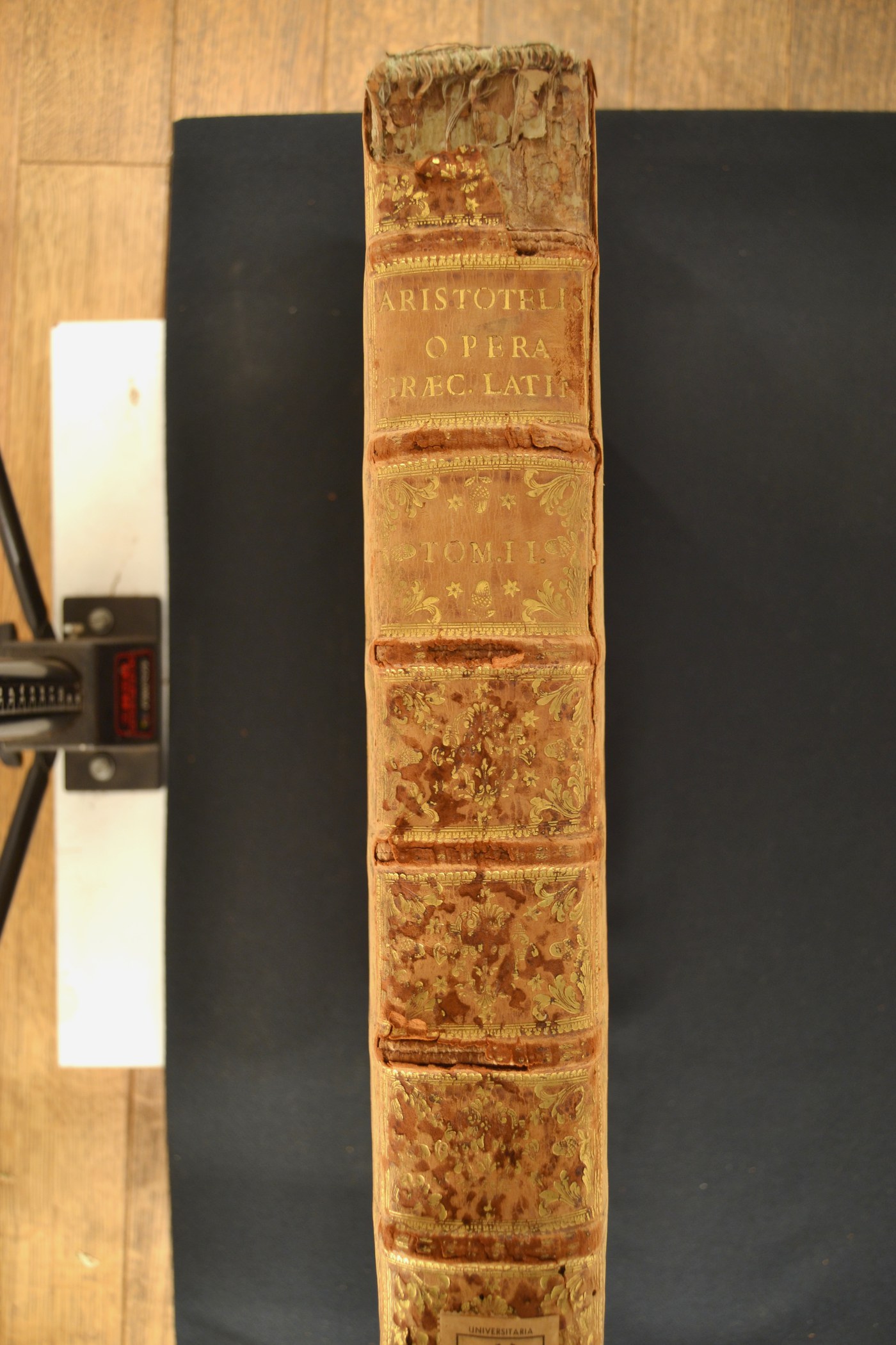 Aristotelis Operum tomus secundus. In quo libri ethicorum ad Nichomacum, decem; maiorum moralium, duo; eudemiorum, septem; de virtutibus, vnus; ... Graecè et Latinè continentur: quorum interpretes sequens pagina exhibebit. Accessit synopseōs analyticae uniuersae doctrinae peripateticae pars altera, ... Item notae & argumenta ad libros omnes metaphysicorum; cum serië nouâ quatuor postremorum. Authore Guillelmo Du-Vallio Pontizarano, ... Adiecti sunt ad tomi calcem indices tres nouissimè aucti & locupletati, Lutetiae Parisiorum : typis regijs, 1619, 403x269x65 mm.