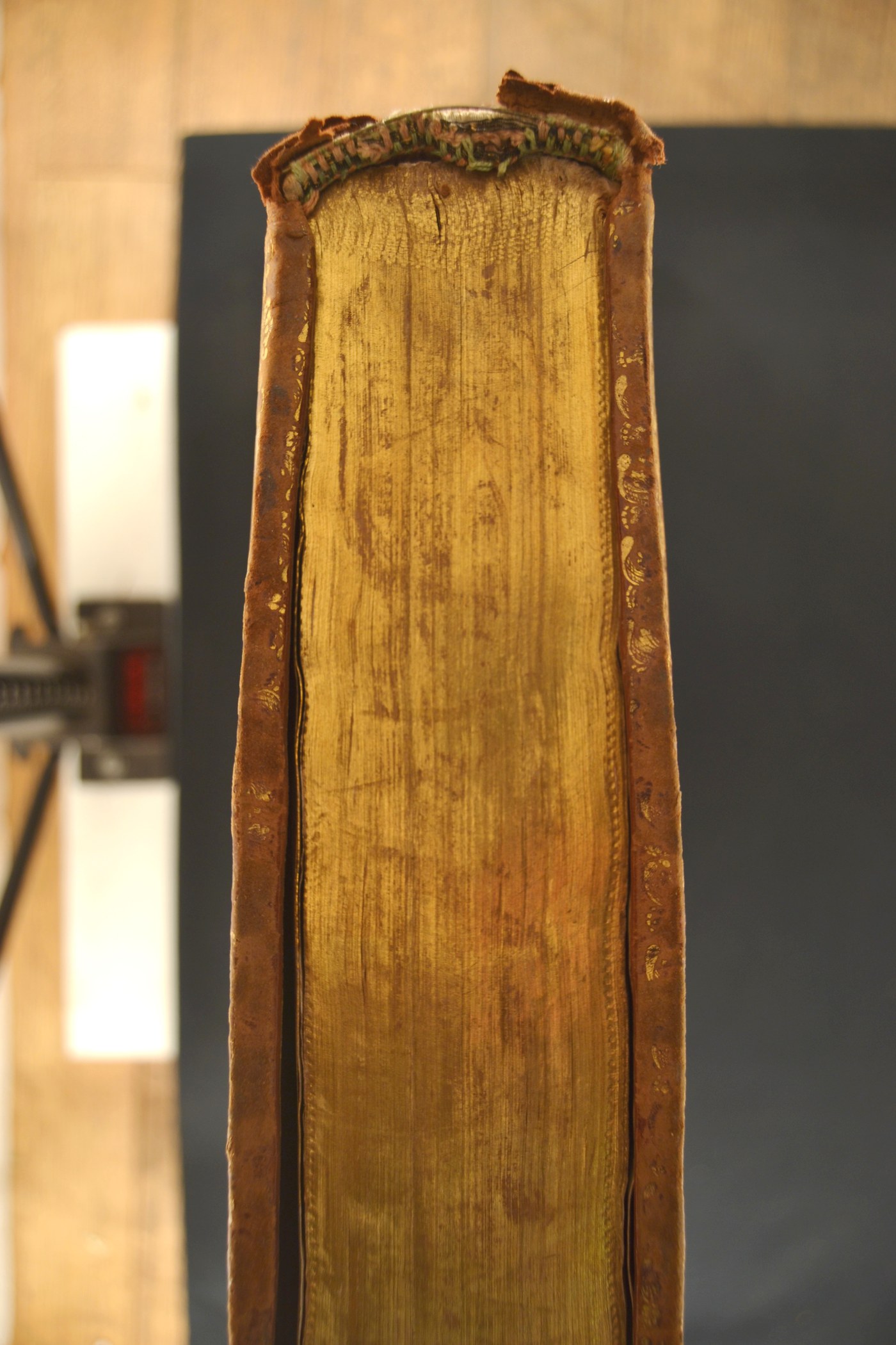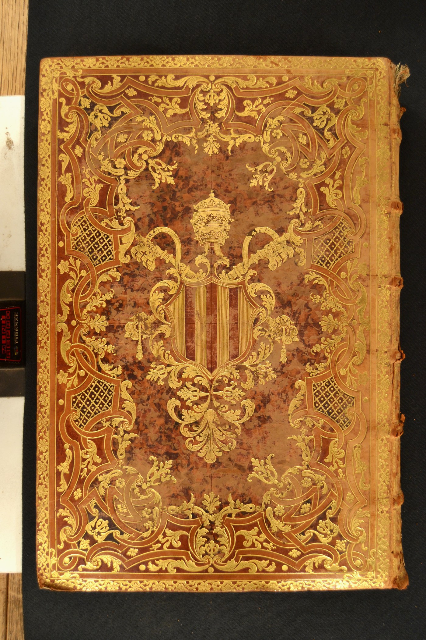 Cuoio di vitello marmorizzato marrone su quadranti in cartone decorato in oro e in pasta bruna. Coppia di cornici caratterizzate da palmette entro nastri incrociati. Margini interni dello specchio provvisti di fronde, cerchielli pieni, nastri incrociati, tralicci, ampie corolle trilobate. Armi (142x127 mm) riferibili al pontefice Benedetto XIV (1740-1758). Scompartimenti del dorso riquadrati. Nel secondo e terzo, il titolo dell’opera e la partizione del volume; due volute fogliate negli angoli interni e fregio fitomorfo centrale in quelli residui. Capitelli muniti di anima circolare avvolta da fili in lino blu e azzurro. Cucitura su sei nervi rilevati. Indorsatura realizzata tramite aletta cartacea in forma di trapezio. Labbri ornati con fogliami. Rimbocchi rifilati senza particolare cura. Carte di guardia marmorizzate policrome pettinate e bianche. Tagli dorati brillanti incisi. Stato di conservazione: mediocre. Diffuse spellature al materiale di copertura dalla tonalità scolorita lungo il dorso ivi parzialmente scomparso in testa. Piatto anteriore avulso dal blocco. Supporti convessi. Angoli di piede sbrecciati.