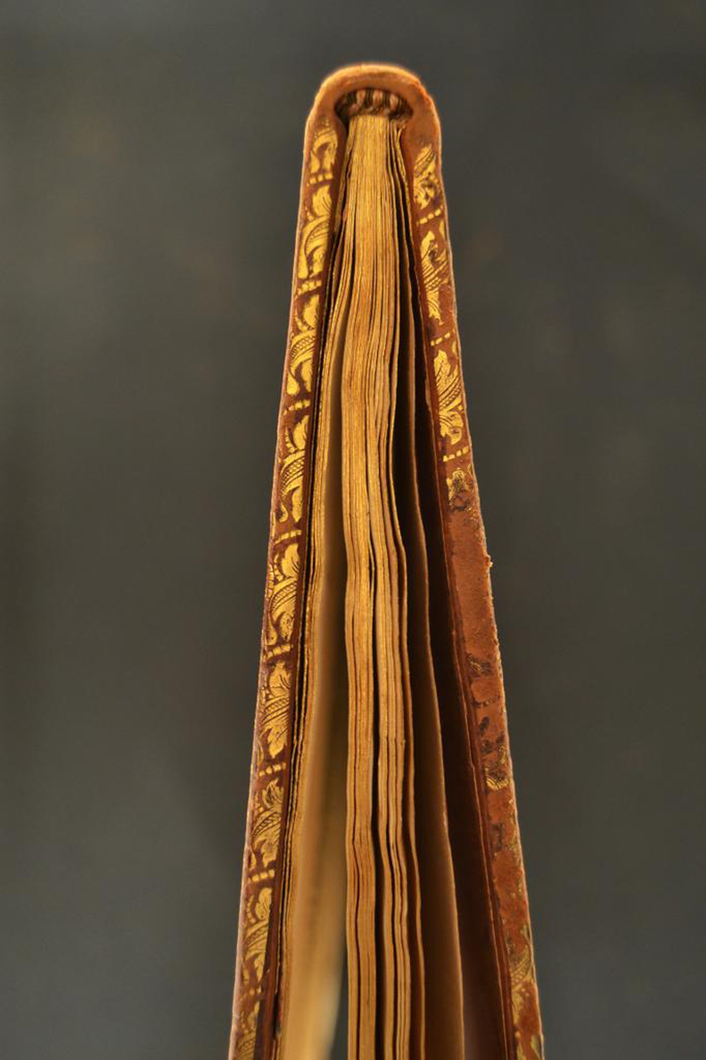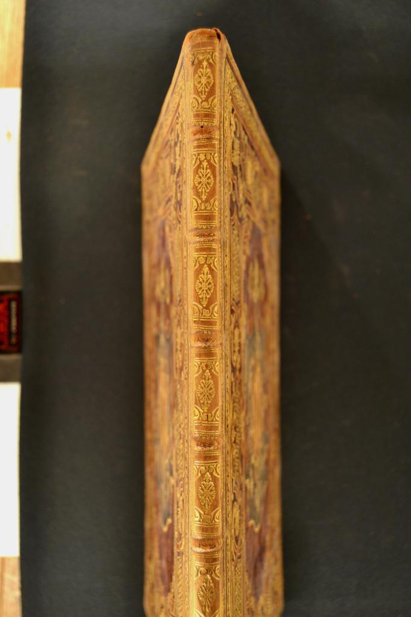 I fregi, le carte sbruffate e le note tipografiche consentono di assegnare la legatura al secondo quarto del XVIII secolo, eseguita a Roma. In evidenza i tagli dorati brillanti e la tavola calcografica.