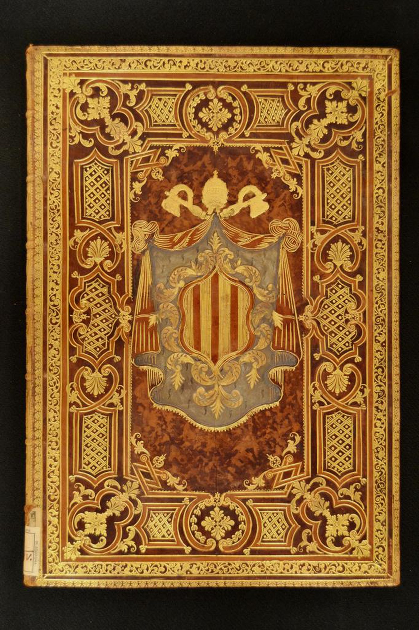 Cuoio di vitello marmorizzato marrone su quadranti in cartone decorato in oro e in pasta azzurra. Cornici concentriche caratterizzate da minuti fogliami svasati, volute fogliate, nastri incrociati, palmette, tralicci. Margini interni dello specchio provvisti di coppie di filetti incrociati, fronde, motivi stilizzati. Armi (187x125 mm) riferibili al pontefice Benedetto XIV (1740-1758). Scompartimenti del dorso riquadrati; fogliame negli angoli interni e fregio fitomorfo entro sfondo losangato centrale in quelli residui. Capitelli muniti di anima circolare avvolta da fili in canapa e fili dorati. Cucitura su sette nervi rilevati. Indorsatura realizzata tramite alette orizzontali cartacee. Labbri ornati con fogliami mossi alternati ad archi filigranati. Rimbocchi rifilati senza particolare cura. Contropiatti rivestiti da foglio in carta sbruffata rosa. Carte di guardia bianche. Tagli dorati brillanti. Stato di conservazione: discreto. Materiale di copertura dalla tonalità scolorita.