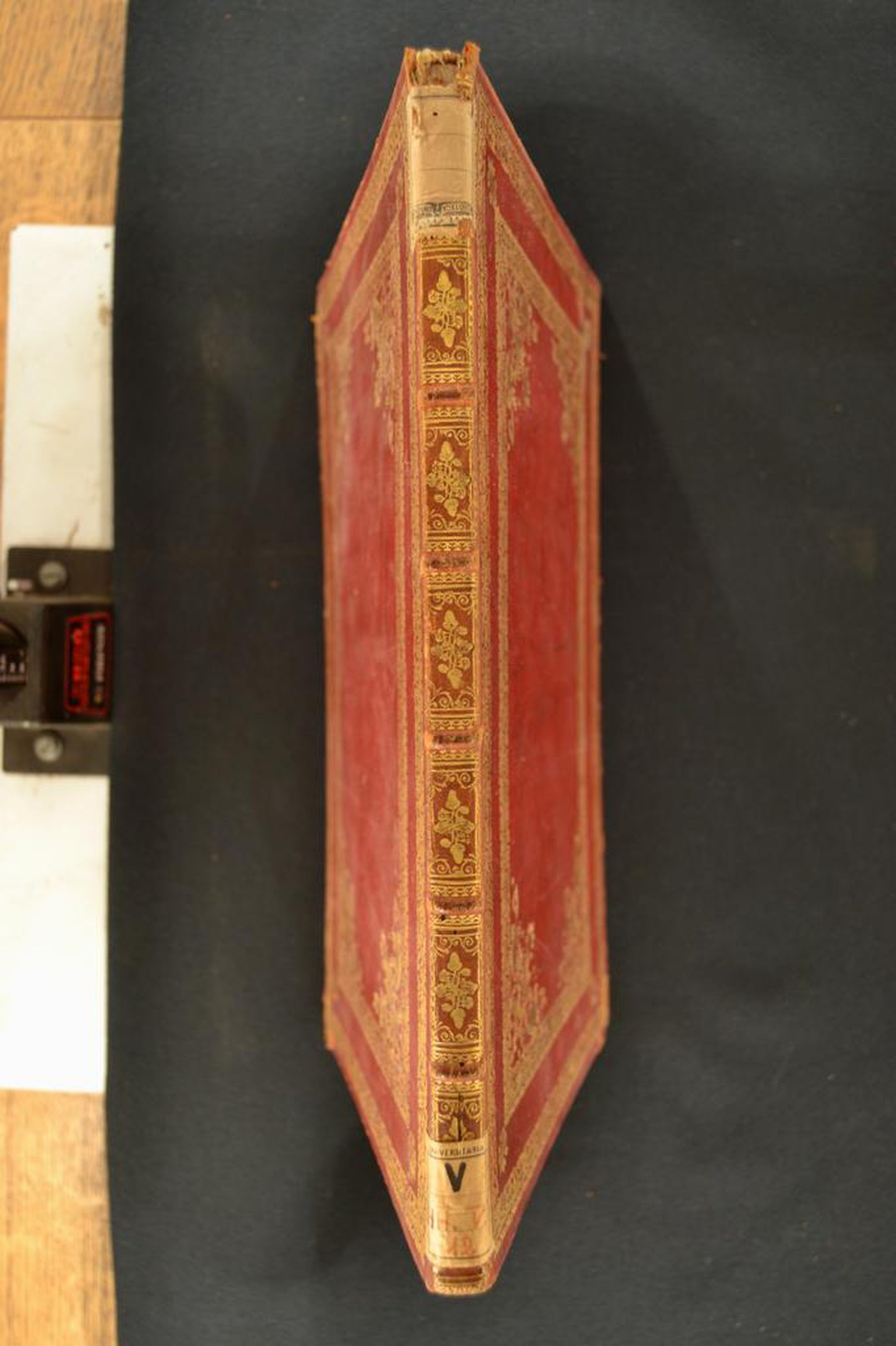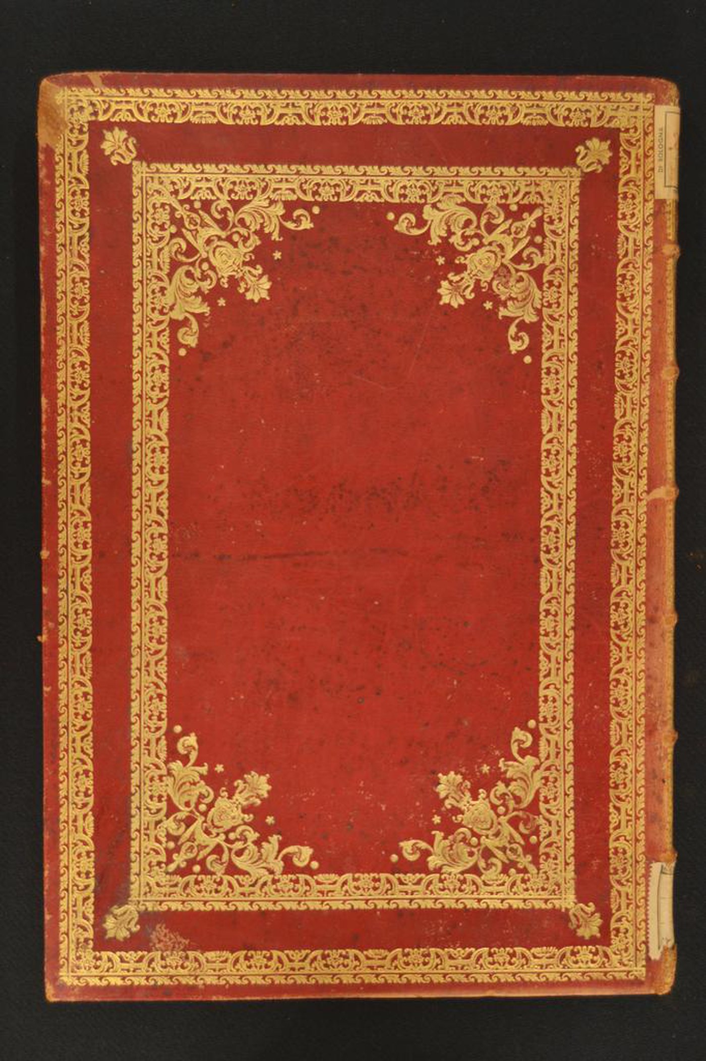 Cuoio di capra rosso su quadranti in cartone decorato in oro. Cornice caratterizzata da minuti fogliami mossi e corolle stilizzate entro nastri; testina classica e veronica entro corolla stilizzata, fronde mosse, minuti cerchielli e stelle a cinque punte. Scompartimenti del dorso riquadrati; coppia di volute negli angoli interni e di ghiande fogliate. Capitelli muniti di anima circolare avvolta da fili in canapa. Cucitura su sei nervi rilevati. Indorsatura realizzata tramite alette orizzontali cartacee. Labbri ornati con fogliami. Rimbocchi rifilati senza particolare cura. Carte di guardia goffrate bianche entro sfondo dorato oggi parzialmente ossidate, a raffigurare fogliami, fiorami, grappoli d’uva, e bianche. Tagli dorati brillanti. Stato di conservazione: discreto. Bruniture e spellature al materiale di copertura parzialmente scomparso in testa al dorso. Angoli di testa ricurvi.