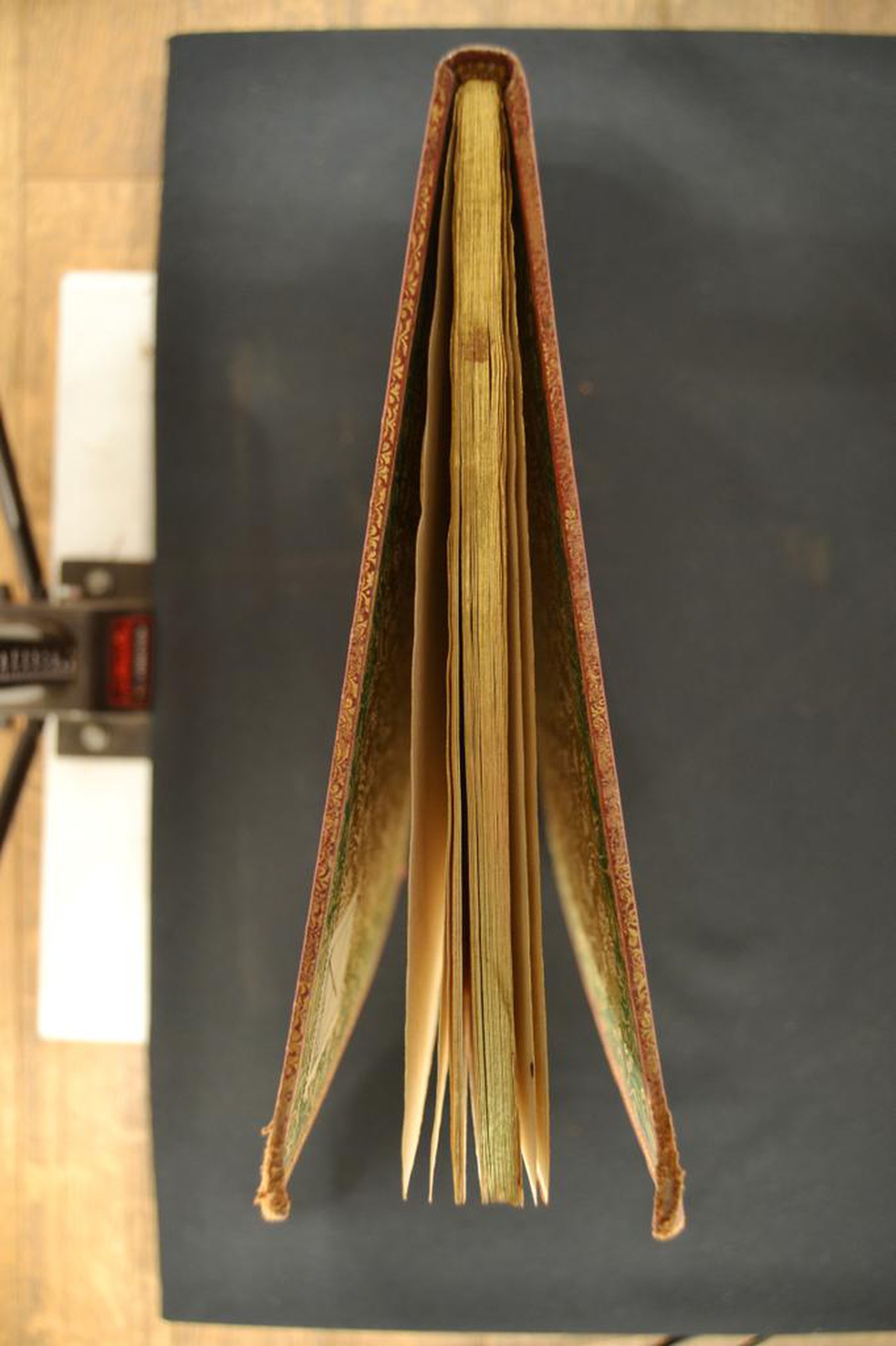 I fregi e le note tipografiche consentono di attribuire la legatura alla metà del XVIII secolo, eseguita a Firenze da Giuseppe Maria Pagani attivo dal 1735 al 1788 del quale questa Istituzione custodisce diversi esemplari. In evidenza le carte di guardia goffrate realizzate tramite impressione di matrice calcografica impressa a caldo su foglia dorata precedentemente applicata alla carta bianca e i tagli dorati brillanti.