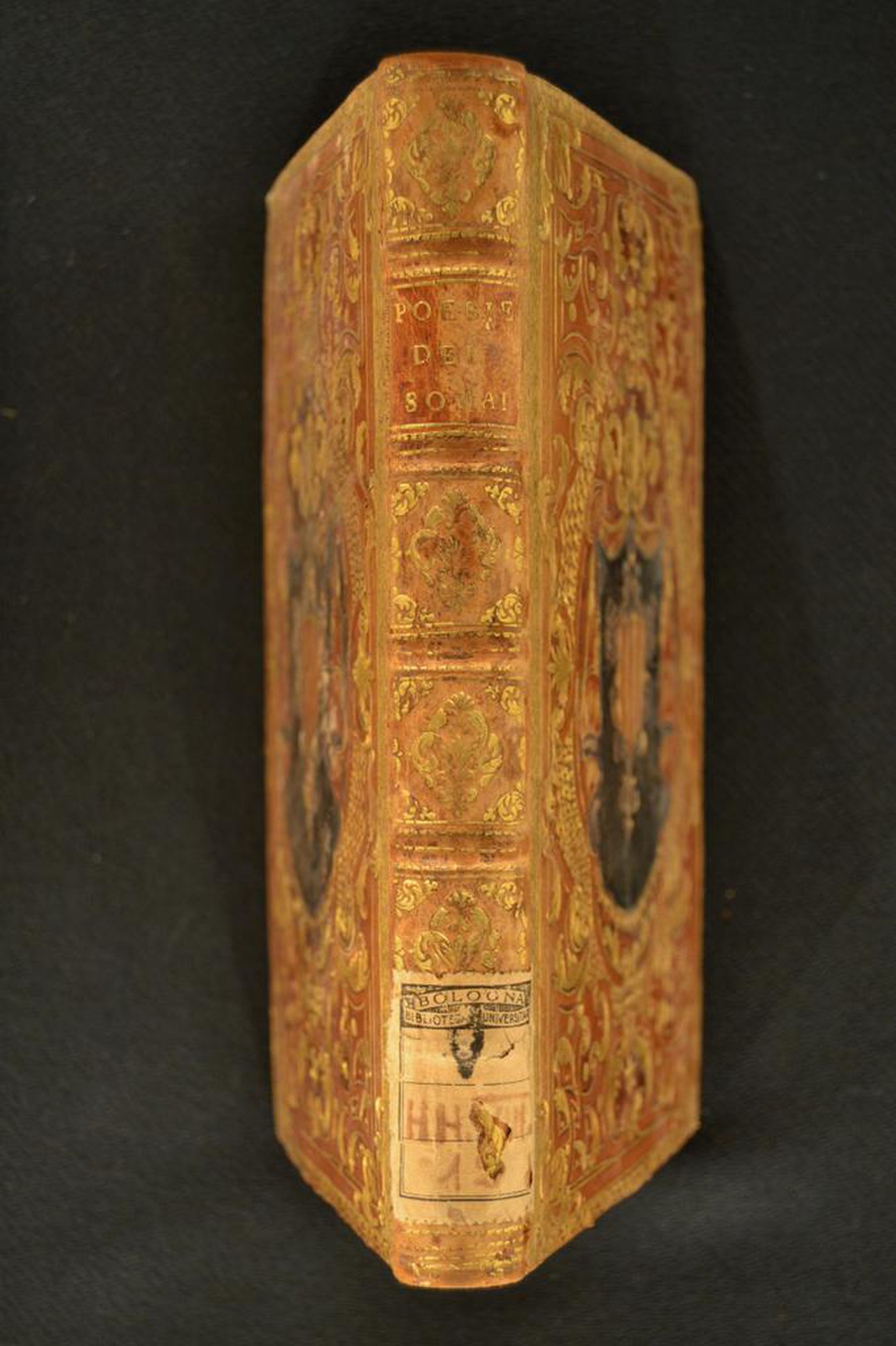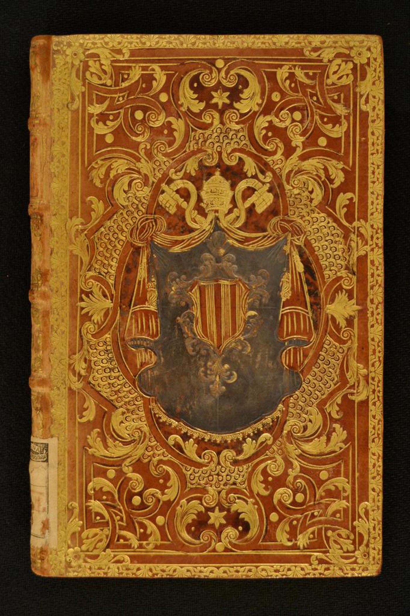 Cuoio di vitello marrone su quadranti in cartone decorato in oro e a colore. Cornice caratterizzata da palmette alternate a motivi cuoriformi. Margini interni dello specchio provvisti di fronde mosse, cerchielli pieni, stelle a sei punte, nastri intrecciati a filetti spezzati, squame di pesce, Armi drappeggiate (70x75 mm) rilevate in pasta nera, riferibili al pontefice Benedetto XIV (1740-1758). Scompartimenti del dorso riquadrati. Nel secondo, il titolo dell’opera e il cognome dell’autore entro il tassello in corame rosso; voluta fogliata negli angoli interni e fregio fitomorfo centrale in quelli residui. Capitelli muniti di anima circolare avvolta da fili in lino blu, seta rosa e dorati. Cucitura su cinque nervi rilevati. Indorsatura realizzata tramite alette orizzontali cartacee. Labbri ornati con fogliami. Rimbocchi rifilati senza particolare cura. Carte di guardia sbruffate rosa e bianche. Tagli dorati brillanti incisi. Stato di conservazione: discreto. Materiale di copertura dalla tonalità scolorita lungo il dorso. Angoli ricurvi in parte sbrecciati.
