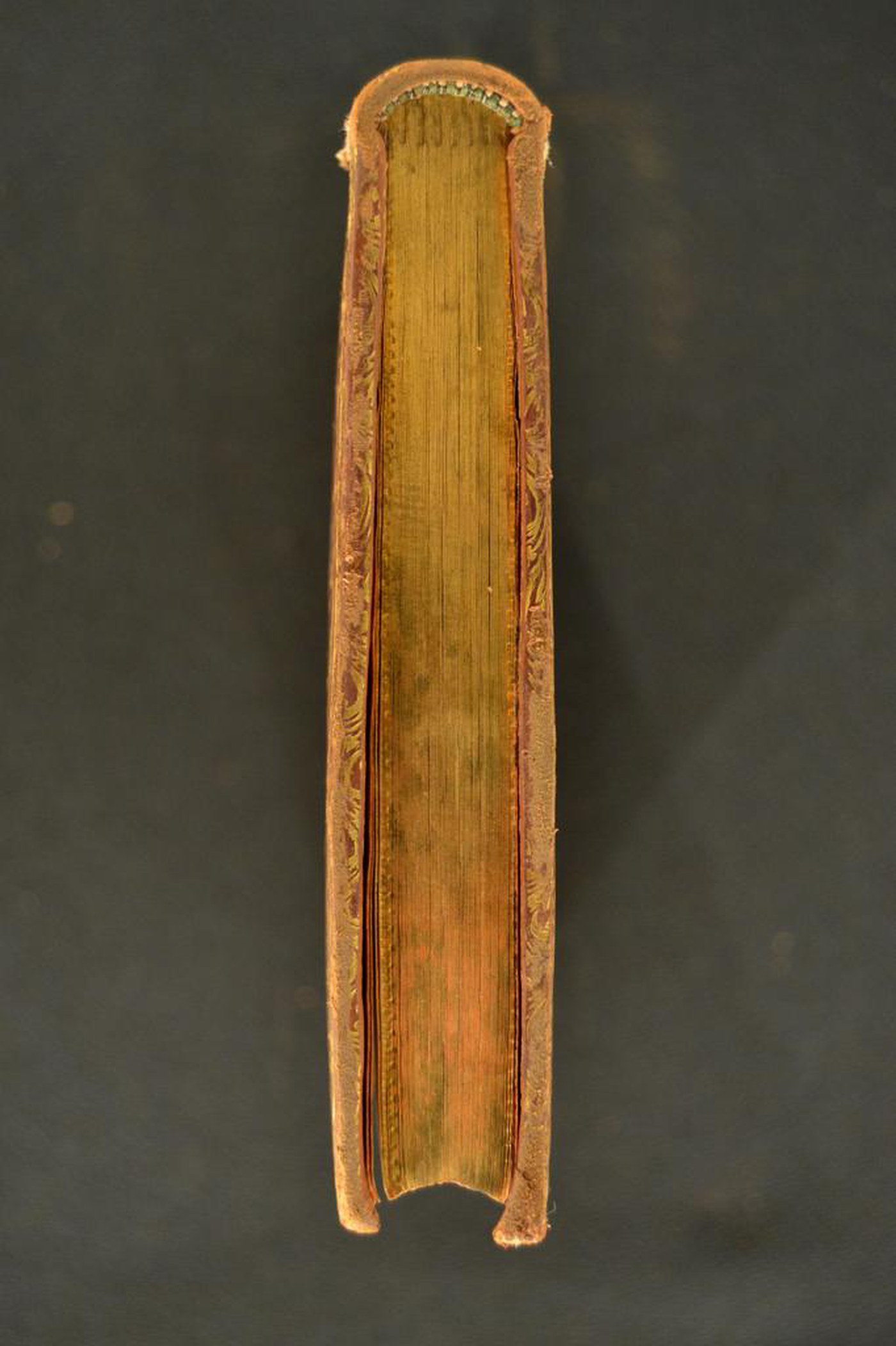 I fregi, le carte di guardia sbruffate e le note tipografiche consentono di assegnare la legatura al secondo quarto del XVIII secolo, eseguita a Roma. In evidenza i capitelli lavorati e i tagli dorati brillanti incisi.
