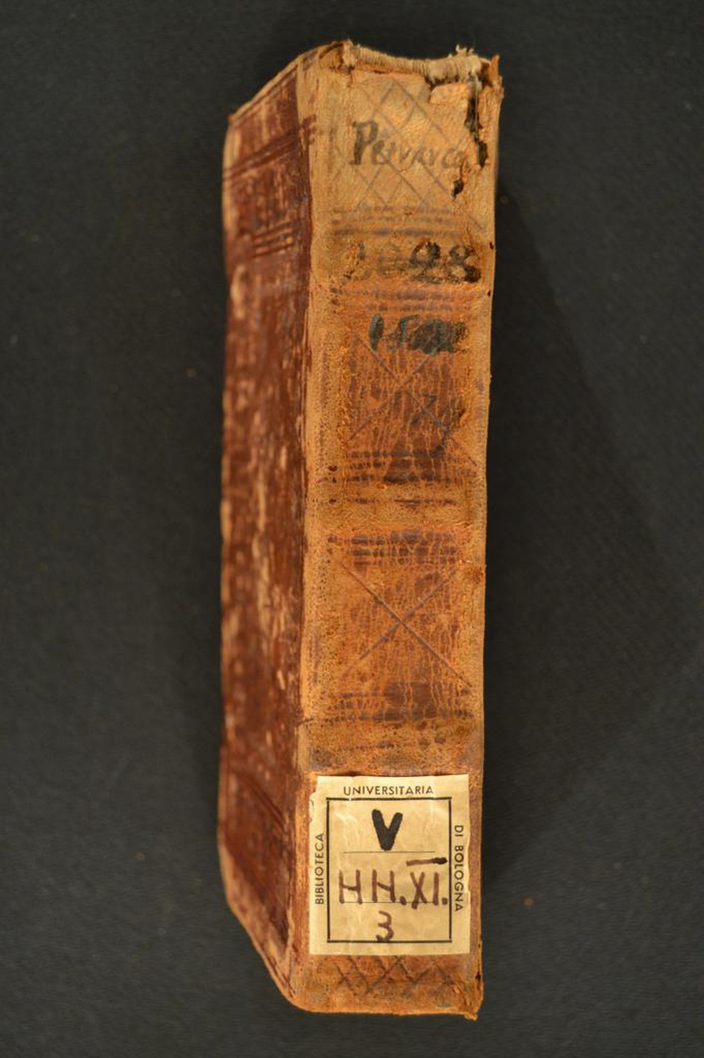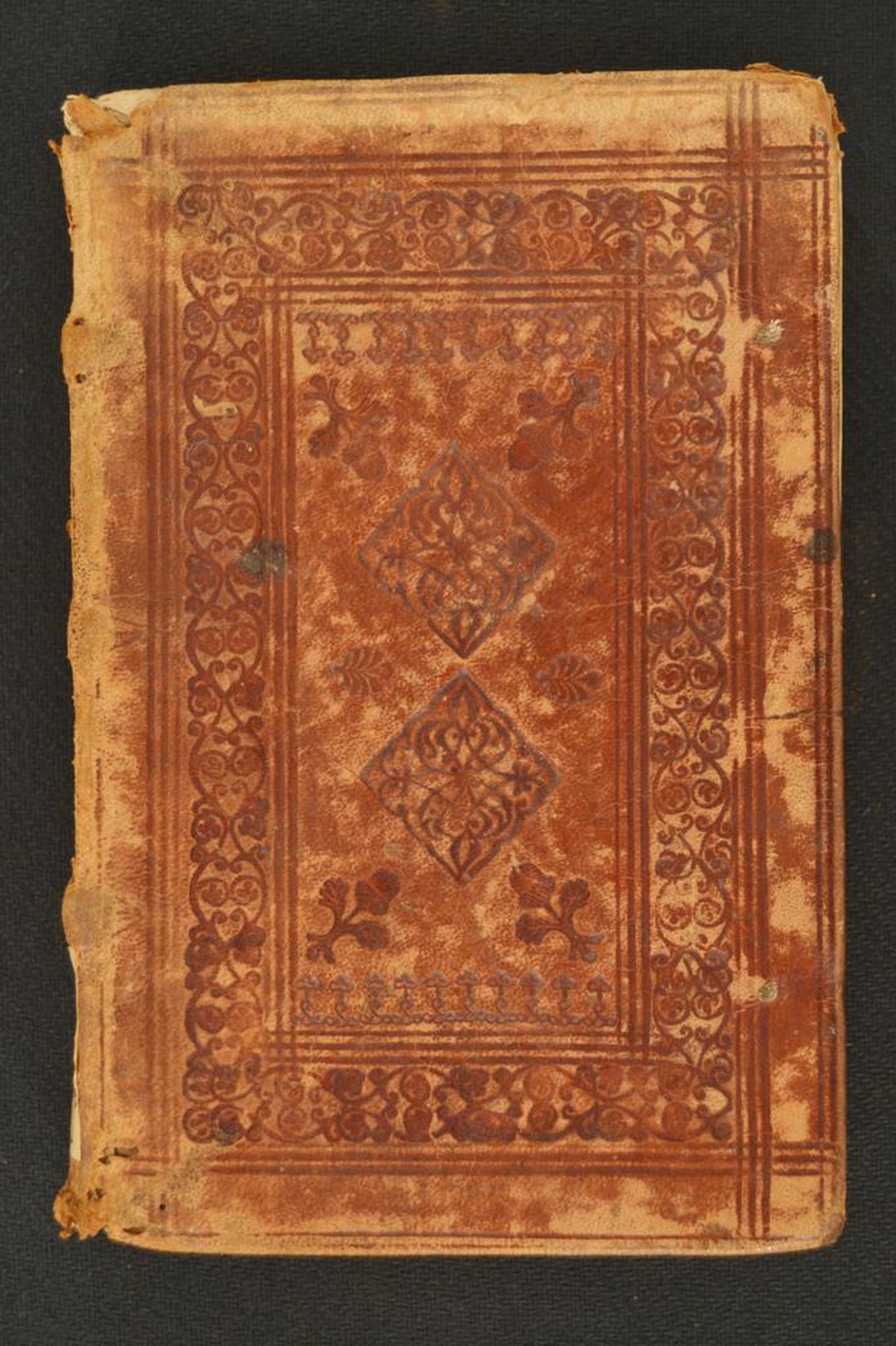 Cuoio di bazzana marrone su quadranti in cartone decorato a secco. Tre fasci di filetti concentrici. Cornice caratterizzata da motivi a meandri. Trifogli stilizzati in testa e al piede dello specchio, sormontati da due ghiande fogliate a delimitare la coppia di fregi mamelucchi centrali affiancati da un paio di palmette. Tracce di due coppie di lacci in tessuto. Scompartimenti del dorso ornati con filetti incrociati. Capitelli muniti di anima circolare avvolta da fili in canapa. Cucitura su tre nervi rilevati. Indorsatura realizzata tramite alette orizzontali cartacee. Rimbocchi rifilati senza particolare cura. Carte di guardia bianche. Tagli rustici; al piede il cognome dell’autore, il titolo dell’opera e il commentatore manoscritti. Stato di conservazione: discreto. Fiore in parte scomparso. Angoli ricurvi.