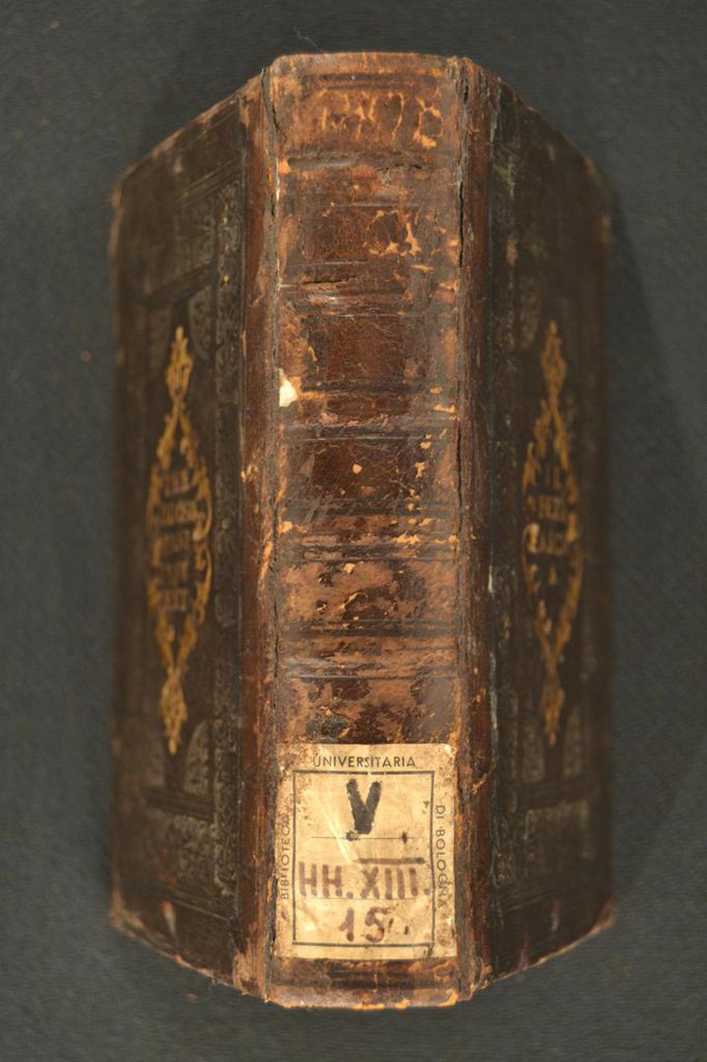 I fregi e le note tipografiche propongono di assegnare la legatura al secondo quarto del XVI secolo, eseguita a Bologna. In evidenza i tagli blu.