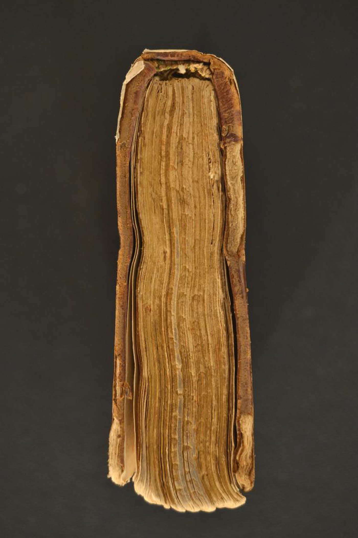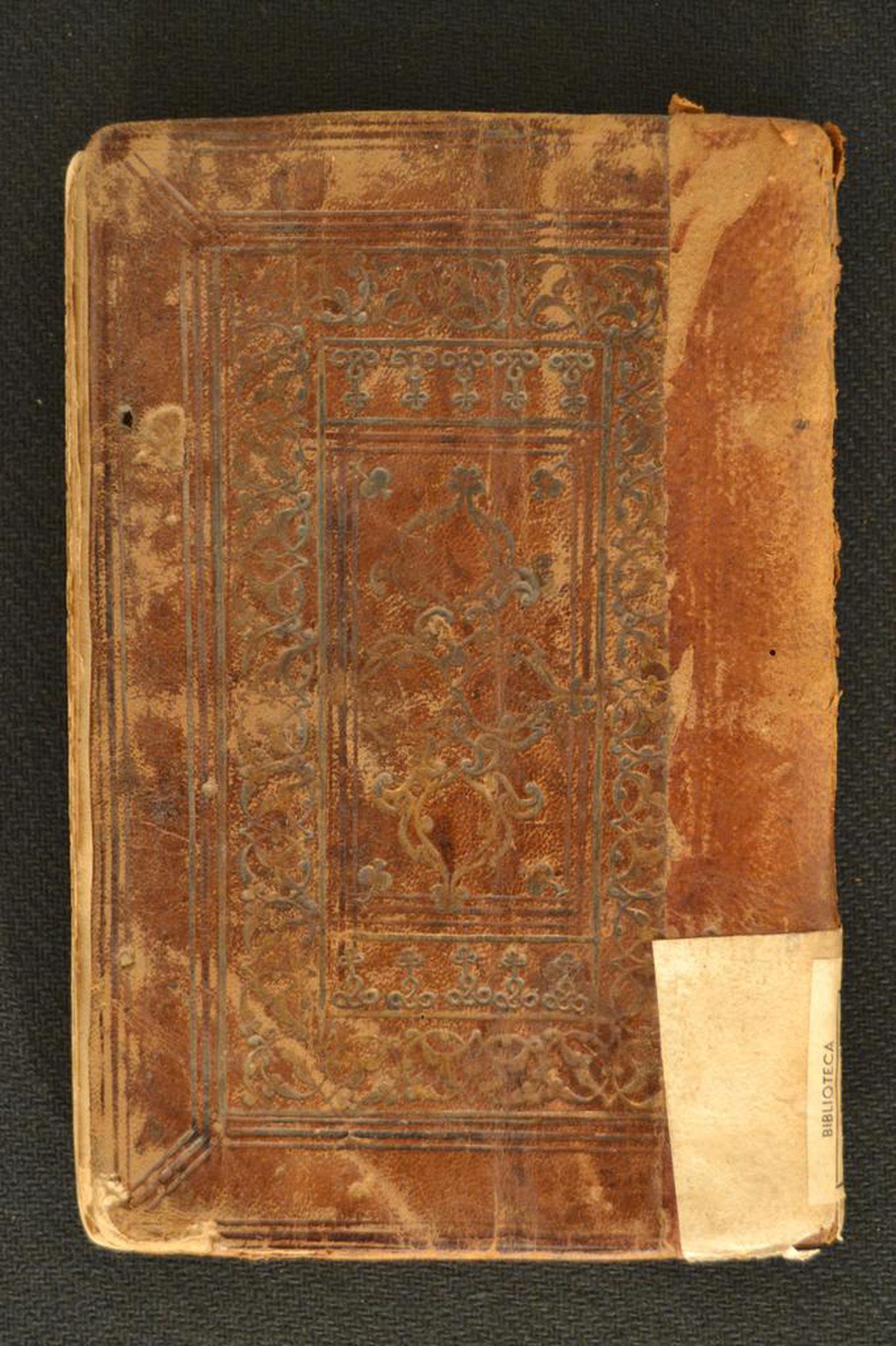 Cuoio di bazzana marrone su quadranti in cartone decorato a secco e in lega d’oro. Coppia di filetti concentrici collegati agli angoli. Cornice interna caratterizzata da arabeschi. Due rettangoli ornati con trifogli stilizzati a delimitare altrettante gemme addossate affiancate da stelo sormontato da melograno bilobato negli angoli interni dello specchio. Tracce di due coppie di lacci. Capitello scomparso in testa, in canapa, in lino rosa e blu al piede. Cucitura su tre nervi rilevati. Indorsatura non osservabile. Rimbocchi rifilati senza particolare cura. Carte di guardia bianche. Tagli rustici. Stato di conservazione: mediocre. Materiale di copertura originale scomparso; spellature ai piatti. Dorso rivestito da lembo in corame marrone. Supporti in vista. Volume restaurato.