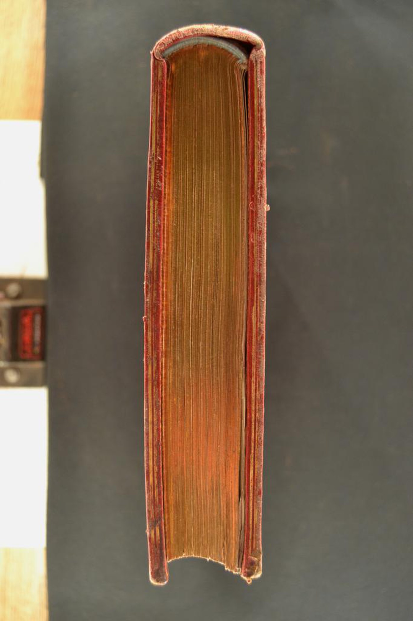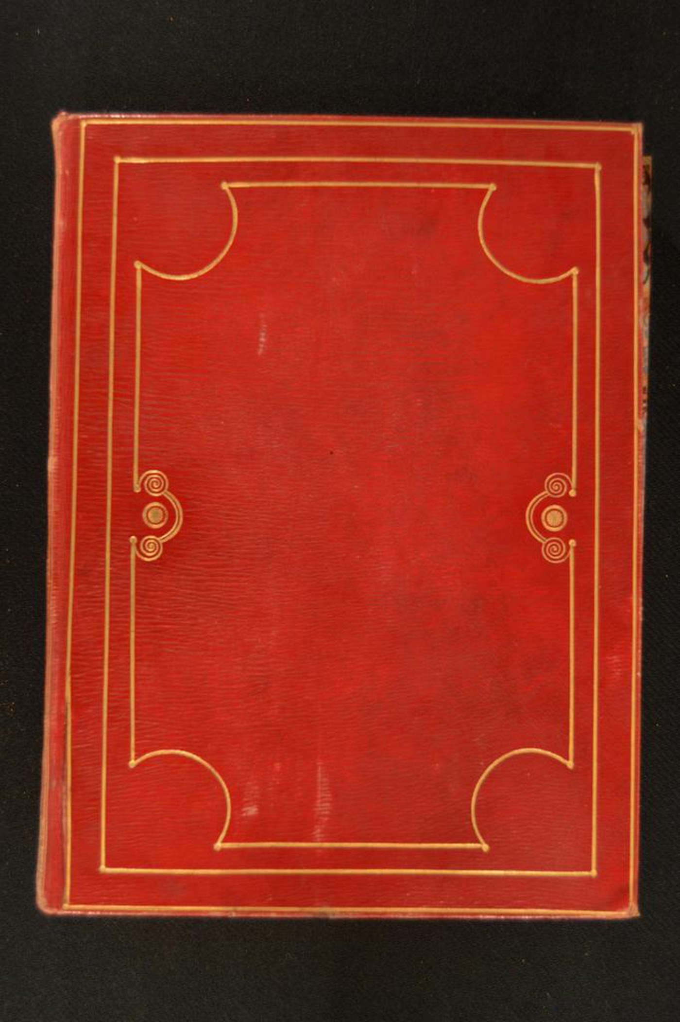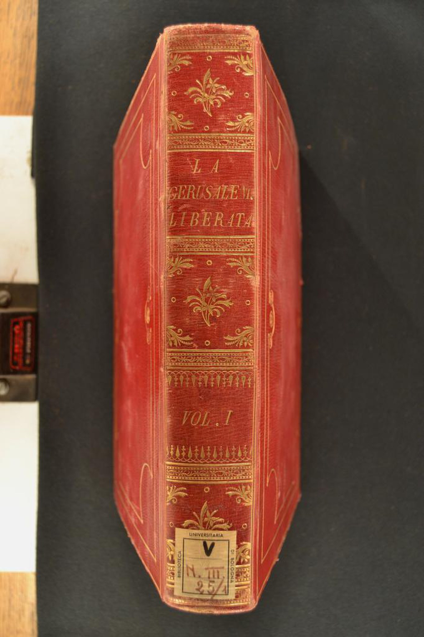 Cuoio rosso a grana lunga su quadranti in cartone decorato in oro. Copia di filetti concentrici. Ampia cartella caratterizzata da filetto arcuato negli angoli e nelle porzioni mediane laterali provviste di rosetta. Scompartimenti del dorso liscio delimitati da due bande orizzontali fiorite entro altrettante serie perlate. Nel secondo e quarto il titolo dell’opera e la partizione del volume; fogliame e fregio fitomorfo centrale in quelli residui. Capitelli munti di due anime in seta turchese. Cucitura su quattro nervi. Indorsatura realizzata tramite alette cartacee orizzontali. Labbri ornati con due filetti. Margini dei contropiatti provvisti di motivi stilizzati. Rimbocchi rifilati senza particolare cura. Carte di guardia marmorizzate policrome del genere caillouté e bianche. Tagli dorati brillanti. Stato di conservazione: mediocre. Bruniture e spellature al materiale di copertura. Piatto anteriore in fase di distacco.